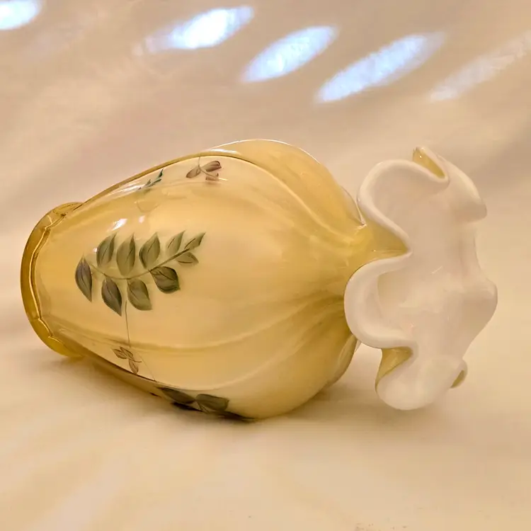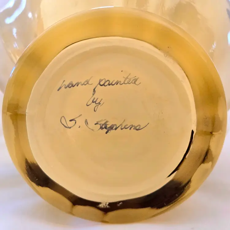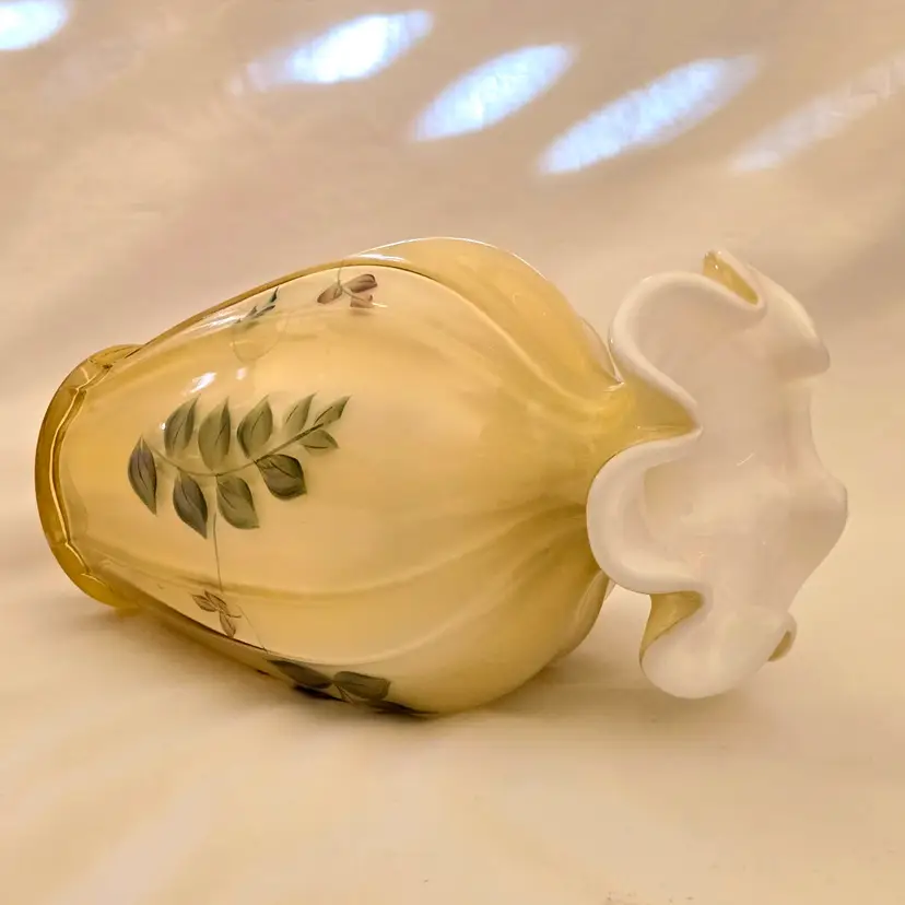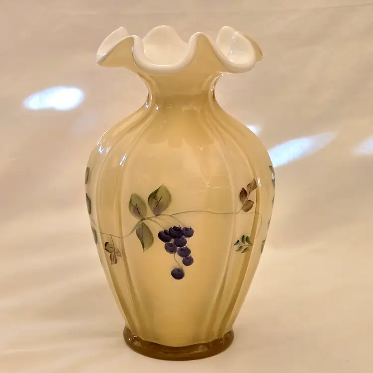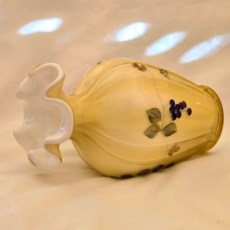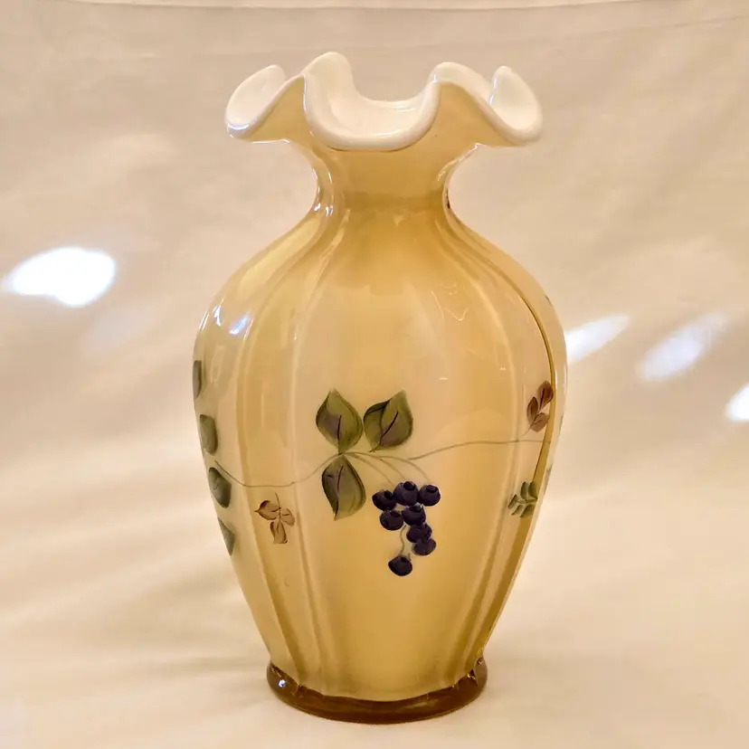 Art Glass Fenton Fluted Vase Honey Glass Cased Handpaint Signed S. Stephens 7” tall Vintage. Used condition with dust and dirt, stains. Please view all the photos and please ask any questions prior to purchase when possible.