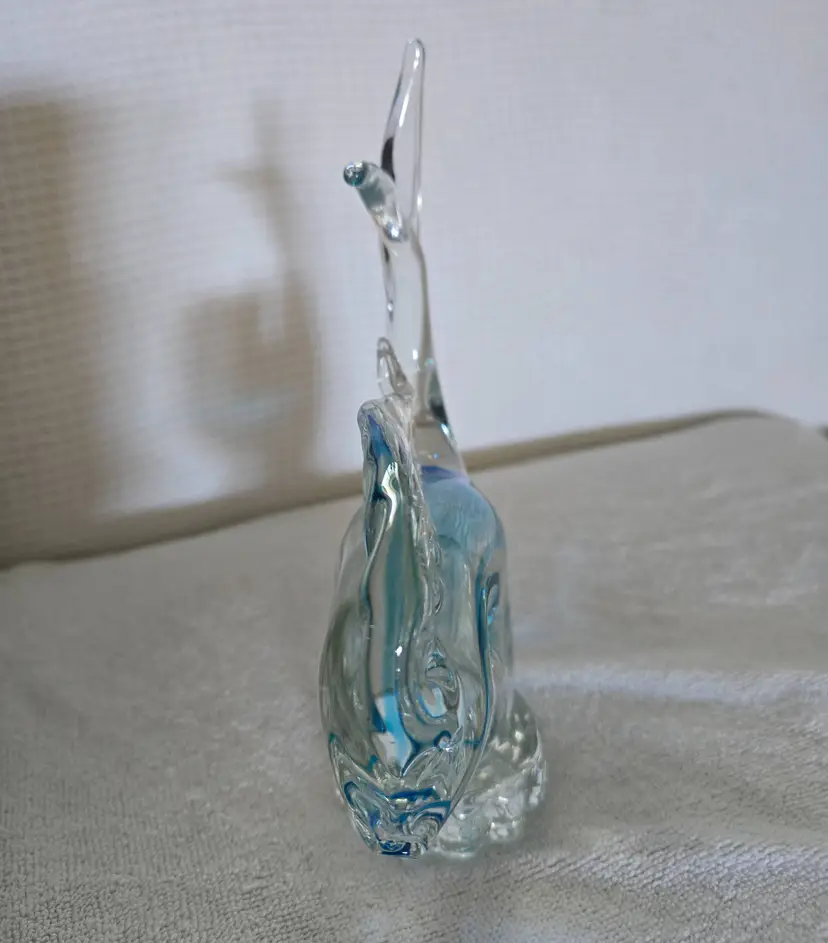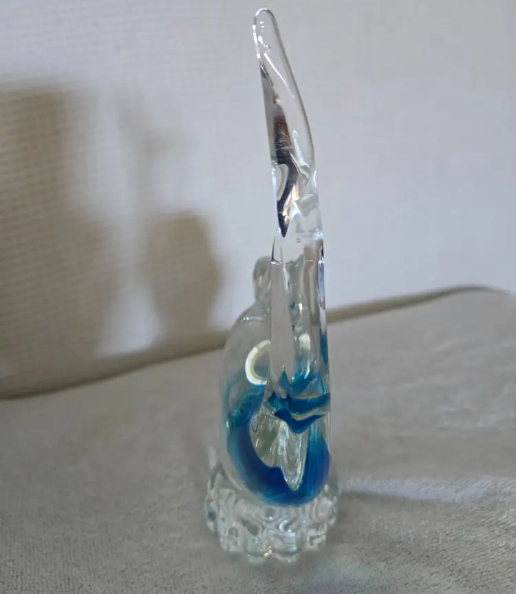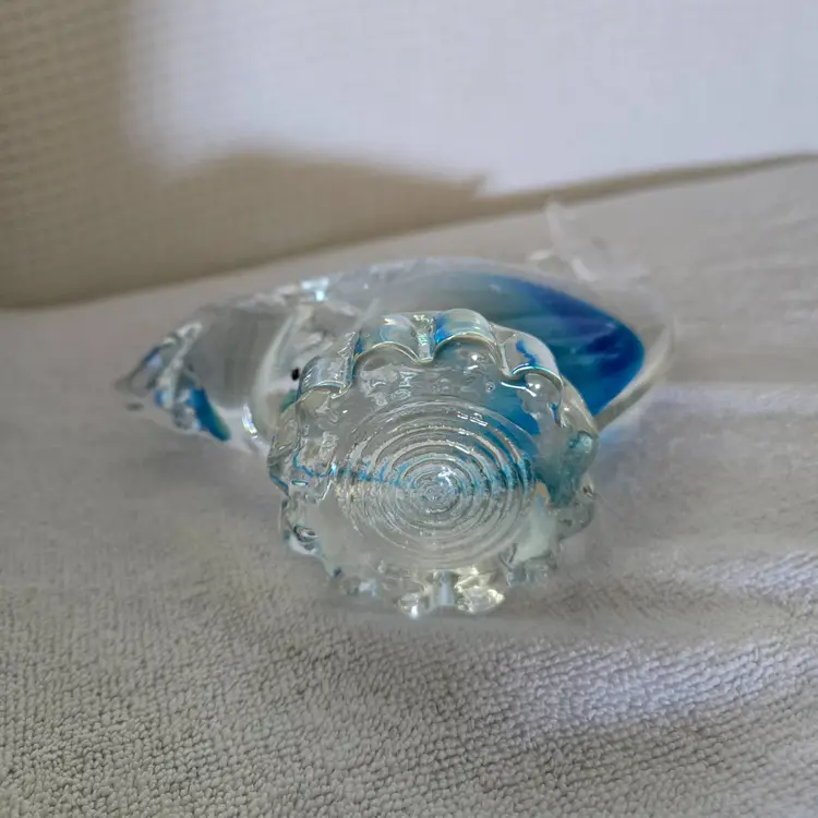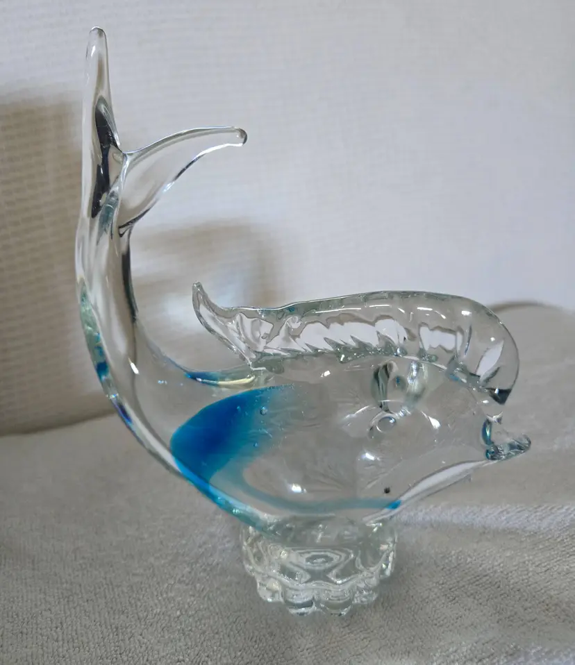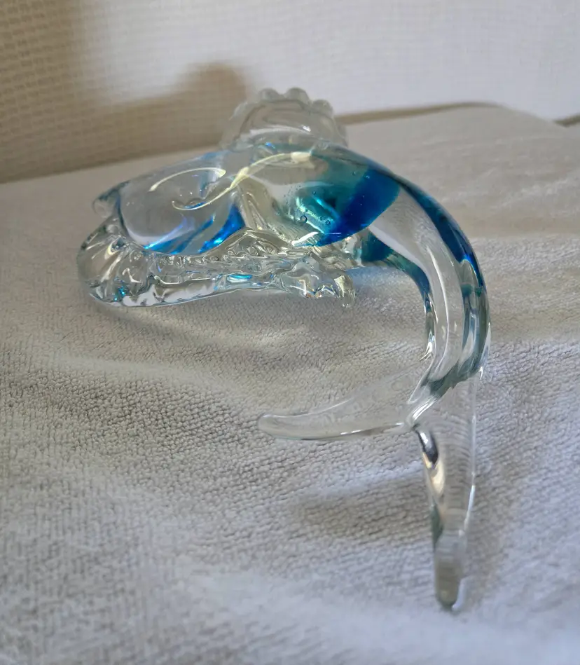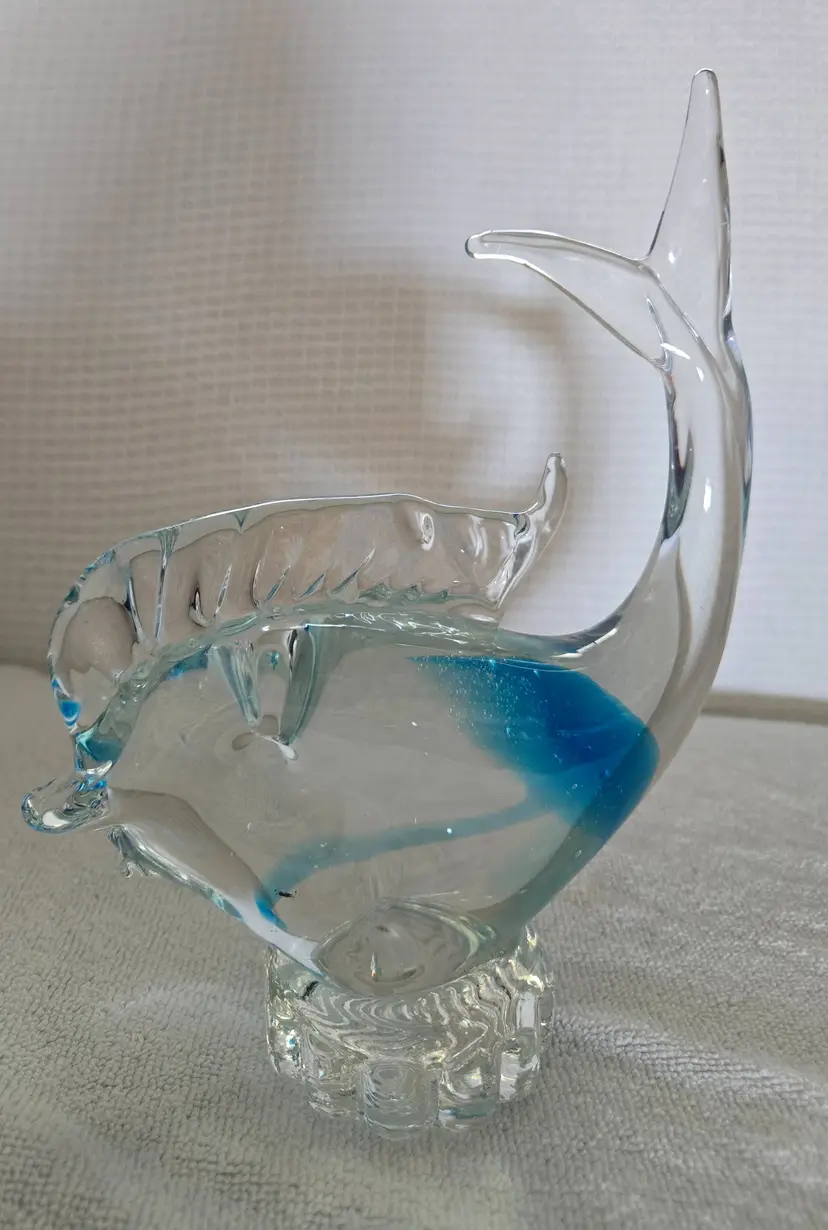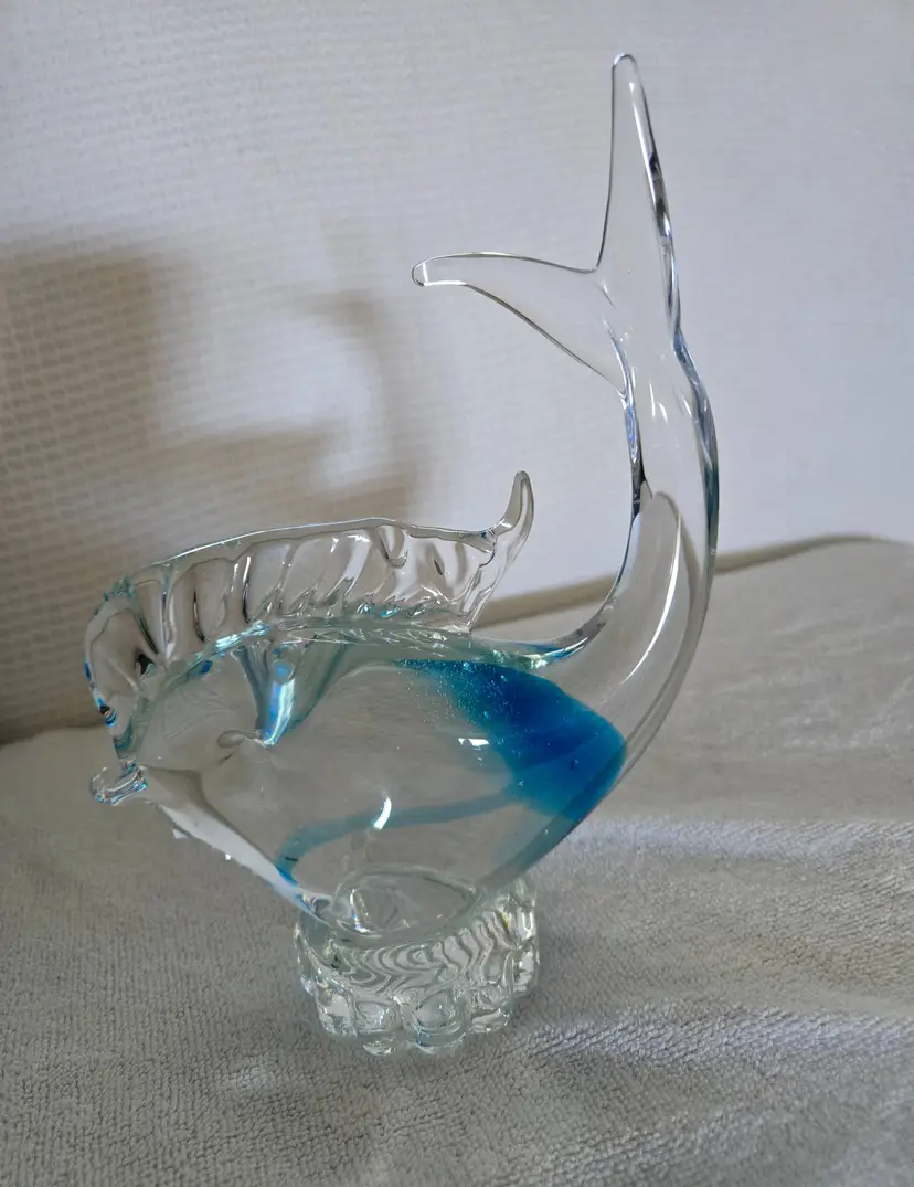 Beautiful clear glass fish with shades of blue flowing throughout. It can be used as a paperweight or as a decorative piece. It stands 7 33/4" tall, 6" wide. 2" deep and 2 1/4" across the base. No chips, cracks, or repairs. In excellent condition. It does have a dark spot inside the glass.