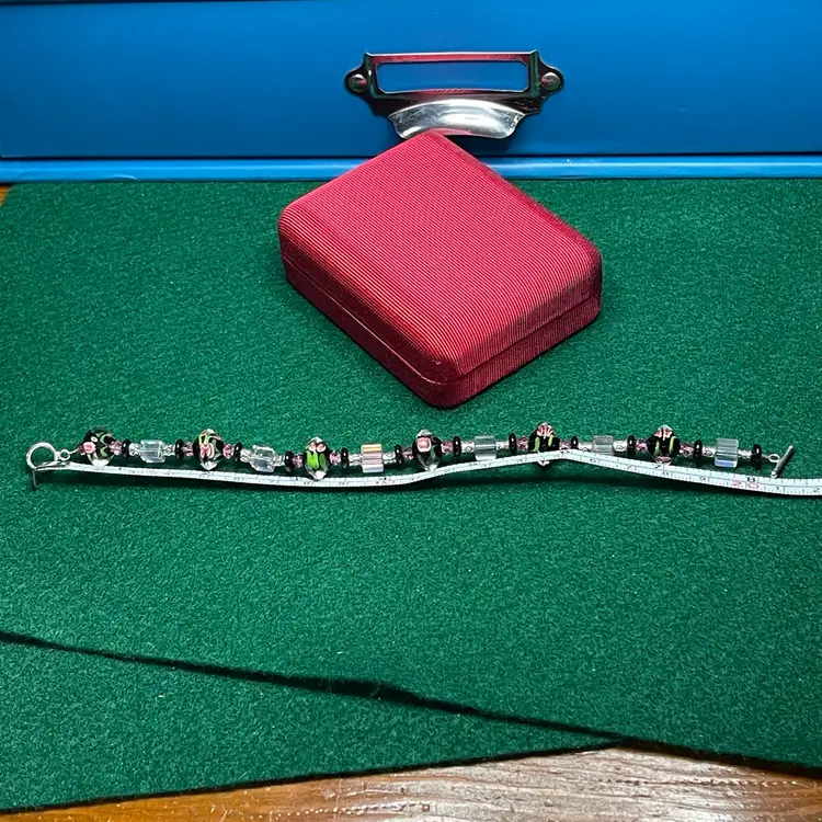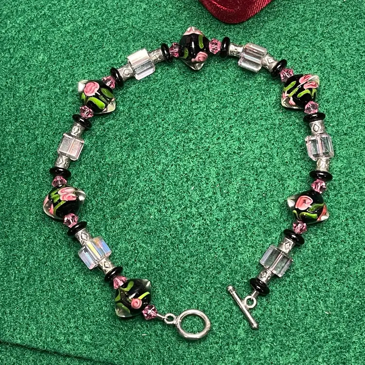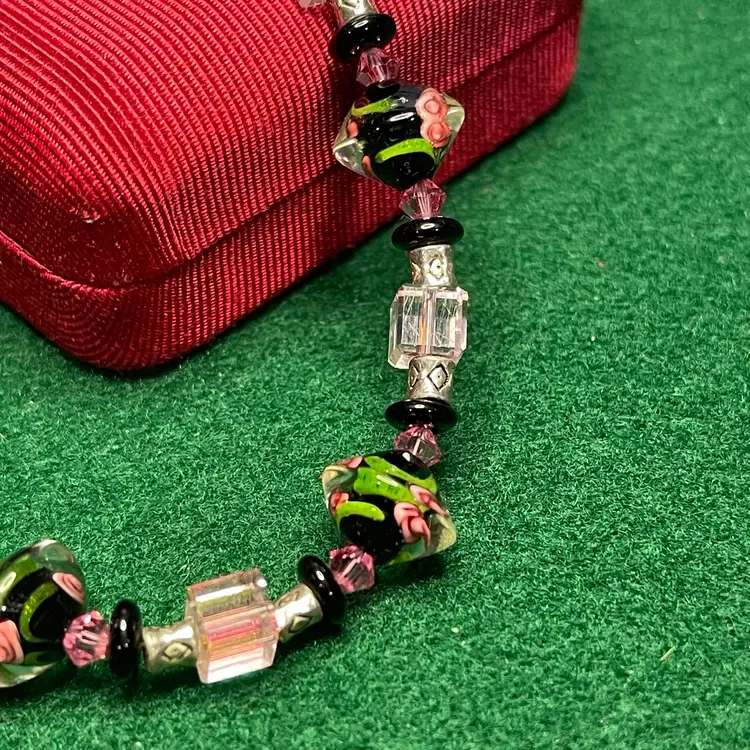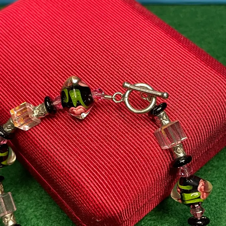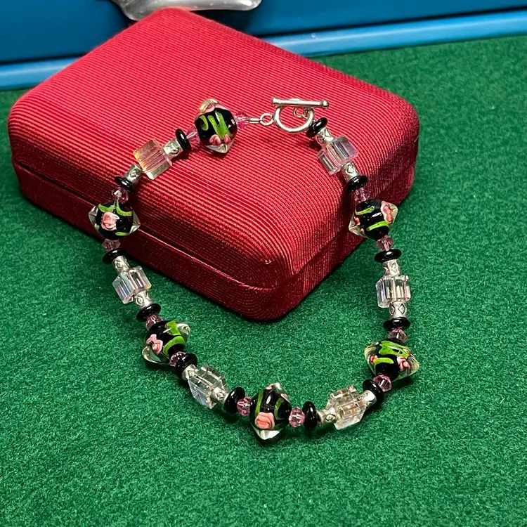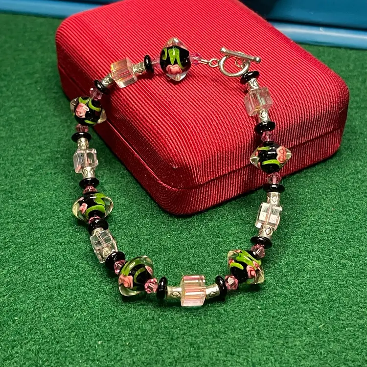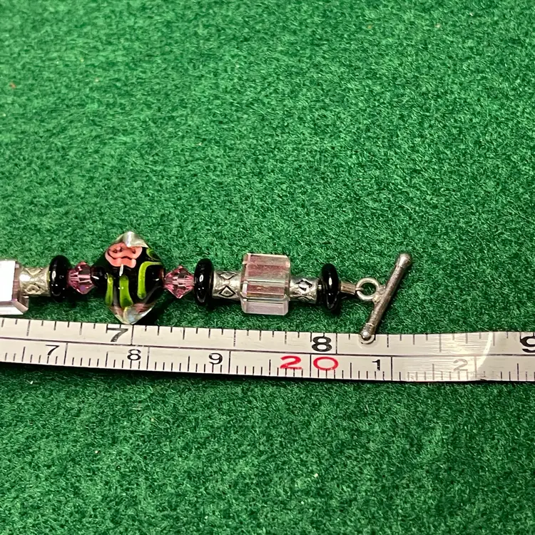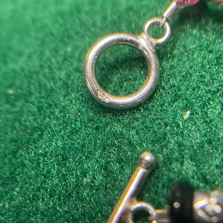 In good condition with no chipped or cracked beads. The bracelet is about 8-1/4 inches long with only the two part clasp marked and tested as sterling.