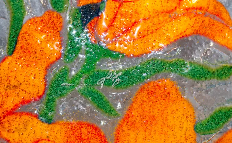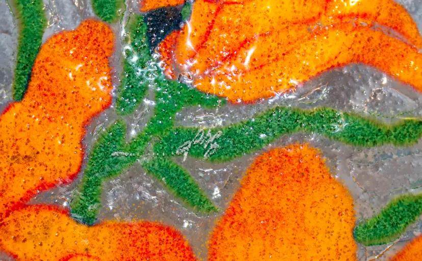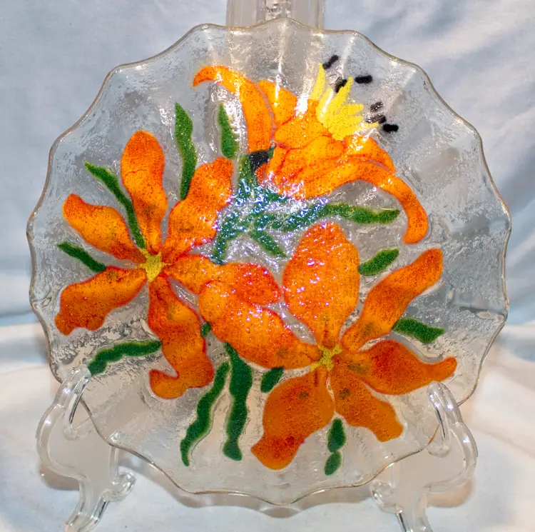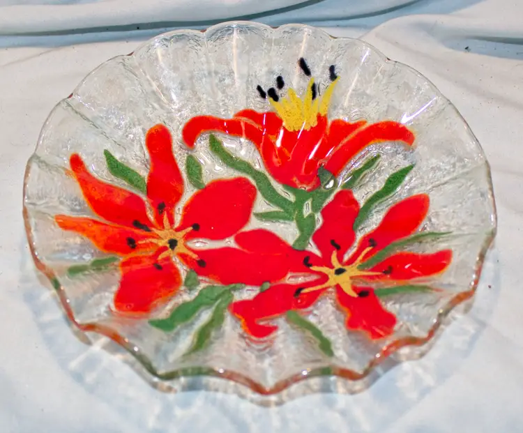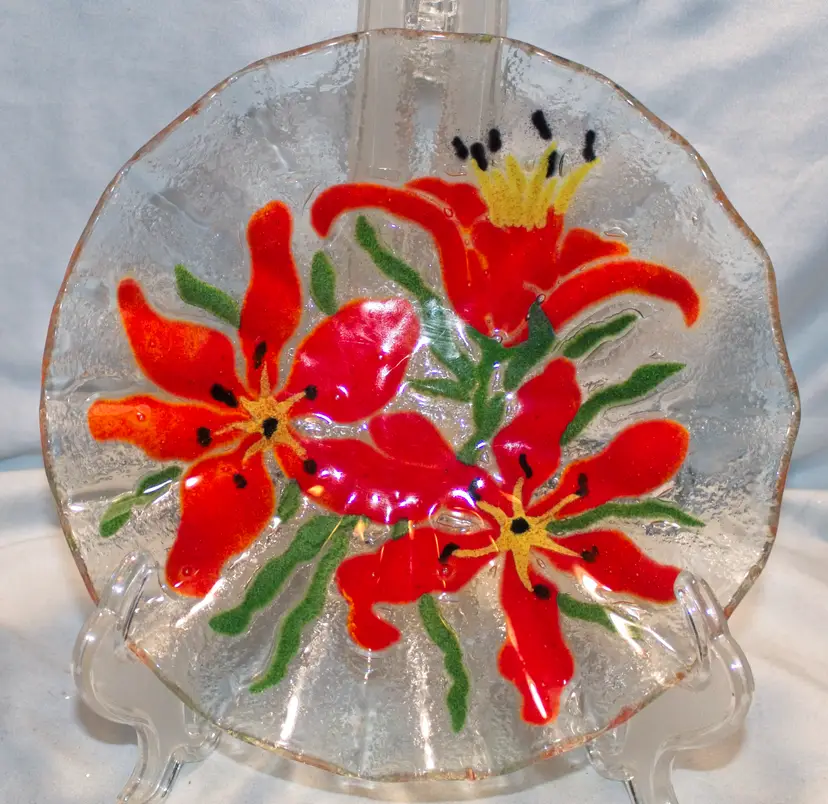 Art Glass Fused Red Tiger Lily Plate Signed 7.75" Wide. In good condition. 7.75" diameter x 1.5" tall.