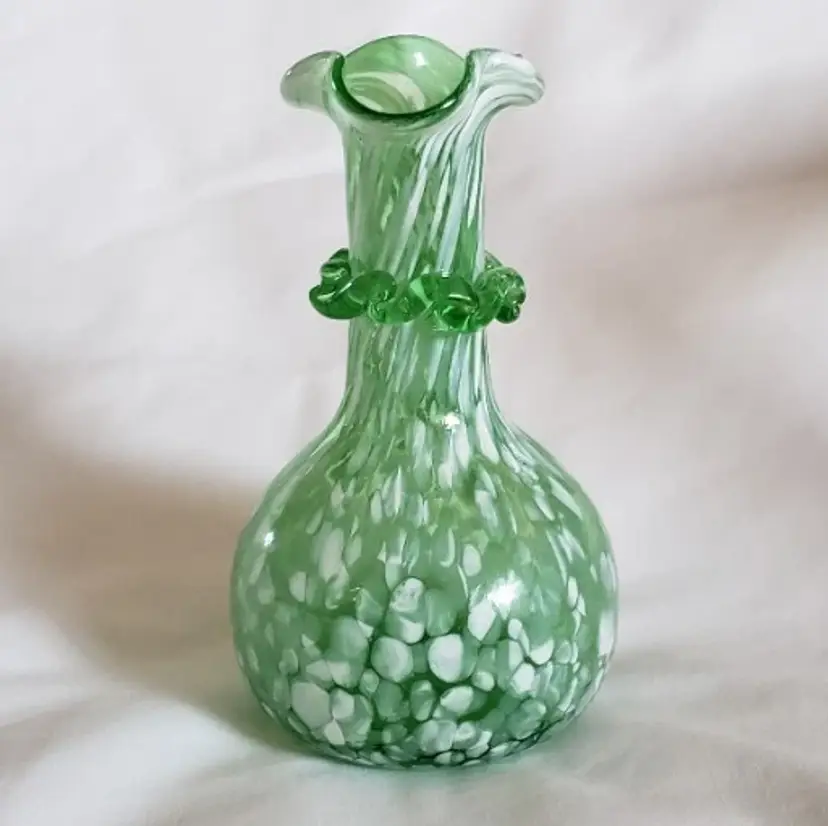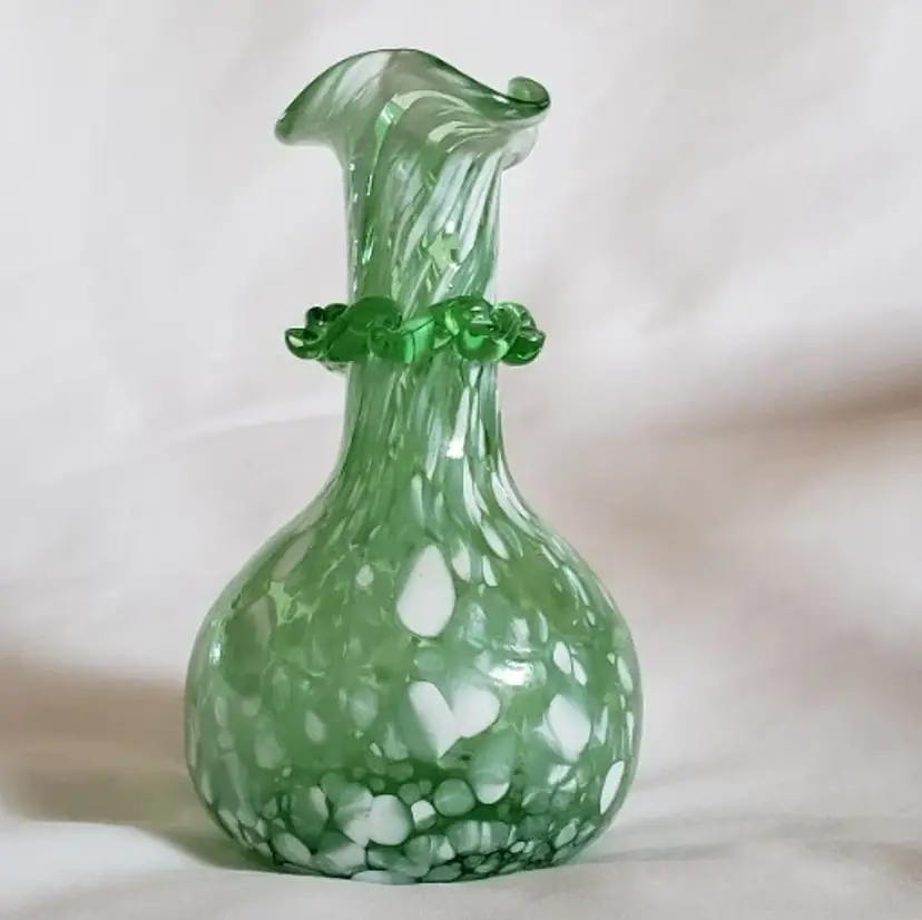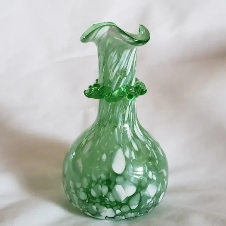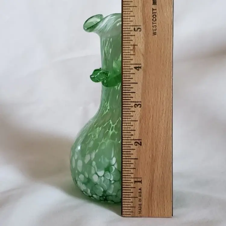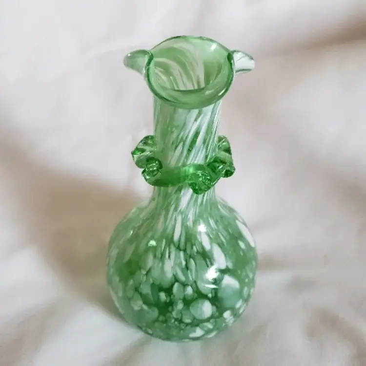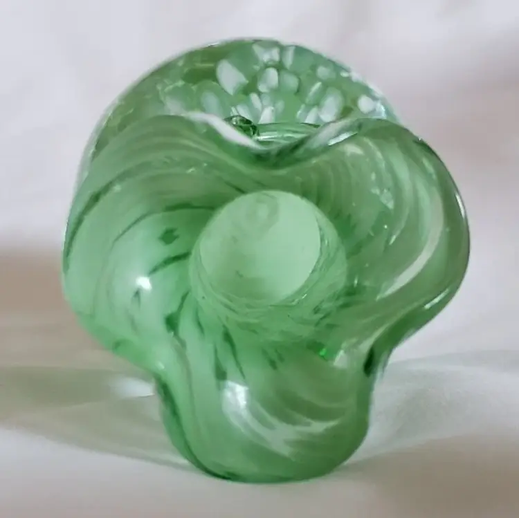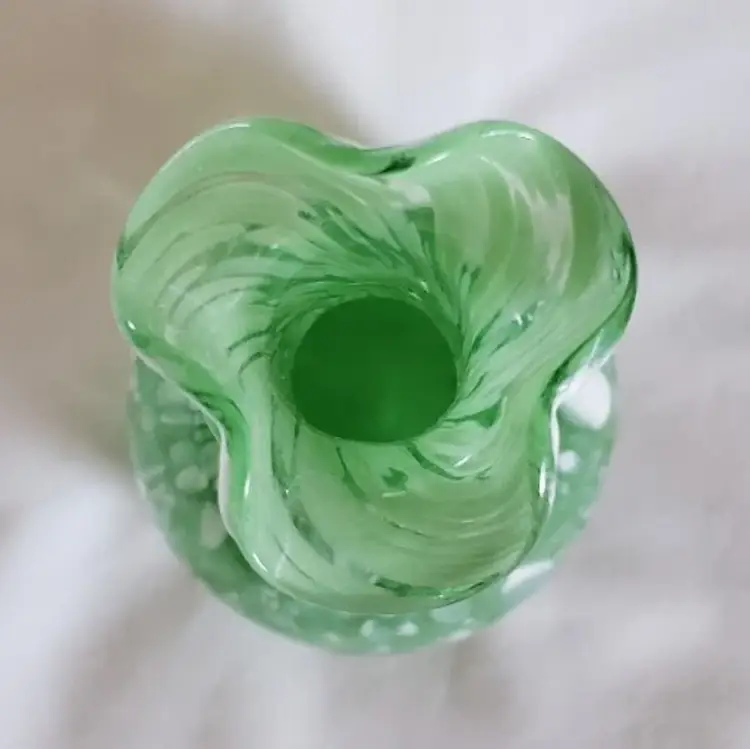 Art Glass Green Ruffled Spatter Vase with Swirl Adornment at Neck 5 3/8" tall approximately - Handblown. Used condition with some dirt, rough pontil, manufacturer flaws including bubbles and dirt within the glass. Please view all the photos and read the entire item description and please ask any questions prior to purchase when possible.