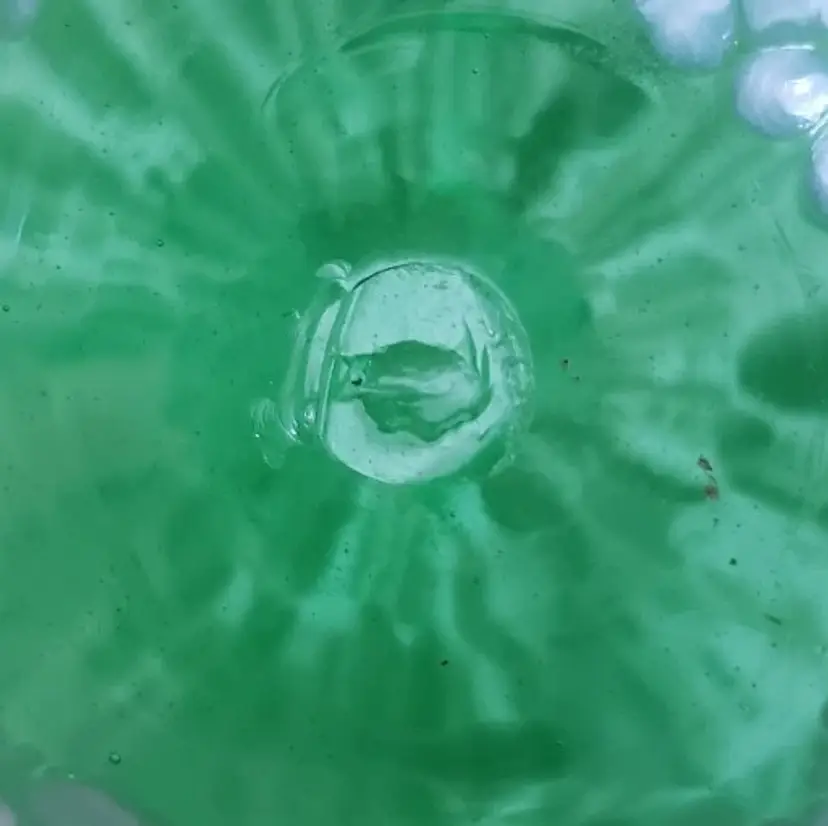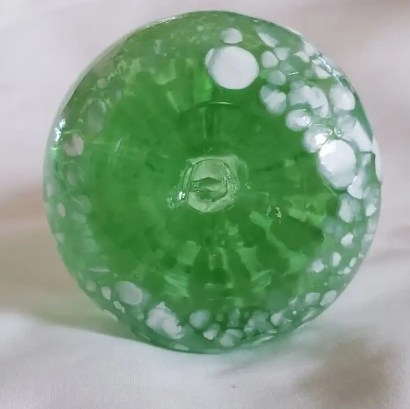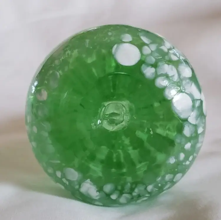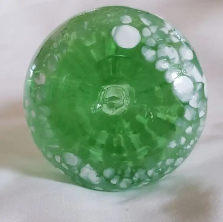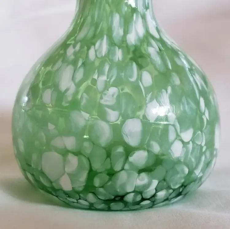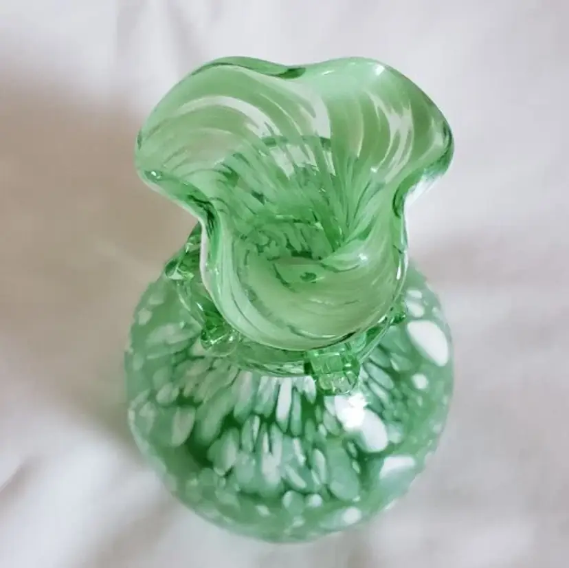 Art Glass Green Ruffled Spatter Vase with Swirl Adornment at Neck 5 3/8" tall approximately - Handblown. Used condition with some dirt, rough pontil, manufacturer flaws including bubbles and dirt within the glass. Please view all the photos and read the entire item description and please ask any questions prior to purchase when possible.