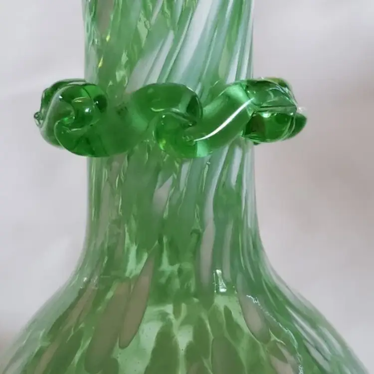 This beautiful hand-blown art glass vase with a swirl adornment at the neck is a must-have for any home decor enthusiast. The green color perfectly captures the essence of nature, while the white accent adds a touch of elegance. The ruffled design at the top makes it a unique centerpiece that is sure to catch everyone's attention.