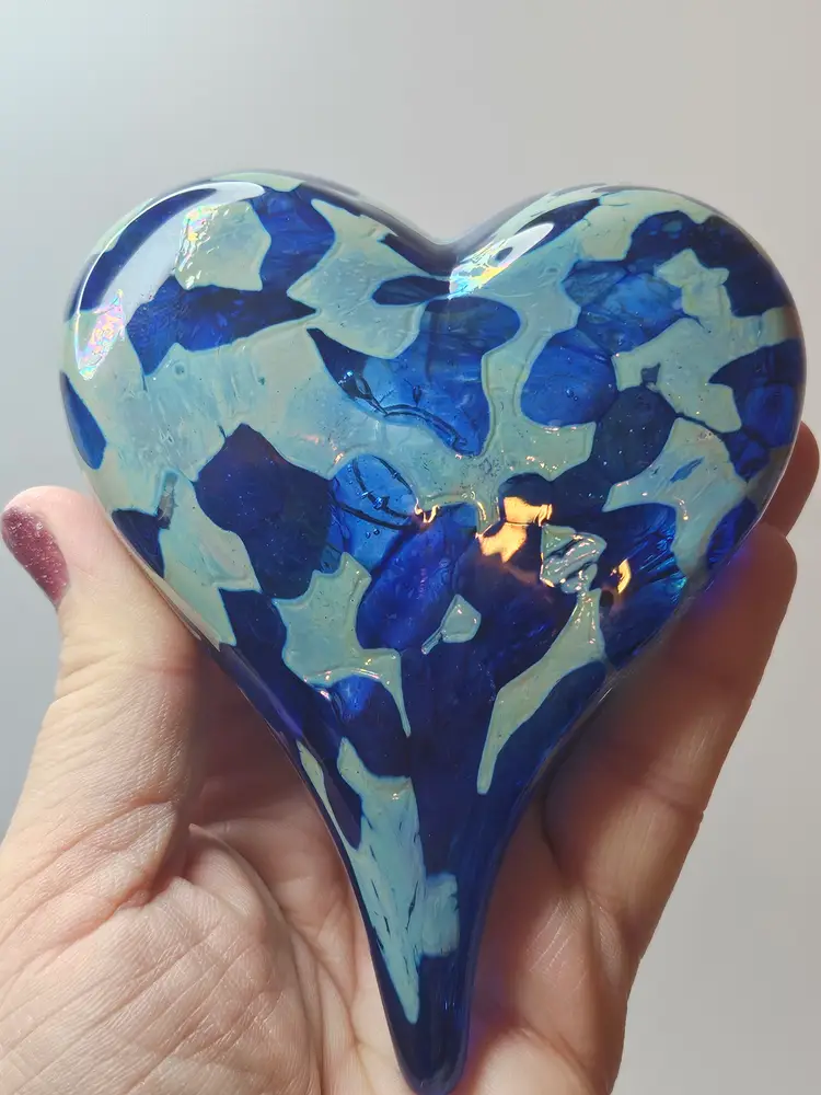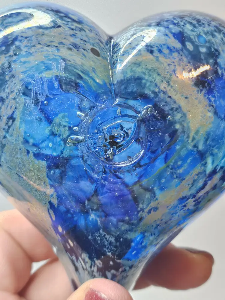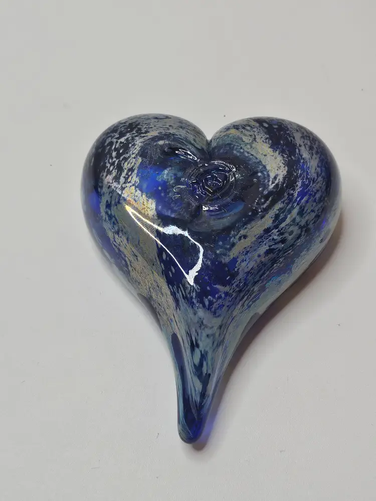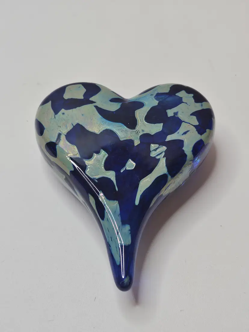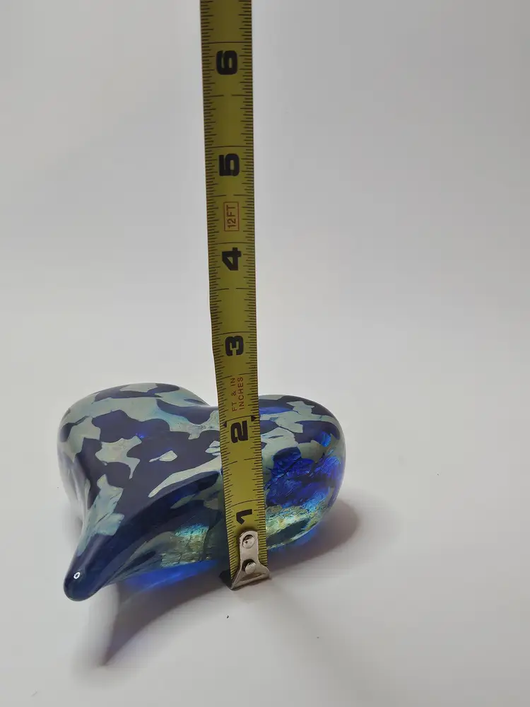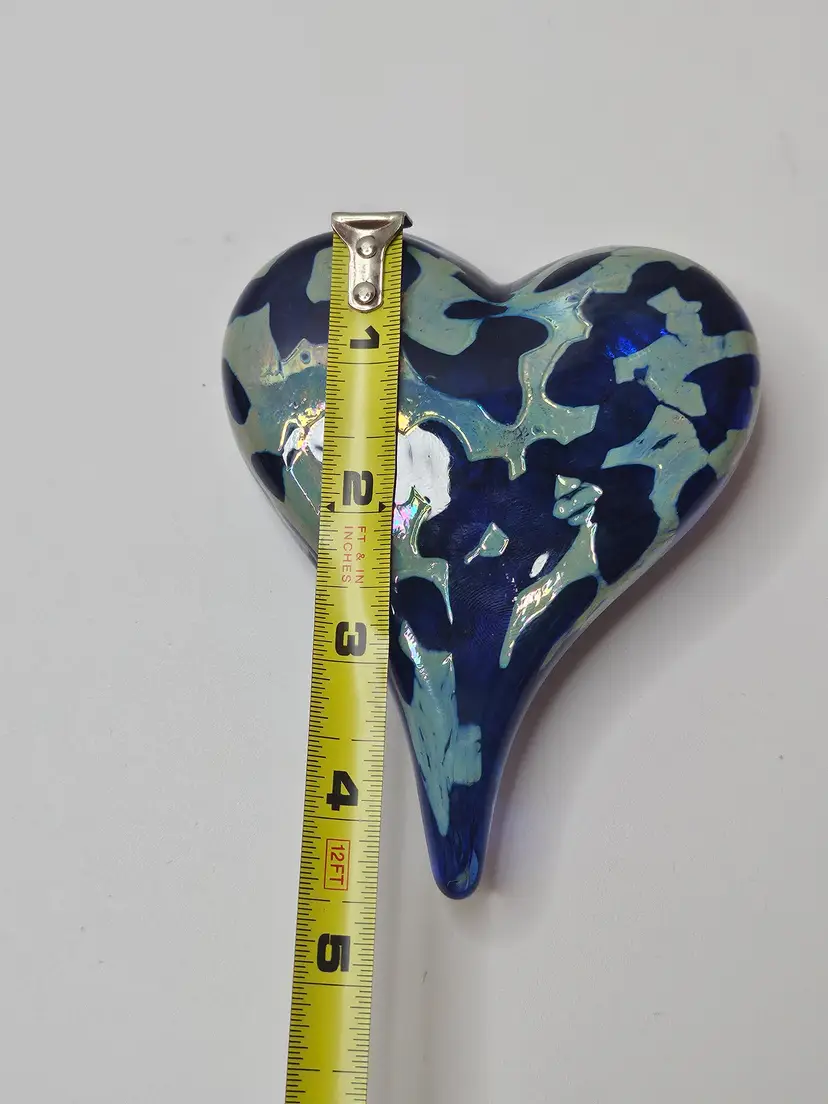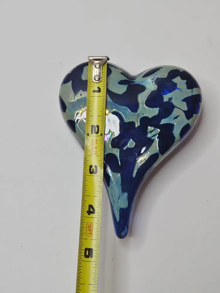This paperweight is a stunning piece of art glass in a vibrant cobalt blue color with a pearl iridescence finish. Hand-blown and signed by the artist, it features a heart shape design that adds a romantic touch to any space. The impressed backstamp indicates the authenticity of this decorative item, which is sure to make a beautiful addition to any collection or desk.