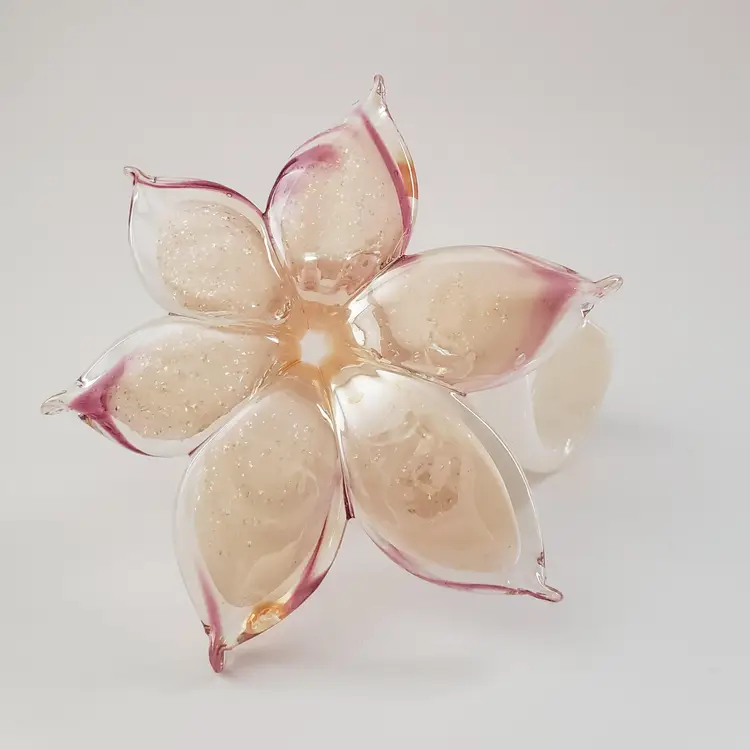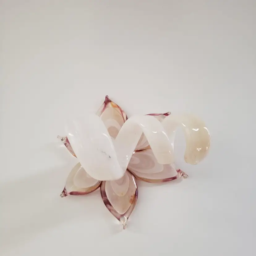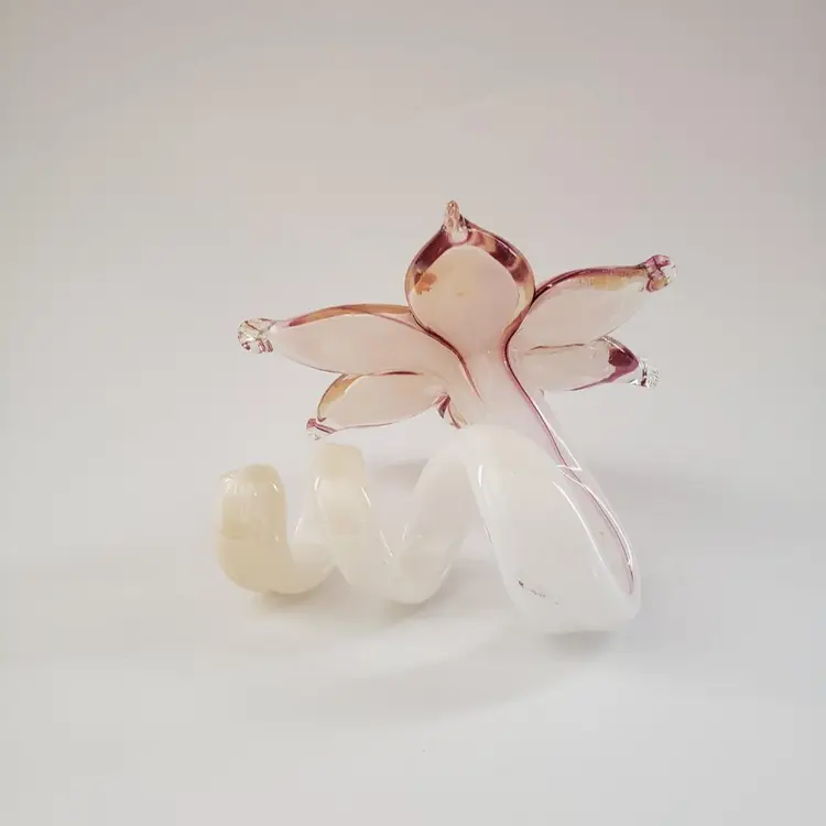Hand blown art glass lily, has a scuff or inclusion on the swirl that you can see in pic 2. Looks like it also got too close to heat and caused some slight discoloration on the back of 2 of the petals. Not really noticeable from the front but you can see it in the second and third pics if you look closely. Still very pretty!