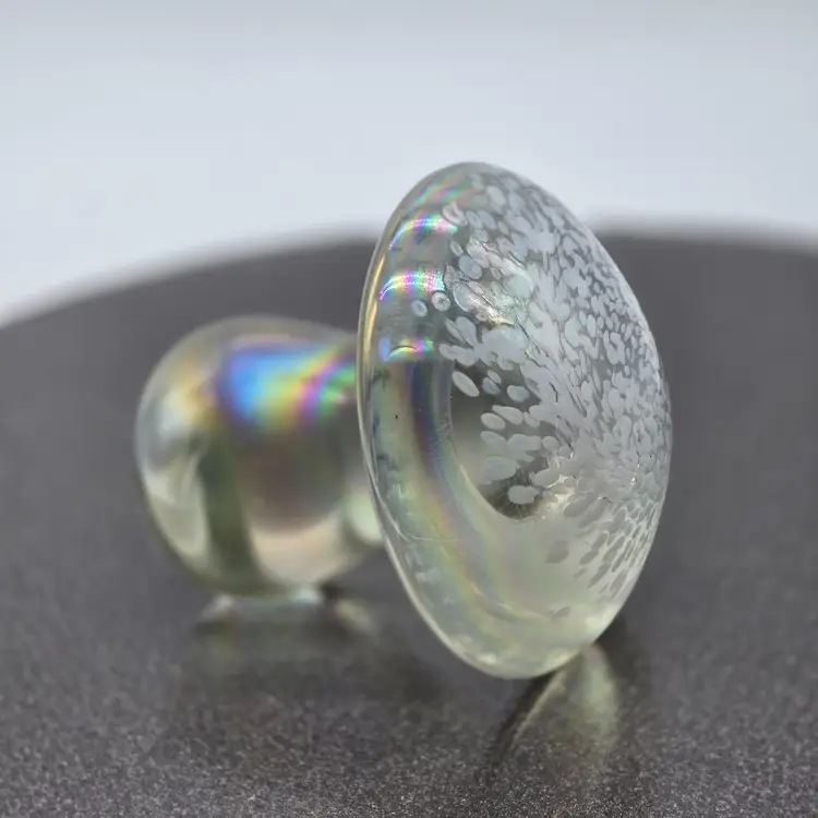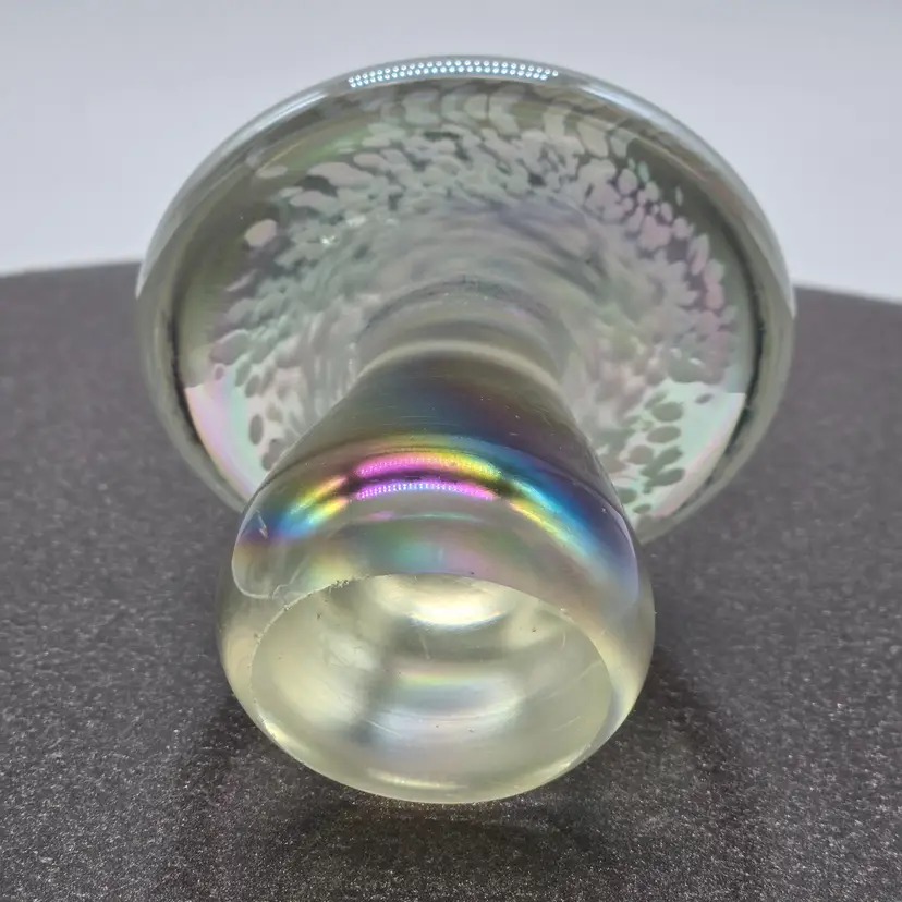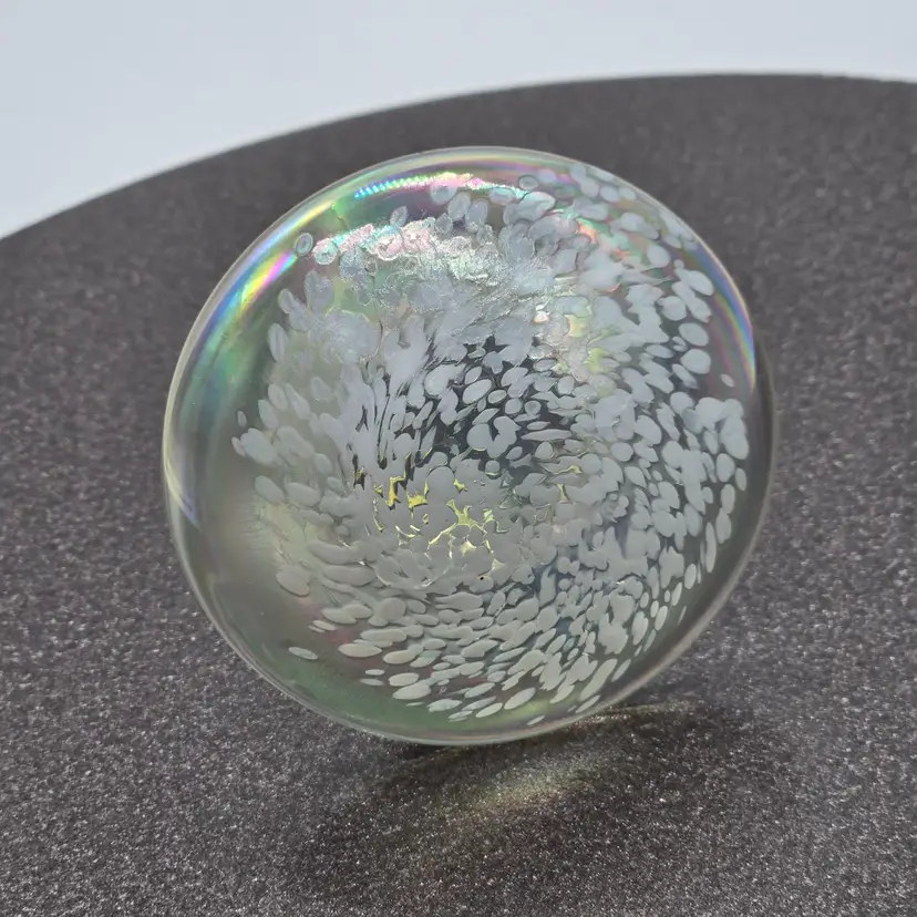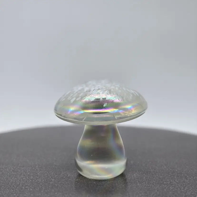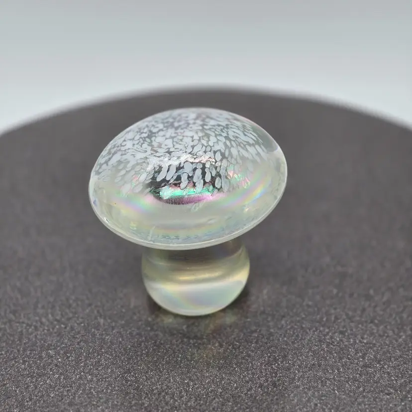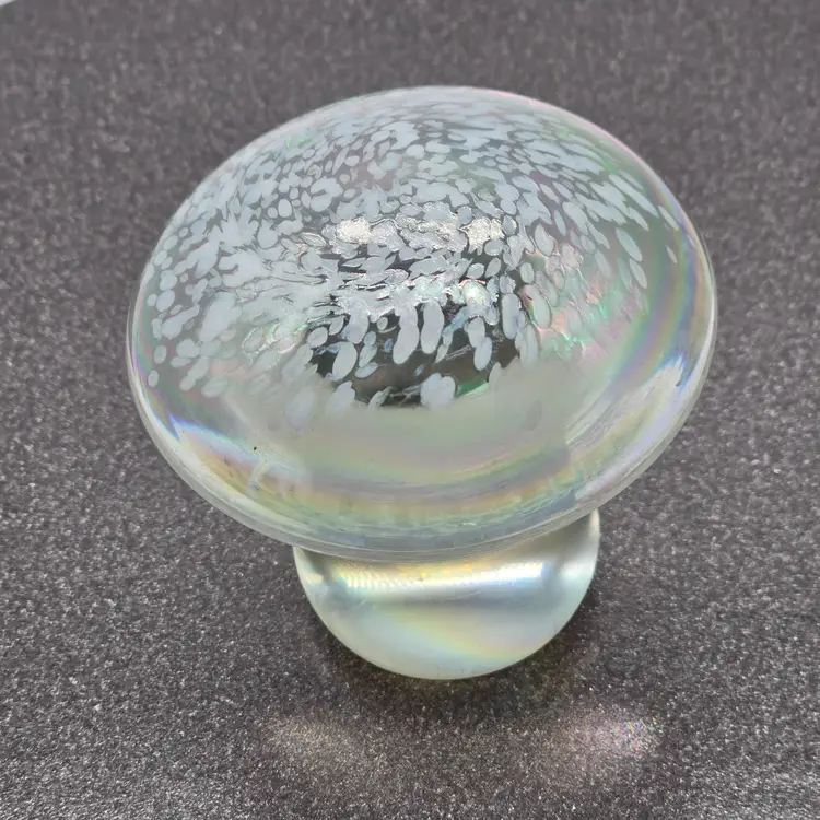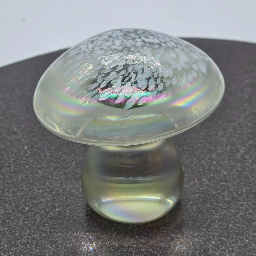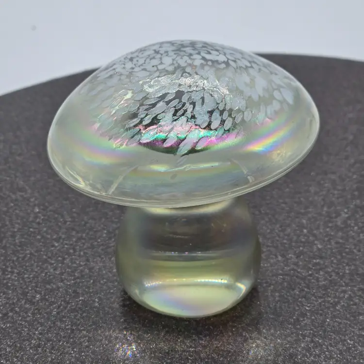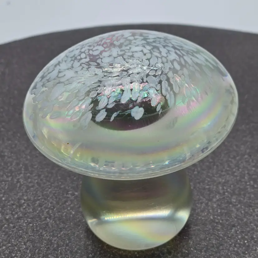 Art Glass Mushroom Paperweight/Decor 3" x 3". Opalescent finish. No chips of cracks. Please see photos as they are part of the description. Item will be well wrapped for shipping.
