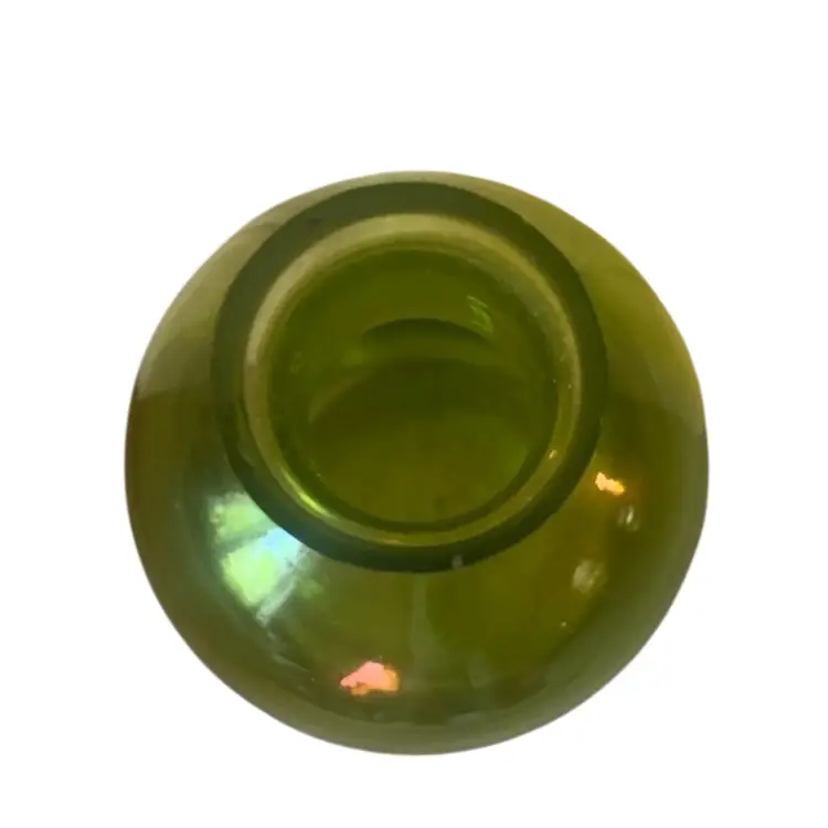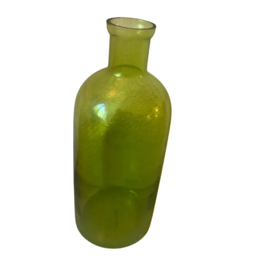 Art glass olive green vase made in India. It is a little over 13 inches tall and 3 1/2 inches wide. There are no chips or cracks.