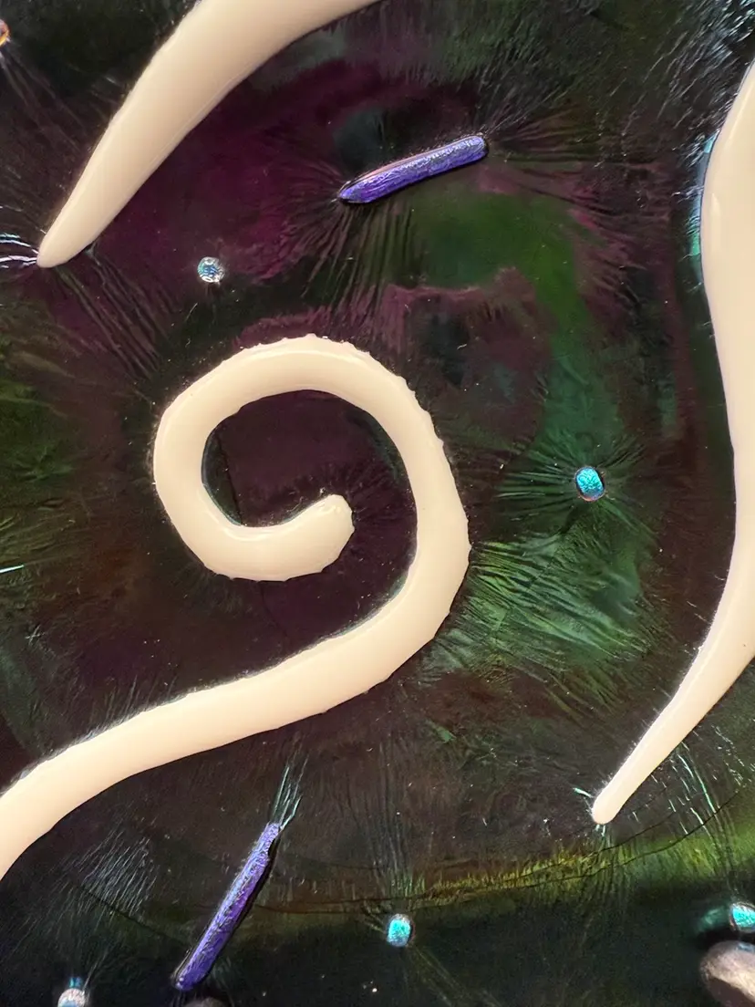 Beautiful piece. Iridescent, white glass glows. 6x6”