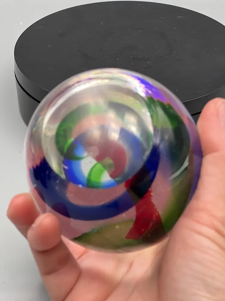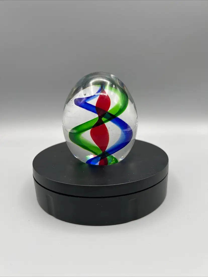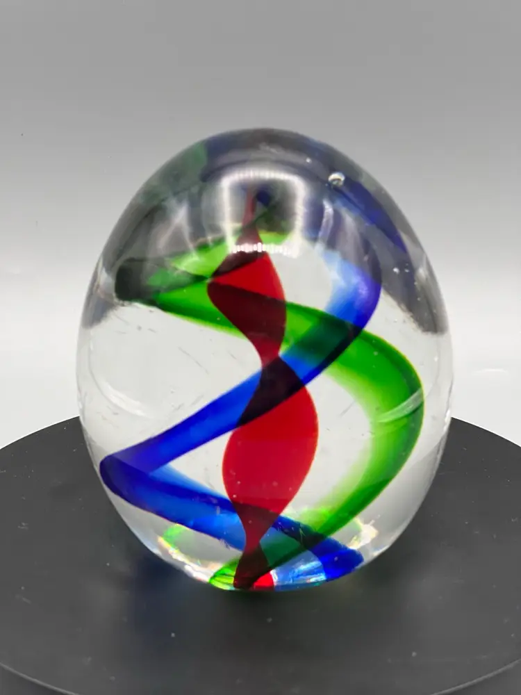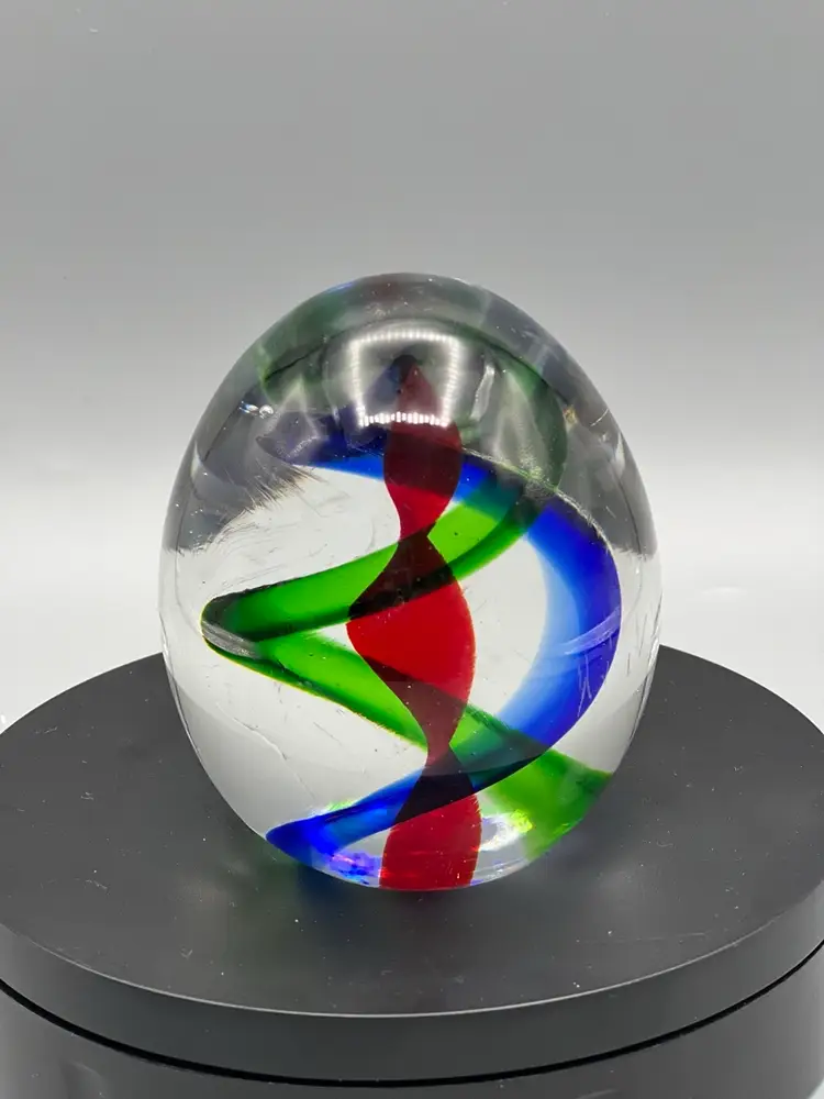 Murano art glass paperweight with red green and blue swirl pattern.