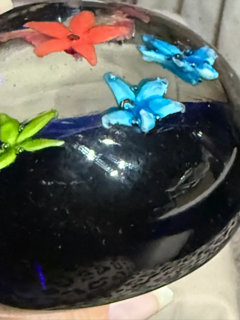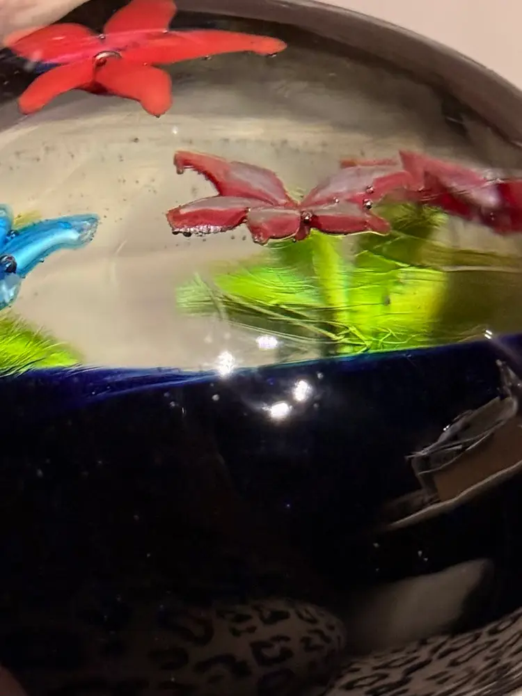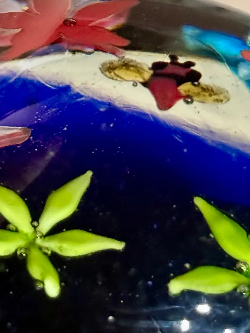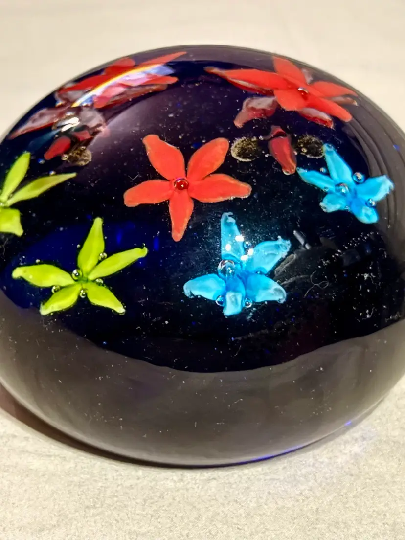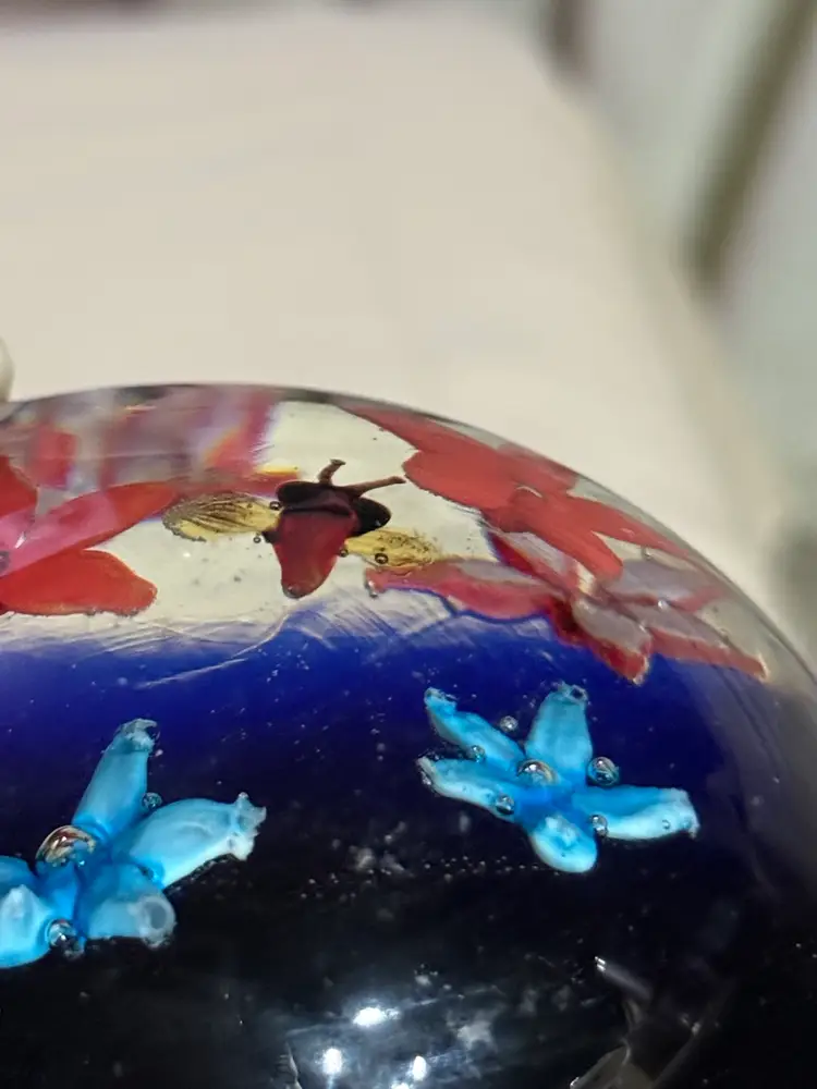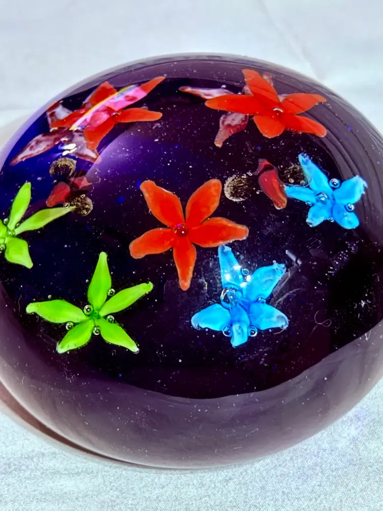 Large and heavy art glass paperweight. It takes a moment to find the bees which is so unique.