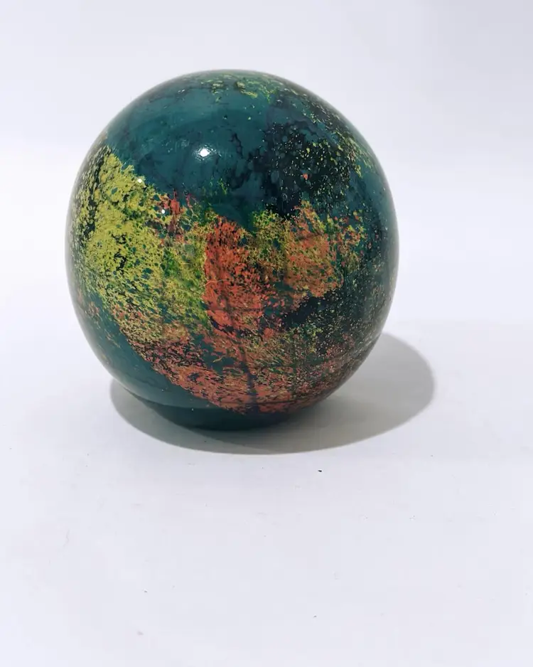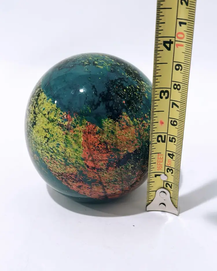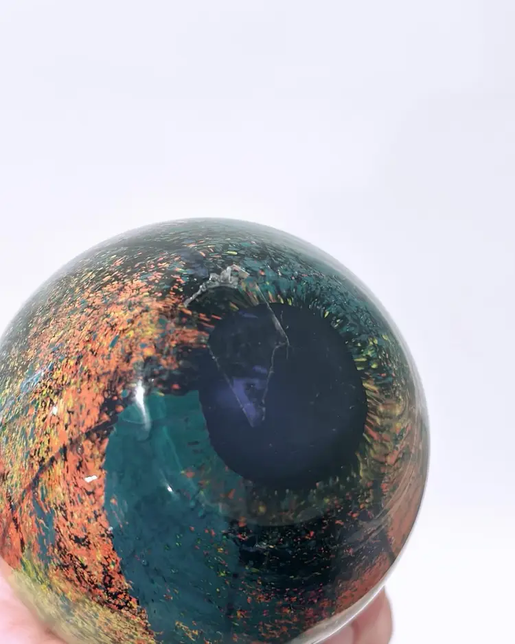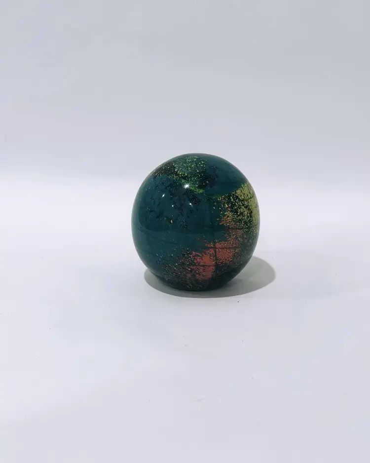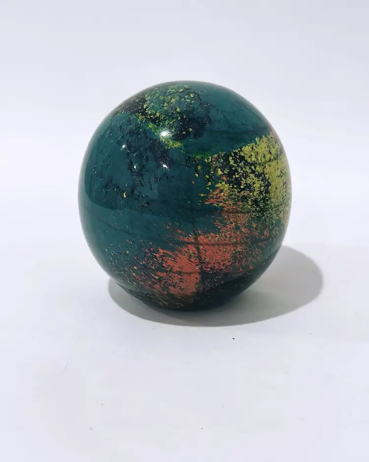 This Art Glass Paperweight features a unique design with a stunning Ocean Blue, Yellow, and Red Globe Look. The paperweight is made of high-quality Glass with a grid pattern and bubbles, adding to its artistic appeal. It is perfect for collectors or as a decorative piece for any home or office.