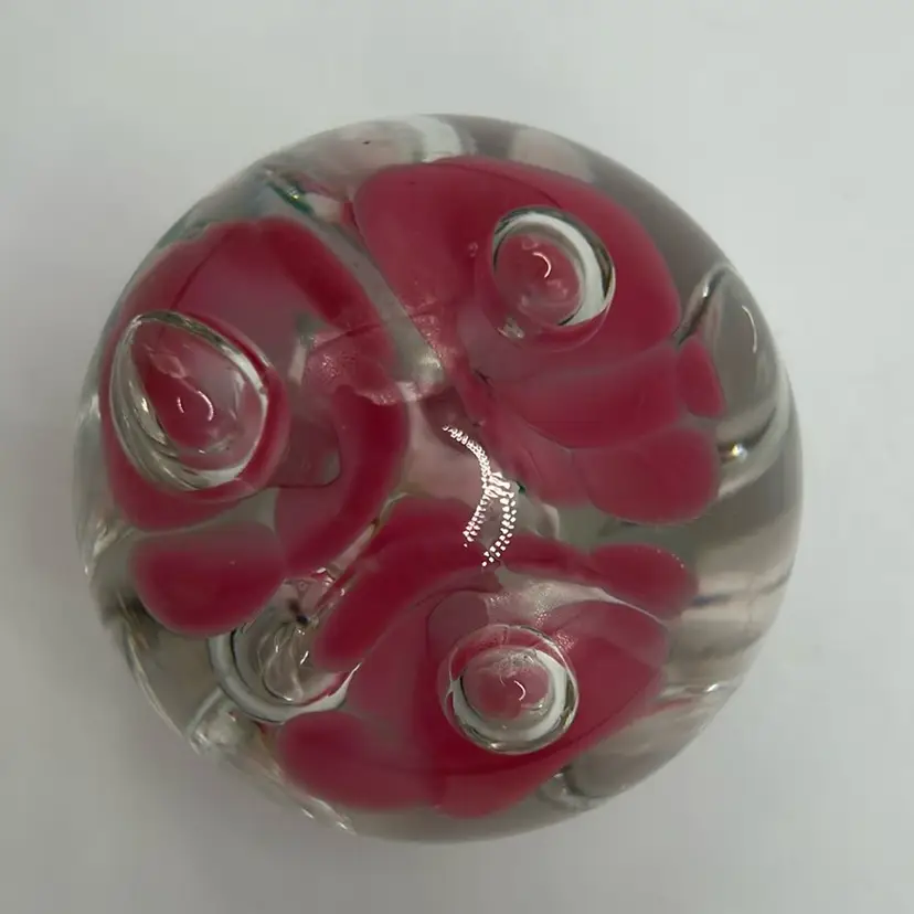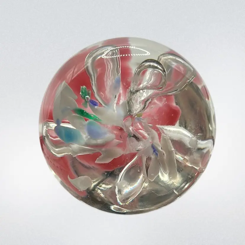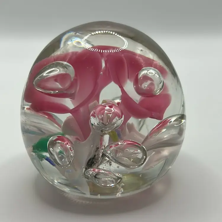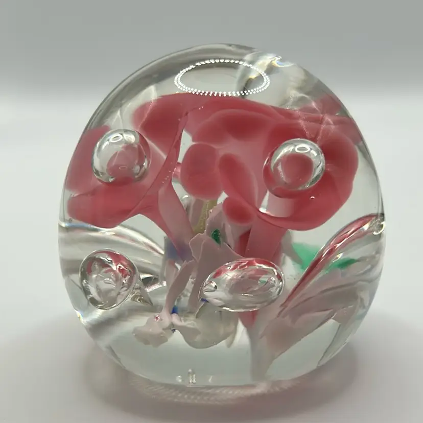 This is an art glass, paperweight featuring trumpet flowers and controlled bubbles. It stands approximately 2 inches tall and 2 1/2 inches wide no chips, crocs or bruises.