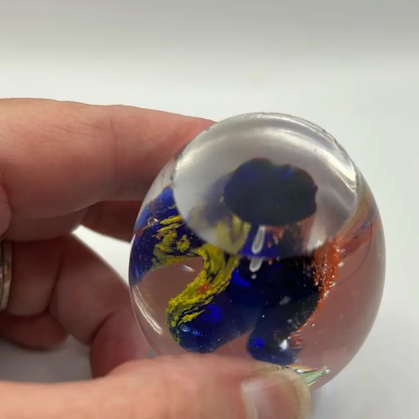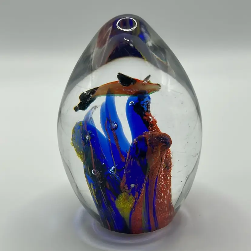 This piece is a vintage art glass, egg shaped paperweight featuring an ocean or aquarium scene with fish and coral. It has minor scratching at the top end and it has several flea bites around the base. It stands 3 inches tall and is approximately 2 inches wide.