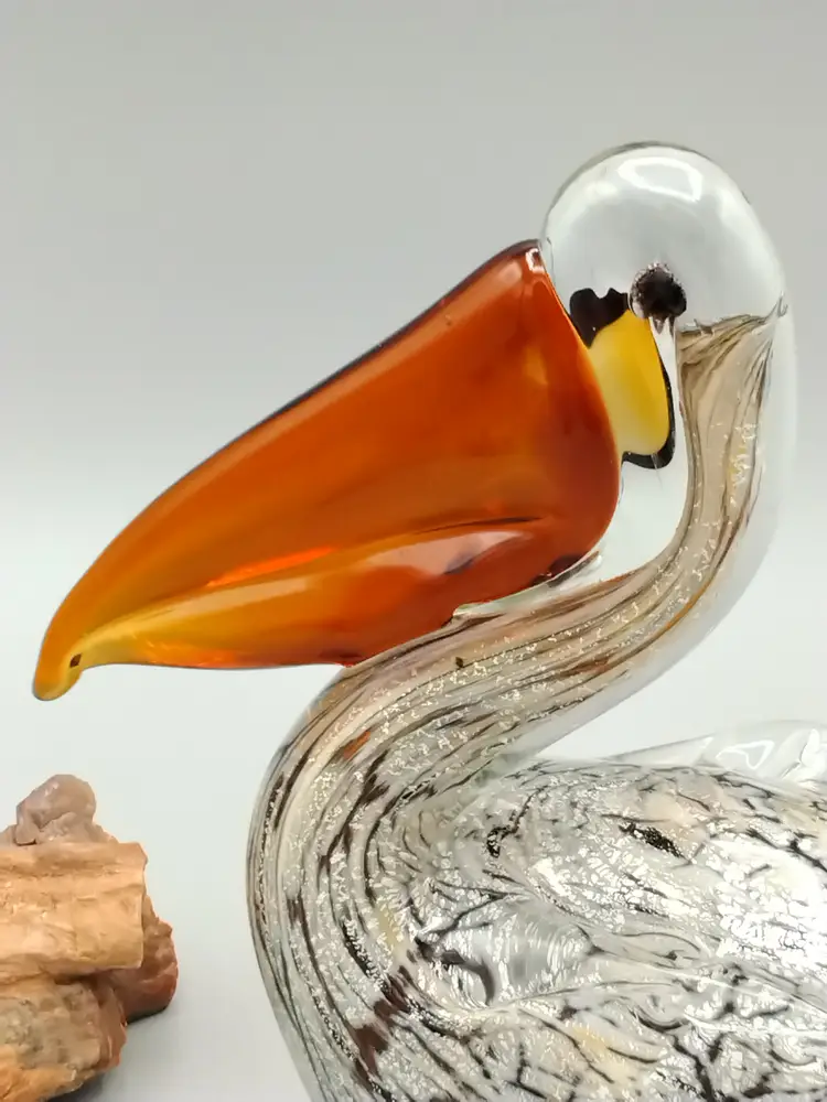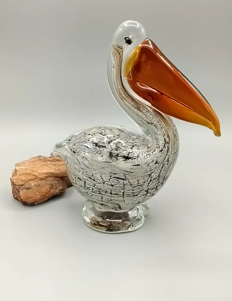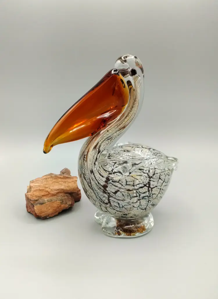 Art Glass Bird, Water Bird, Pelican, Handblown Glass, Solid Glass, Silver Crackled, Amber Glass Applied Beak, Ruffled Texture on Back For Feathers. Murano Inspired Style, Smooth Pontal, No makers marks, or signatures.