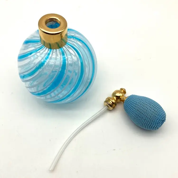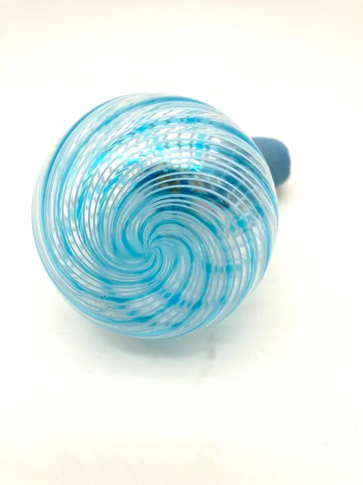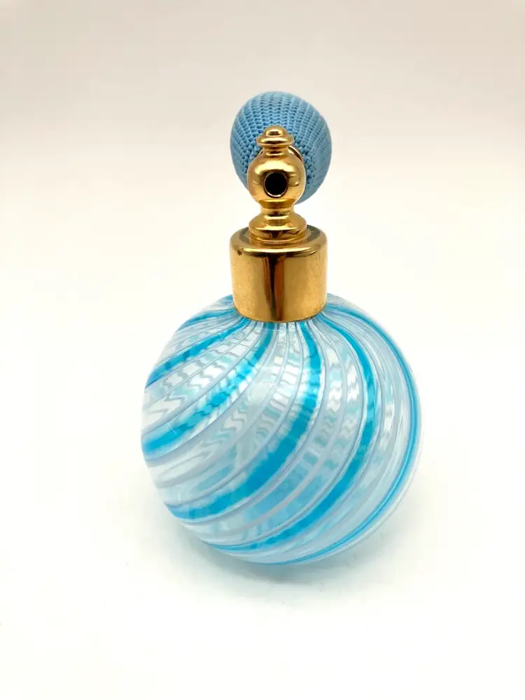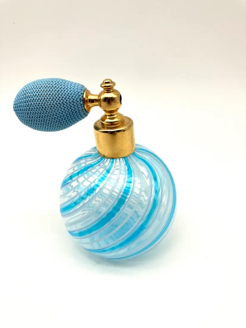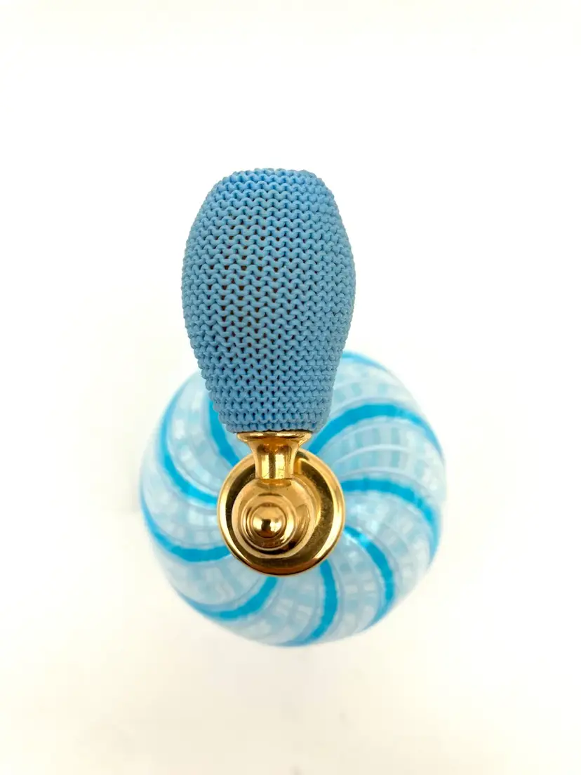 I believe this blue and white swirl perfume bottle to likely be Murano made. That said, the applicator bulb is hard as a rock. I am not sure if it’s supposed to be purely for decor or if it is supposed to squish… it seems to be a solid plastic material under the knitted cover. Other than that, this piece is spectacular! Gorgeous decor piece measuring 3.5” tall by 2.375” diameter. Excellent condition. Not signed, but similars online were stickered.