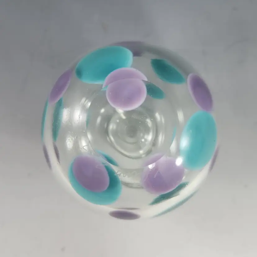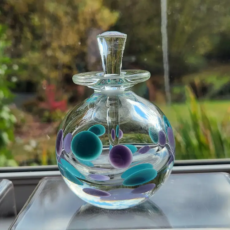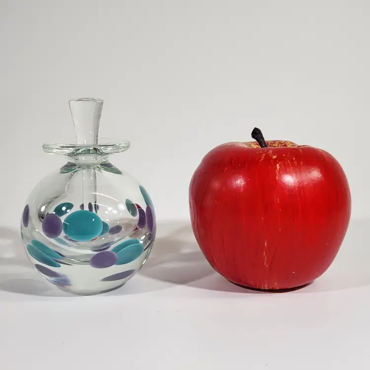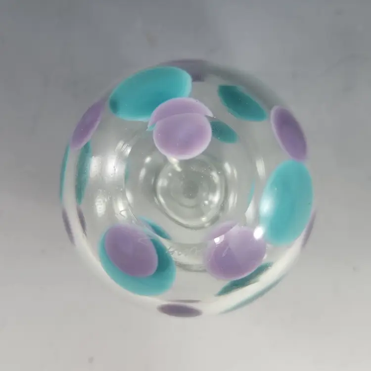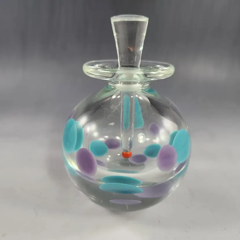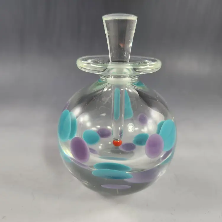 So funky, makes a unique gift! Contemporary style art glass perfume bottle by glass artist Kevin Rogers of Rogers Glass Works Studio, formerly in Uniontown, OH. This is one of his last pieces as he retired from glass making shortly after this was made. These are known as paperweight bottles, this one features aqua blue & purple polka dots. The bottle neck and a strip on the orange tipped dauber is ground for a secure fit, the design is unique to him. This is signed K. Rogers and dated 2002. I have another of his perfumes in a different color combination, please see last photo.