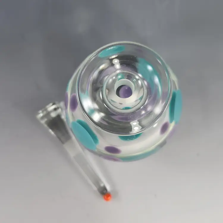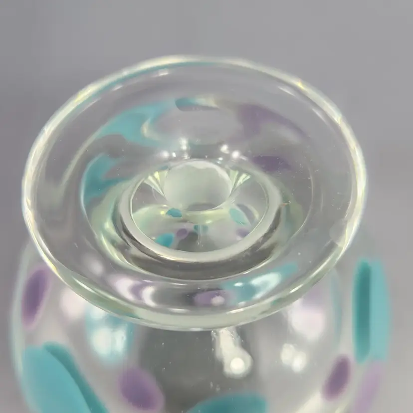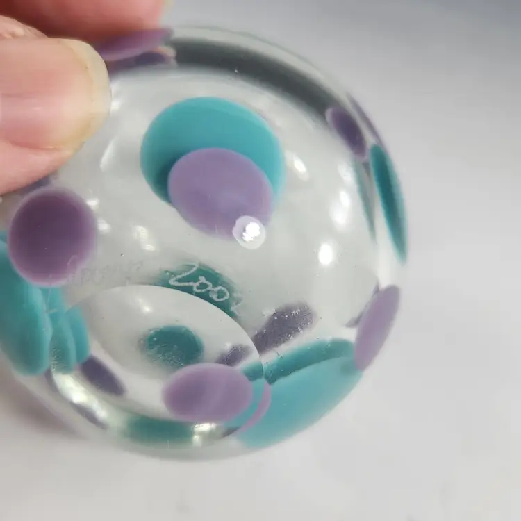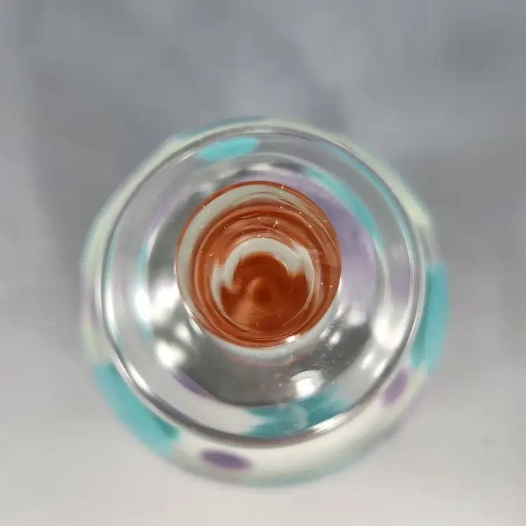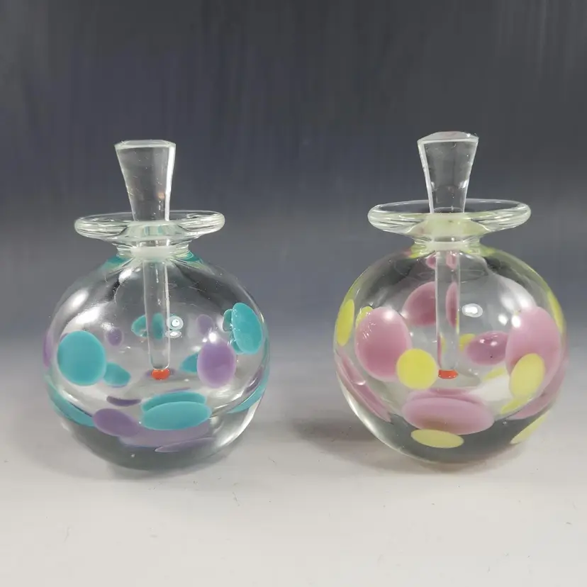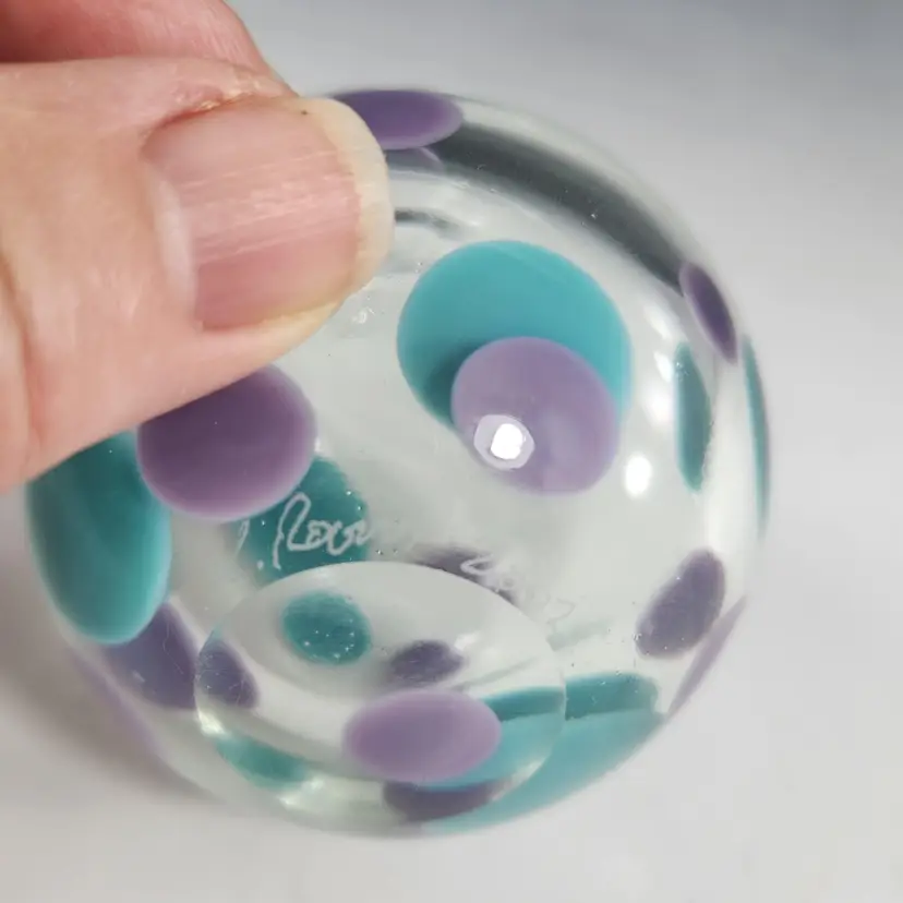 So funky, makes a unique gift! Contemporary style art glass perfume bottle by glass artist Kevin Rogers of Rogers Glass Works Studio, formerly in Uniontown, OH. This is one of his last pieces as he retired from glass making shortly after this was made. These are known as paperweight bottles, this one features aqua blue & purple polka dots. The bottle neck and a strip on the orange tipped dauber is ground for a secure fit, the design is unique to him. This is signed K. Rogers and dated 2002. I have another of his perfumes in a different color combination, please see last photo.