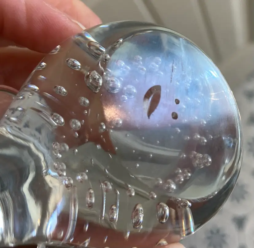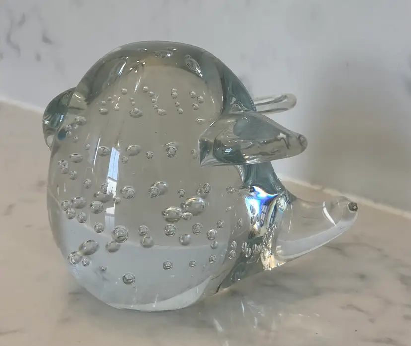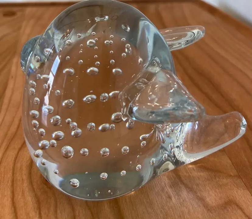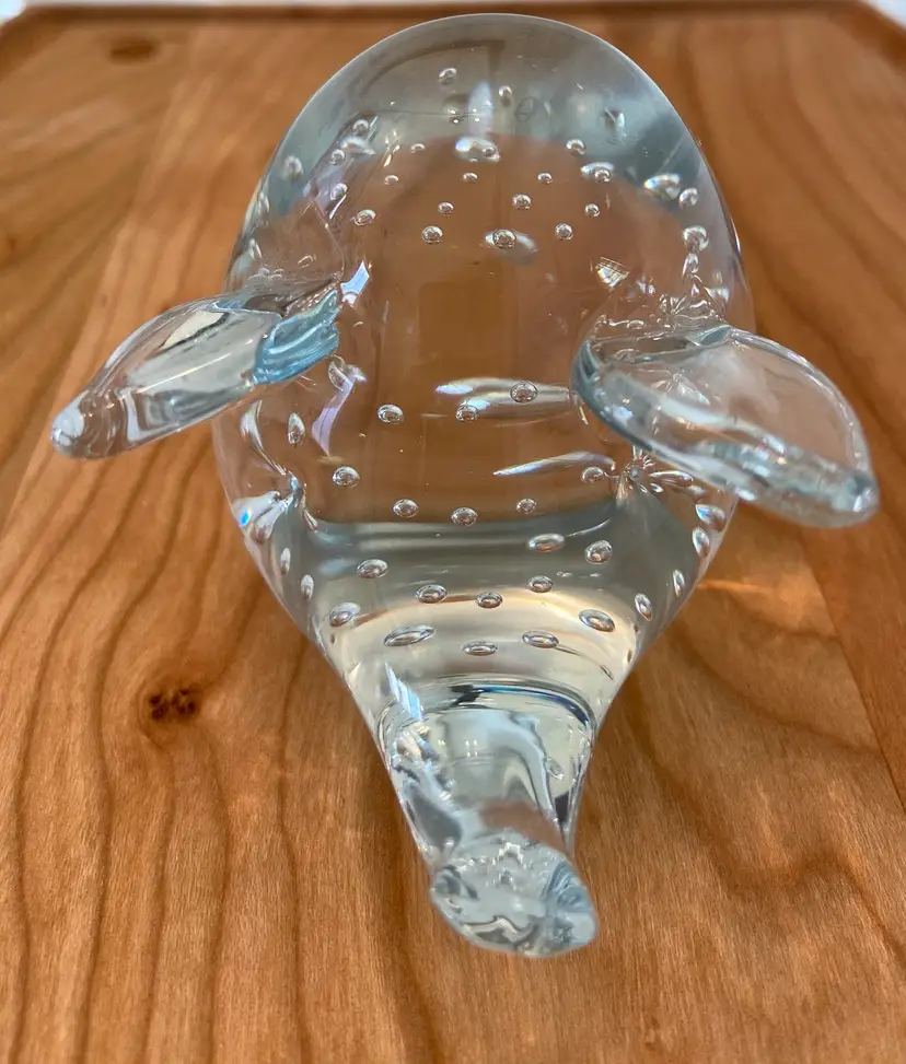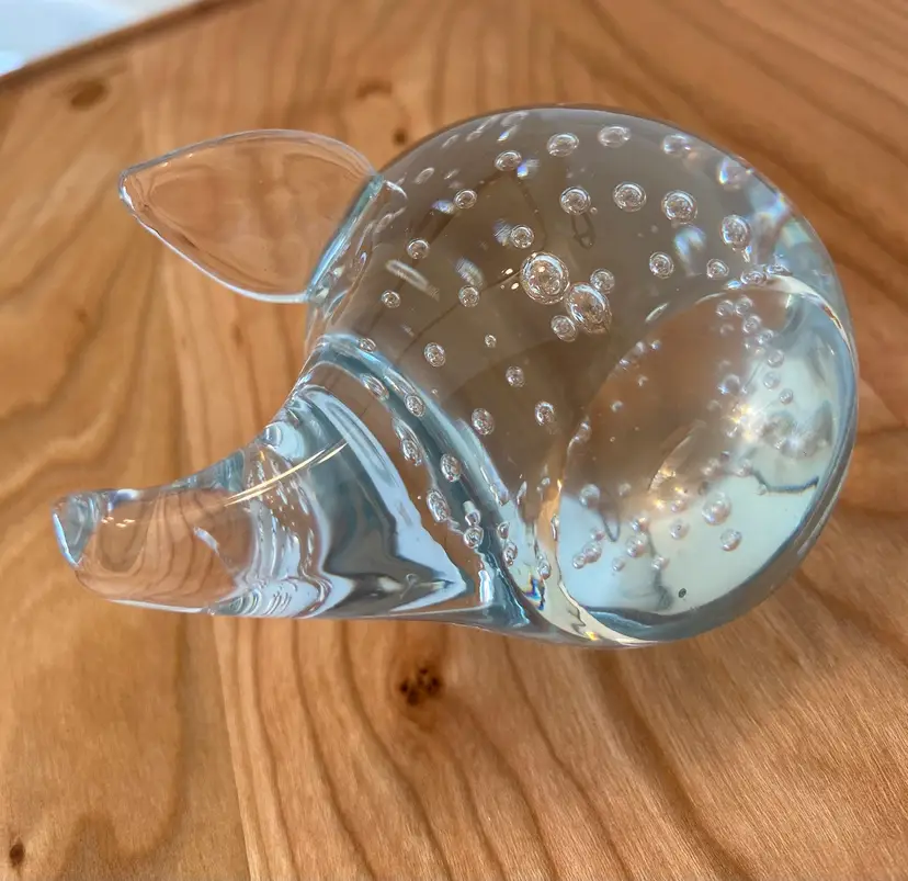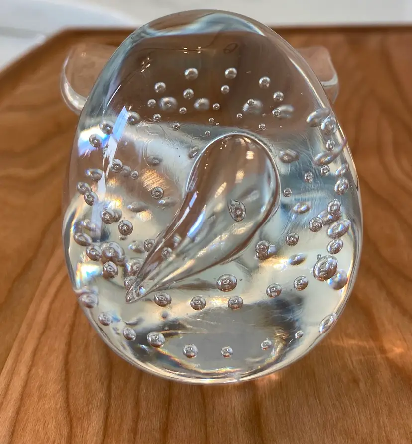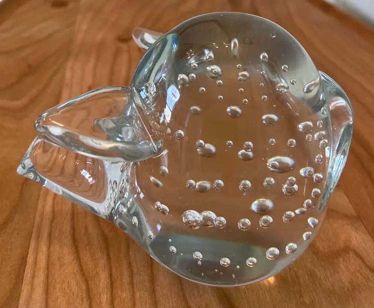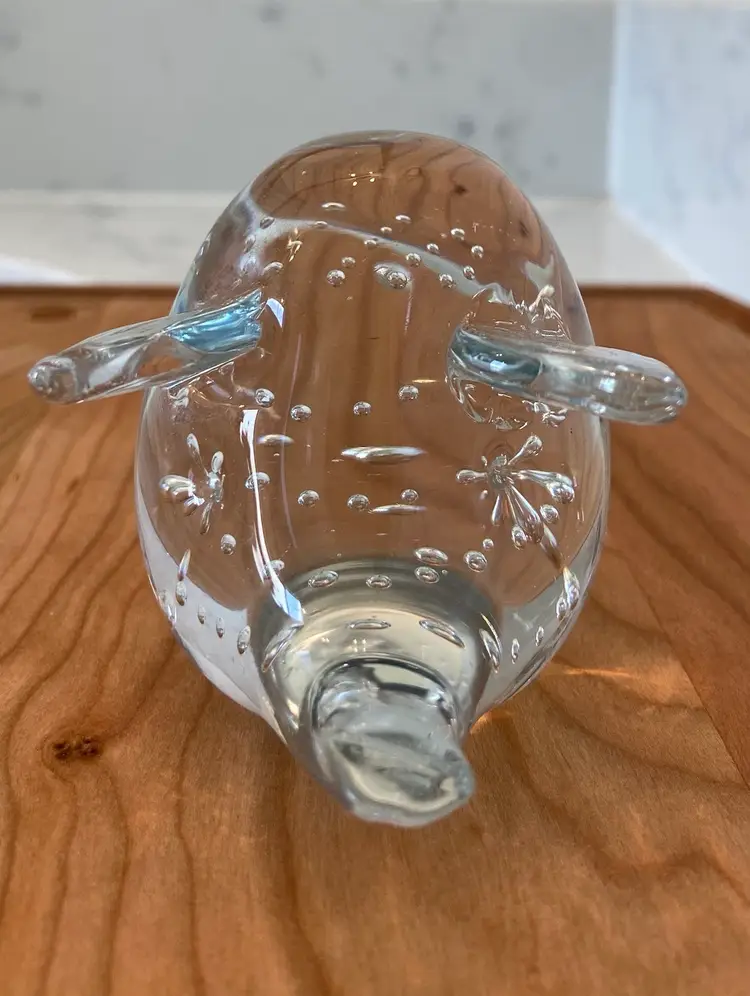 Adorable, clear art glass pig paperweight with controlled bubbles inside. Beautiful to add to your collection, there is one small defect on the very bottom of the paperweight shown in last photo.