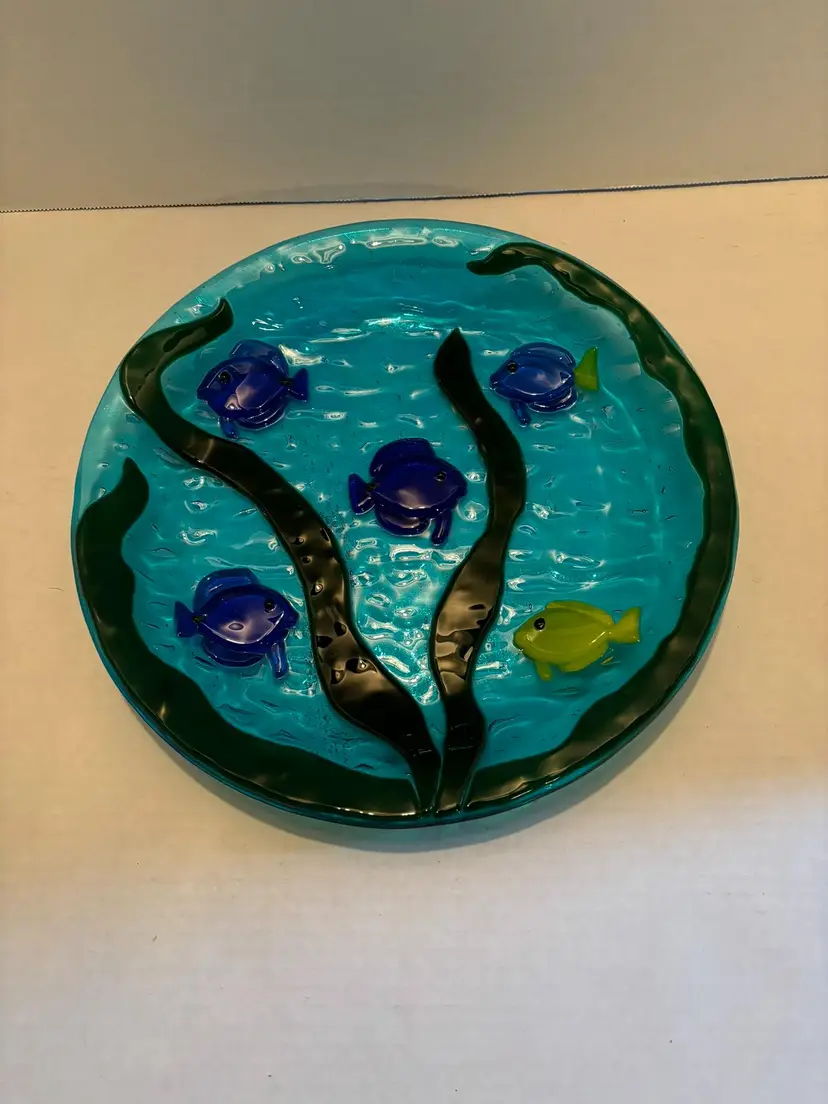 This beautiful art glass plate features an underwater scene with blue and yellow fish, perfect for any fish or ocean lover. The plate is made of high-quality fused glass and is handcrafted, making it a unique and one-of-a-kind piece. The seascape pattern and yellow color give it a vibrant and eye-catching appearance, making it a great addition to any collection or table setting. This plate is perfect for serving fish or other dishes and is sure to impress anyone who sees it.