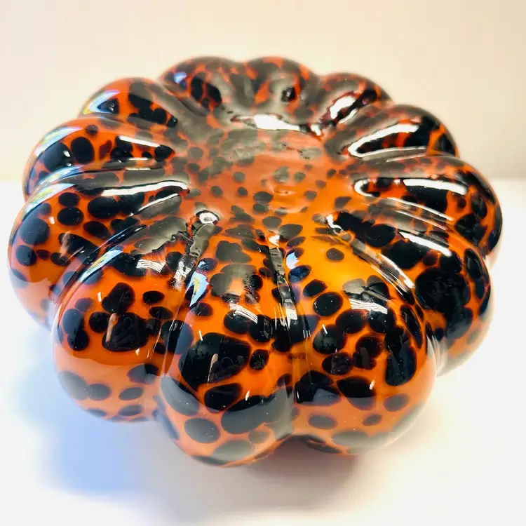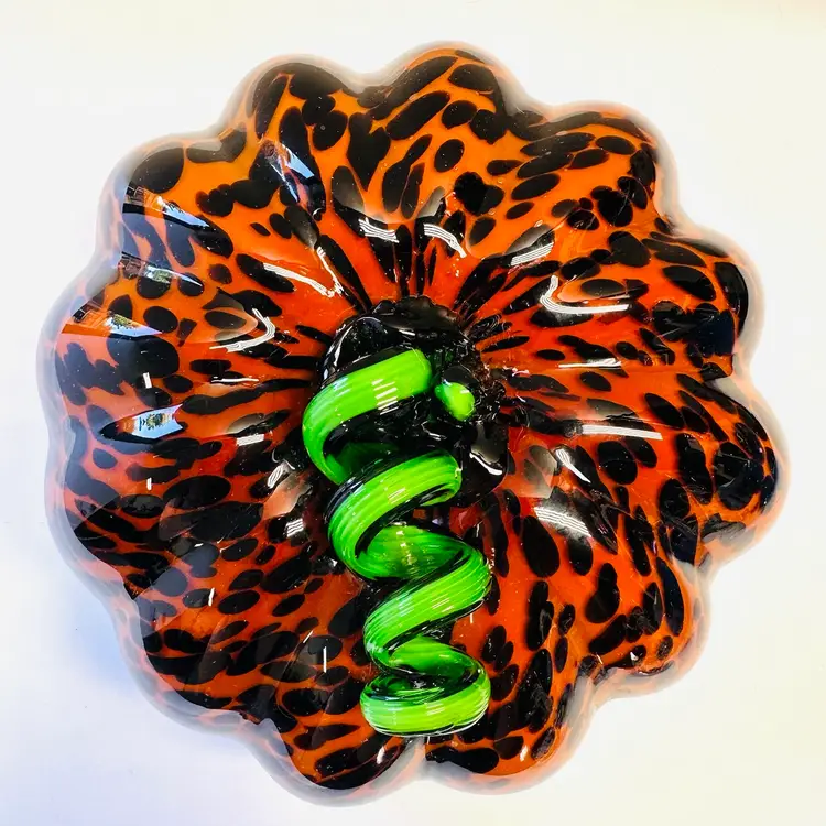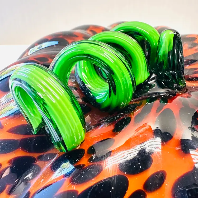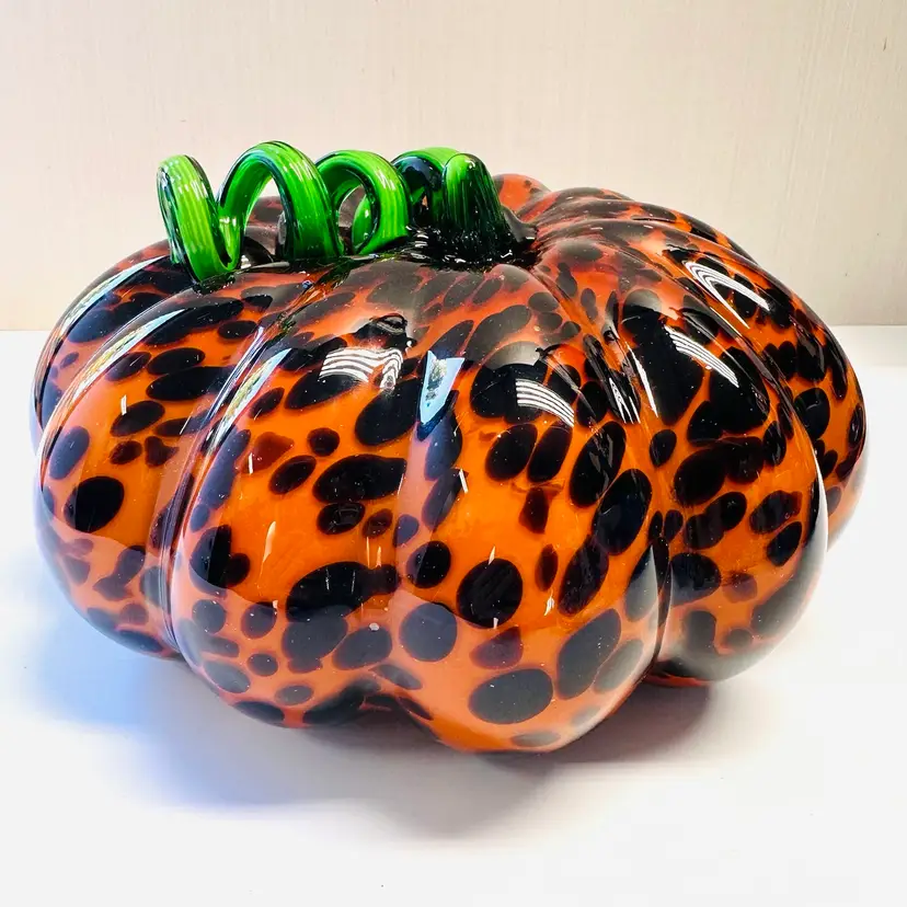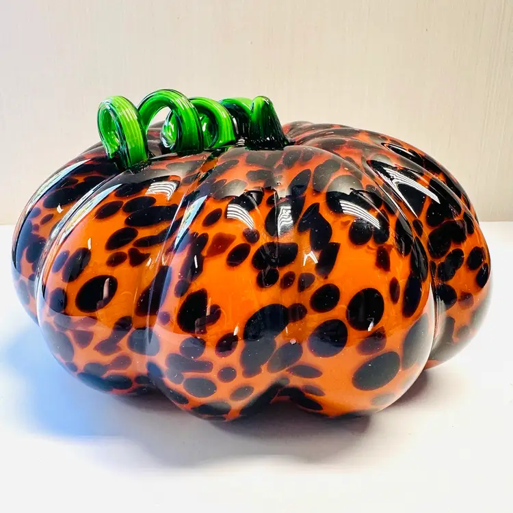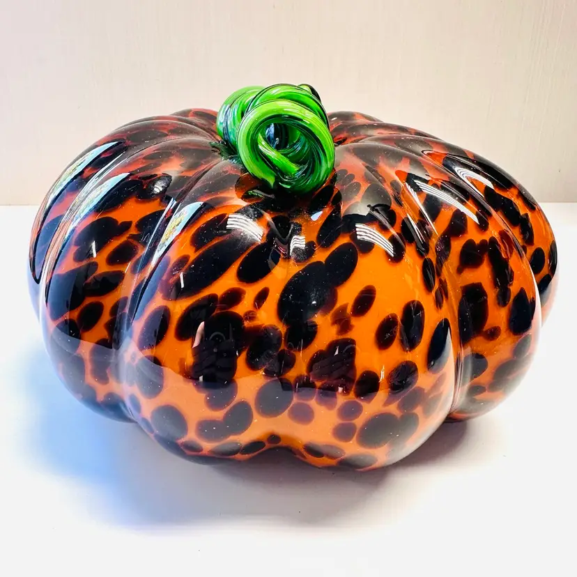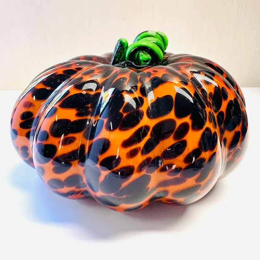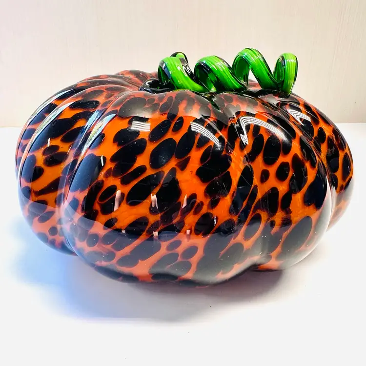 Previously owned art glass animal print glass pumpkin with green stem. There are no maker marks.