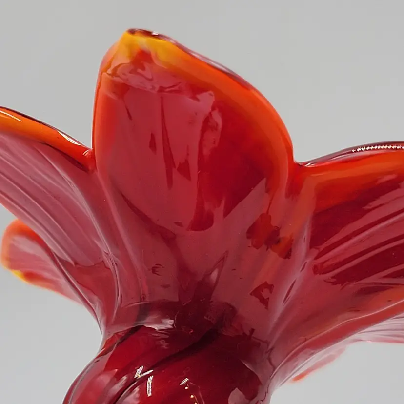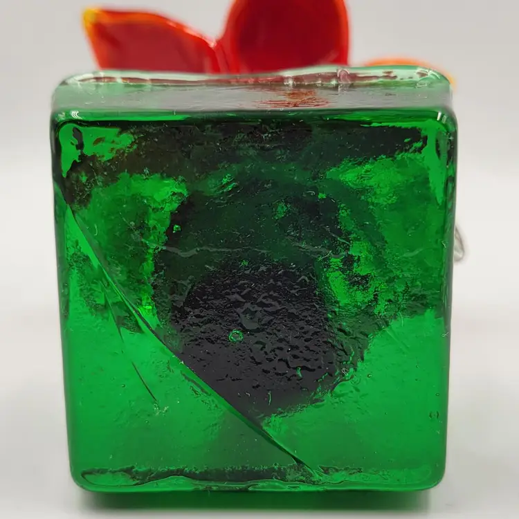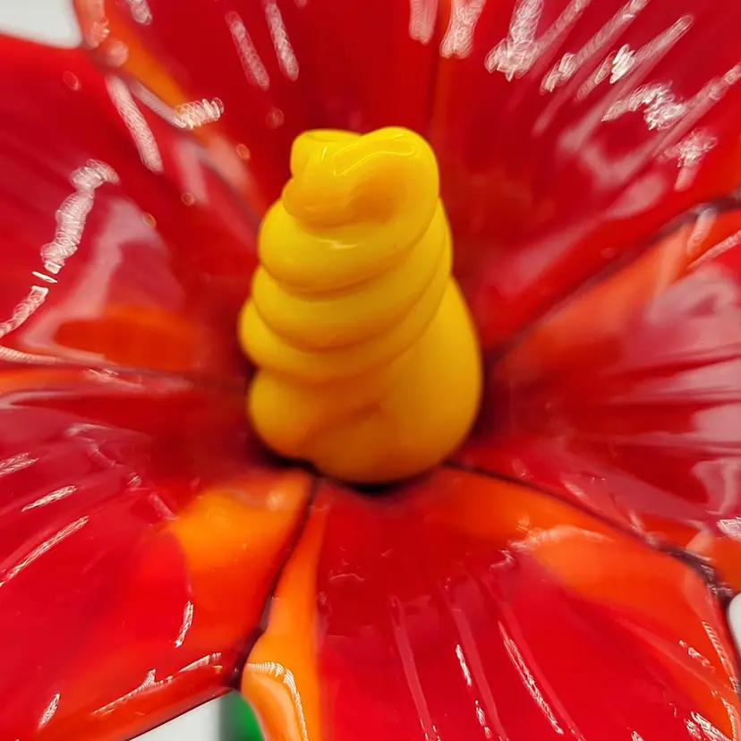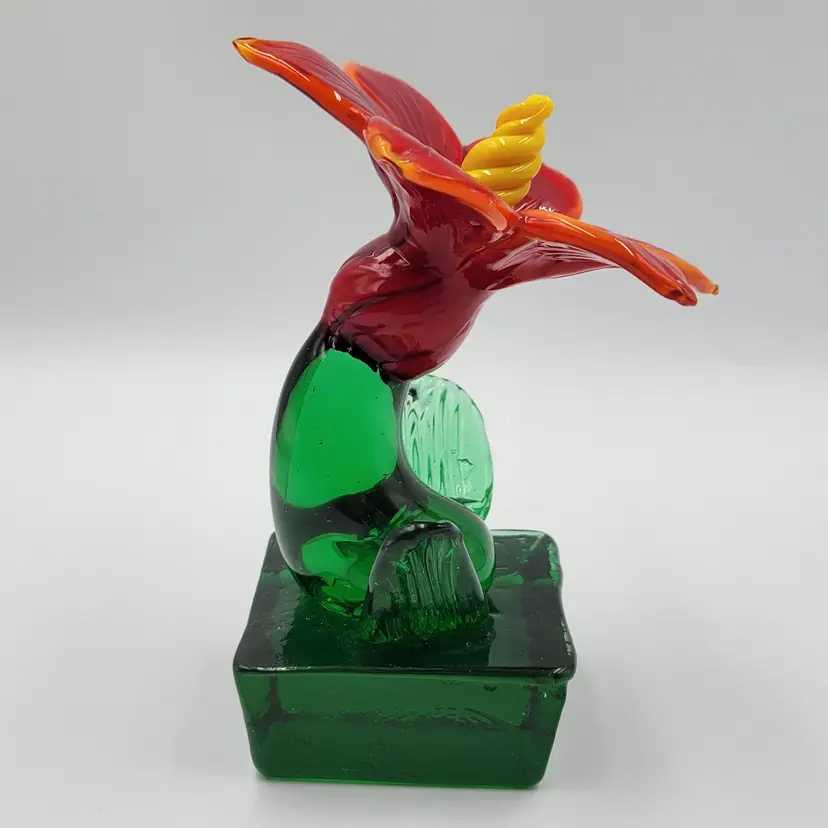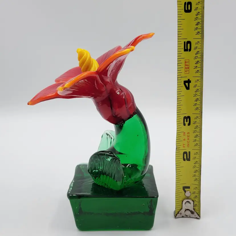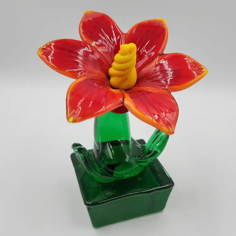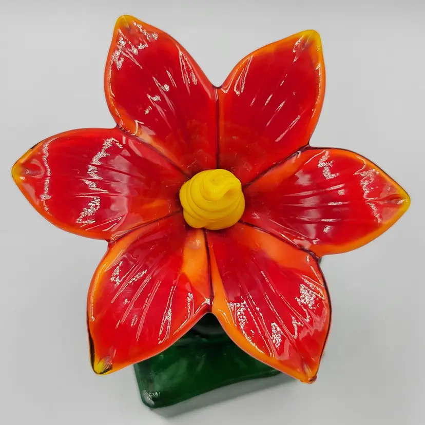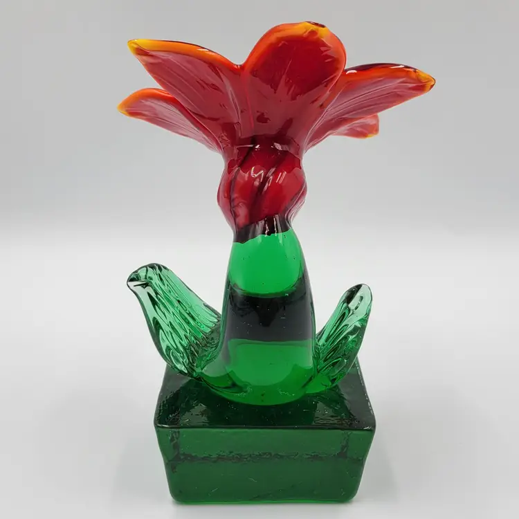 This is such a sweet piece. This large pulled red glass flower has a large green glass stem and leaves and it sits on a square green glass base. The center of the flower is twisted yellow glass. The edges of the flower and some of the yellow center glows under black light (see photos). This piece measures 5 1/8 inches tall. The flower measures 3 5/8 inches wide. There are no maker marks. There are no chips or cracks.