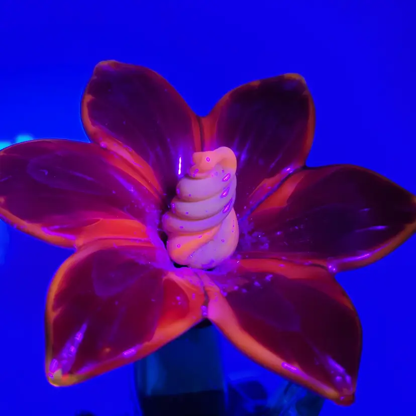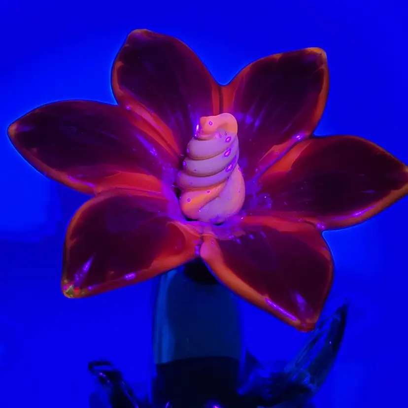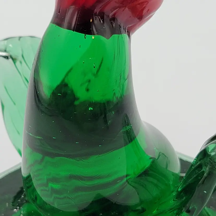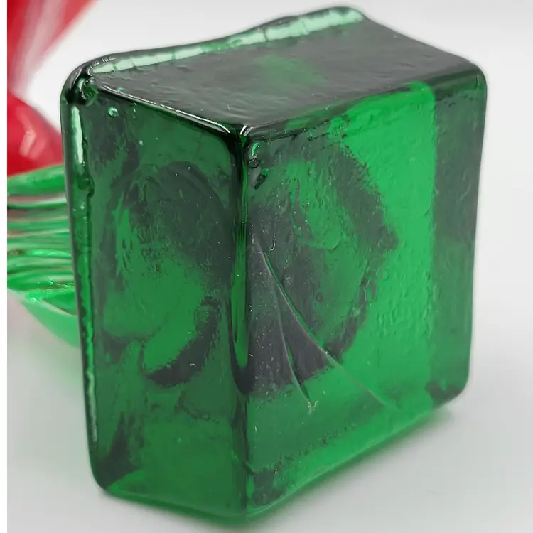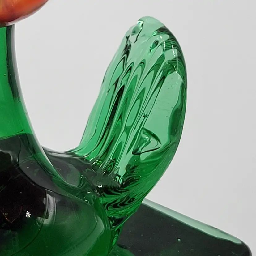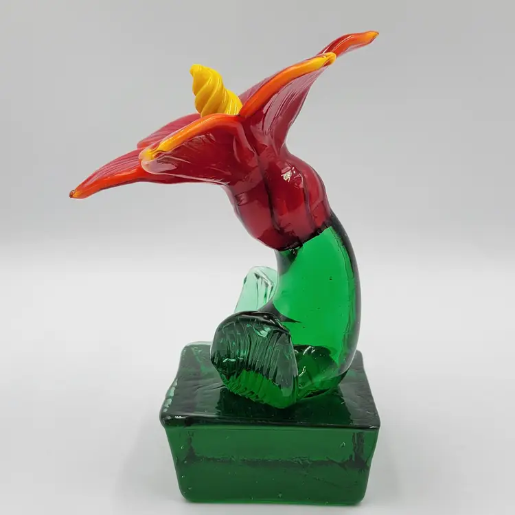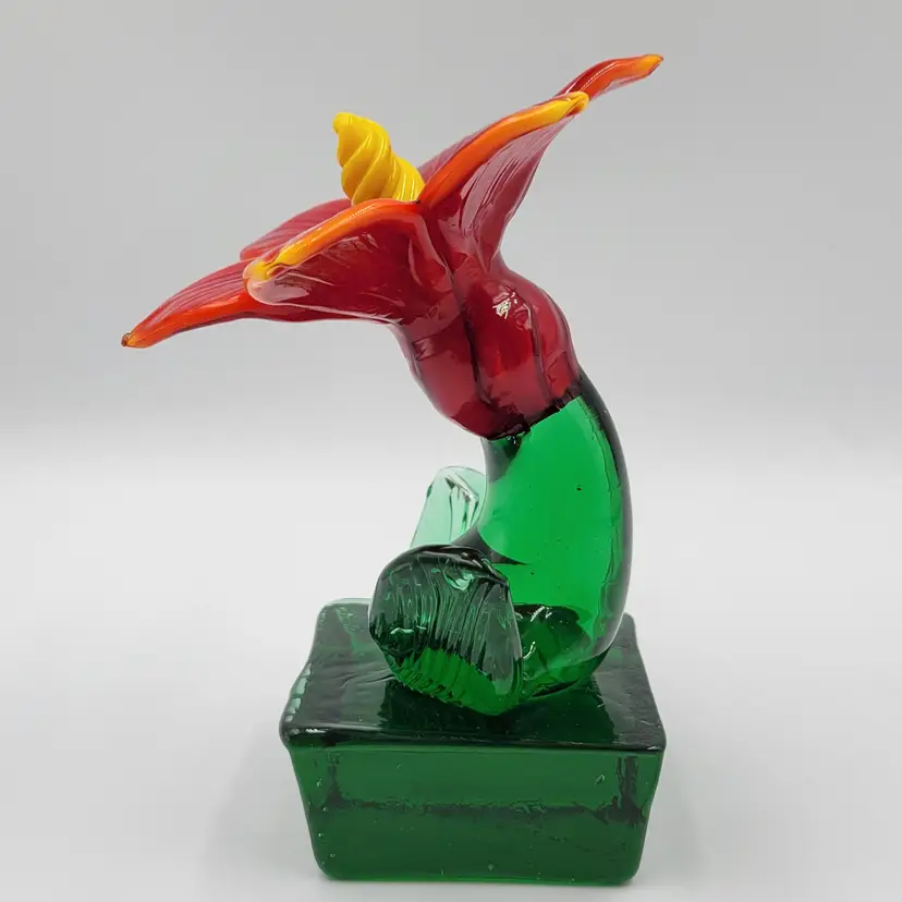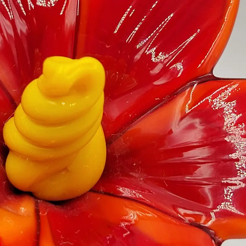 This is such a sweet piece. This large pulled red glass flower has a large green glass stem and leaves and it sits on a square green glass base. The center of the flower is twisted yellow glass. The edges of the flower and some of the yellow center glows under black light (see photos). This piece measures 5 1/8 inches tall. The flower measures 3 5/8 inches wide. There are no maker marks. There are no chips or cracks.
