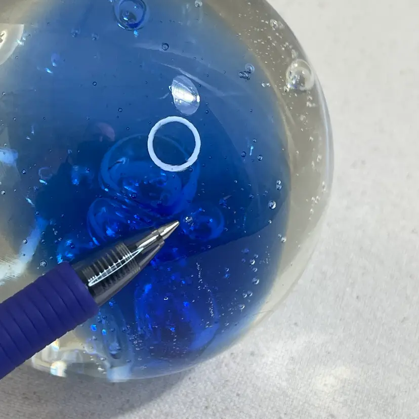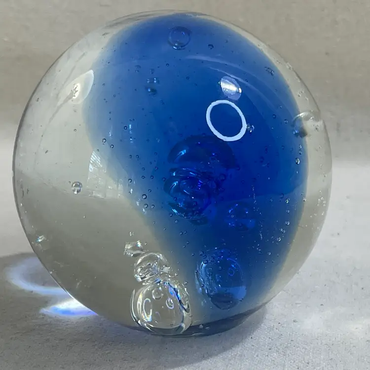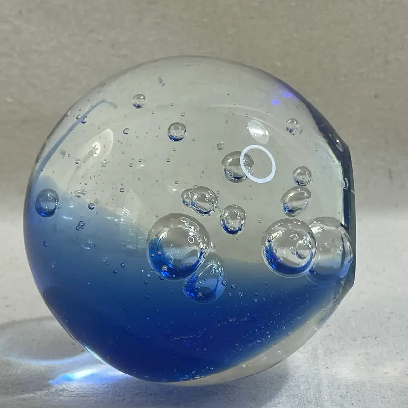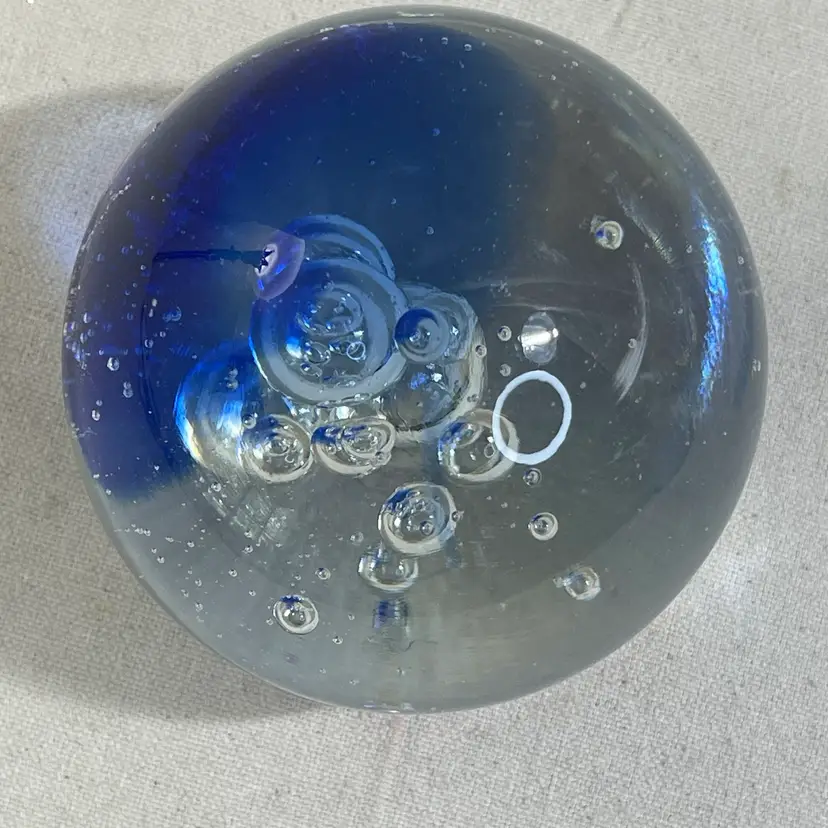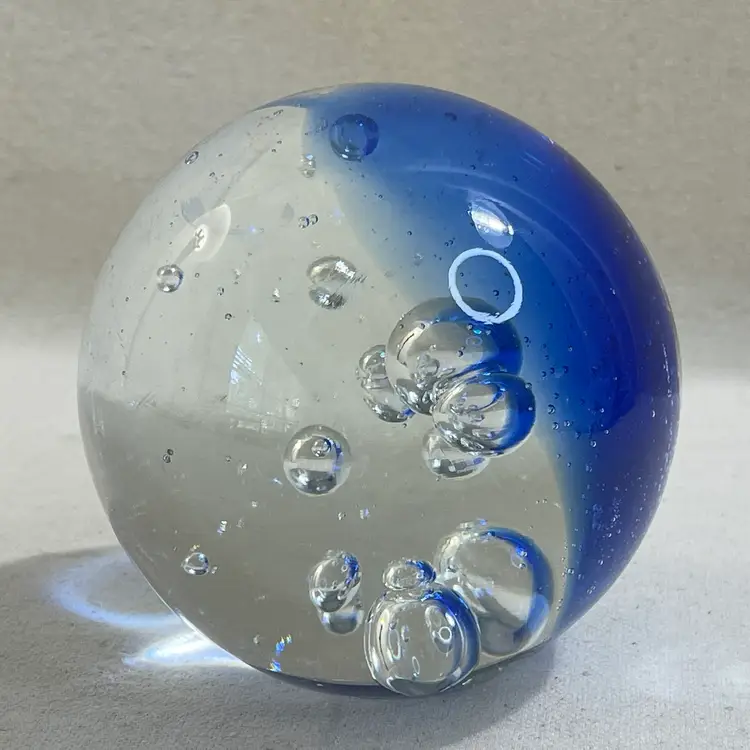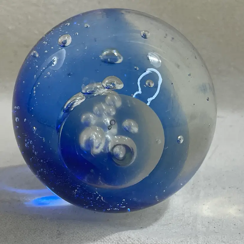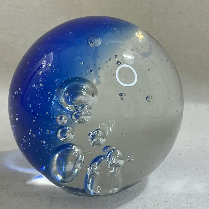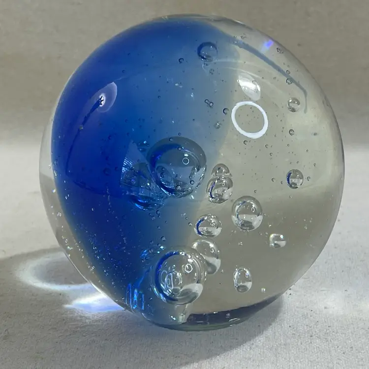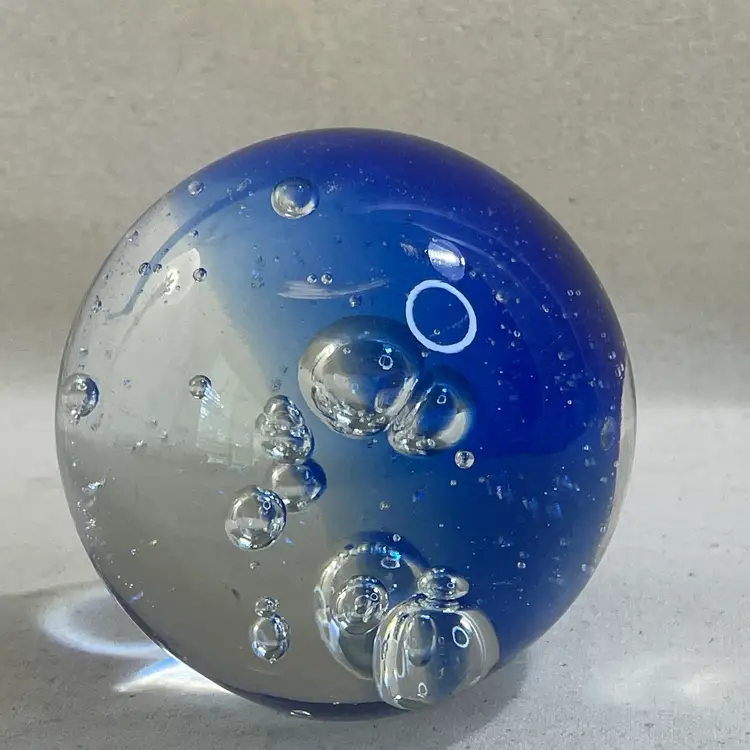 This art glass paperweight is a unique addition to any collection. The cobalt blue color and clear bubbles are mesmerizing 3” Heavy One tiny flea bit nick on the surface - could be from the glass making process