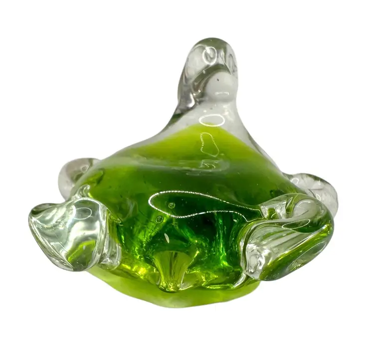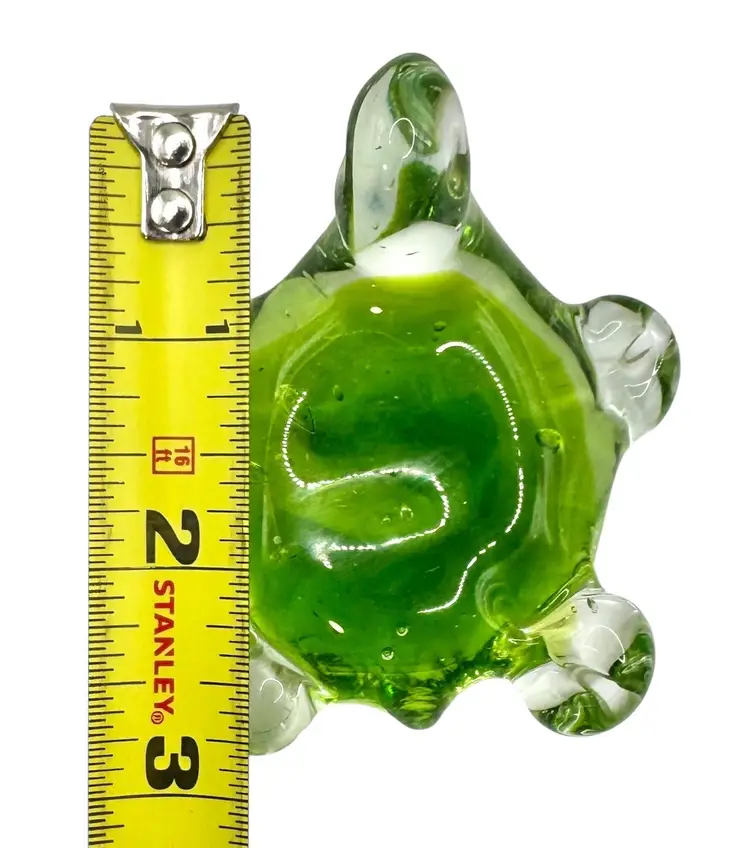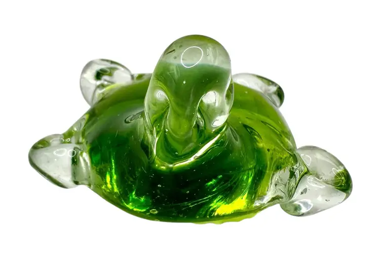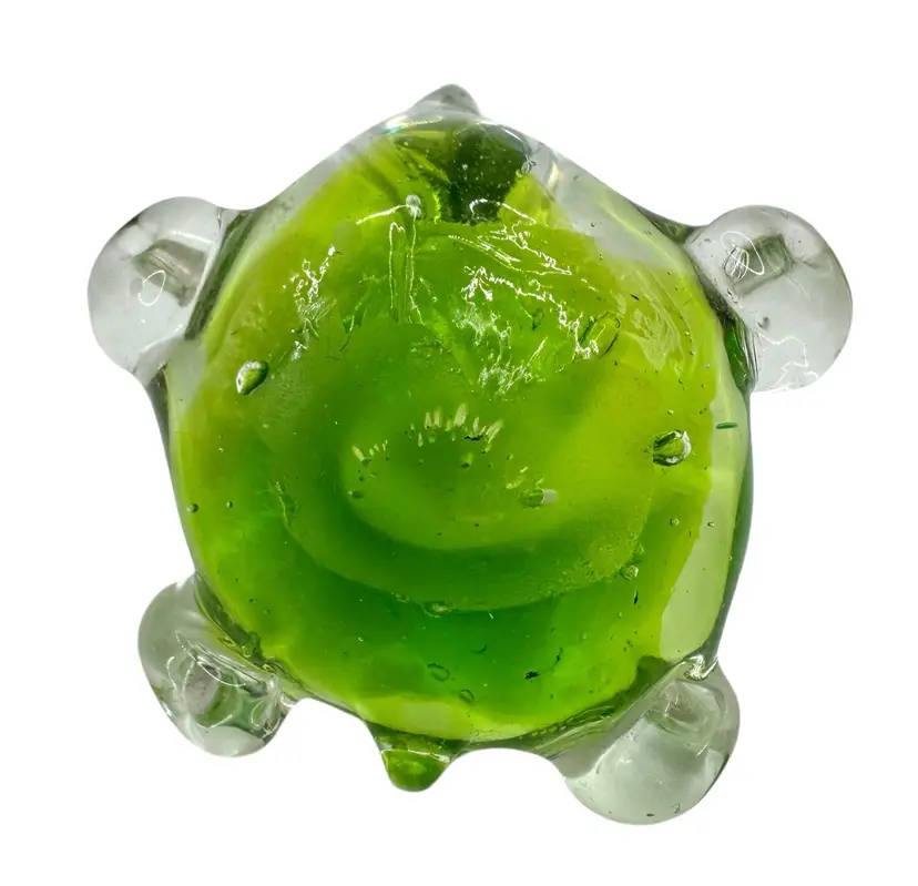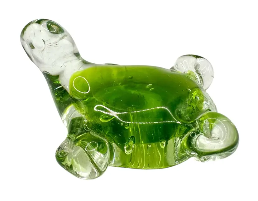 Small paperweight of a turtle. It is clear with lime green on the inside.