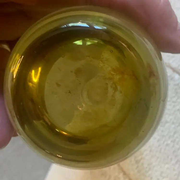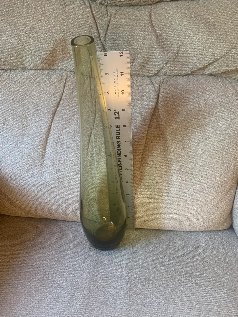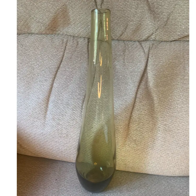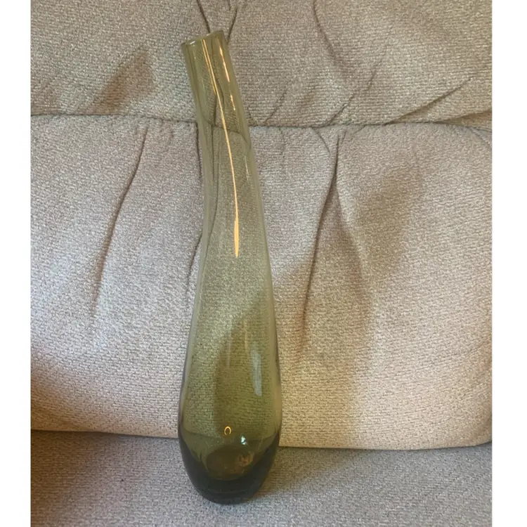 This art glass vase is olive green in color and is sleek with a slight turn near the top. It is about 13 inches tall and 3 inches wide. The bottom has a smooth lip and is slightly recessed inside the lip. There are no chips or cracks and it is unmarked.