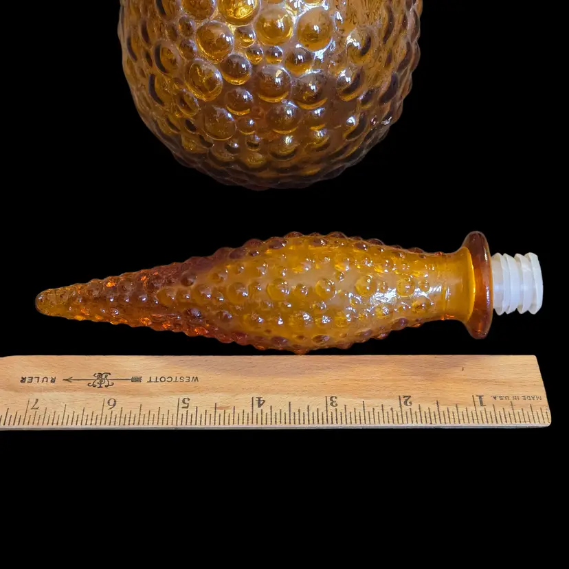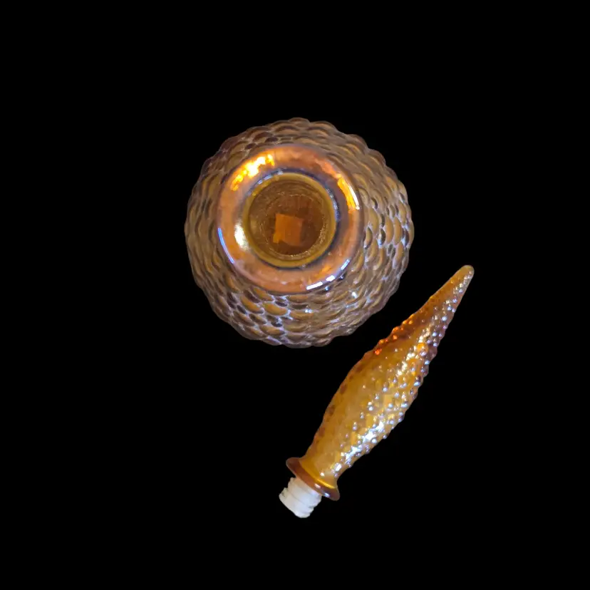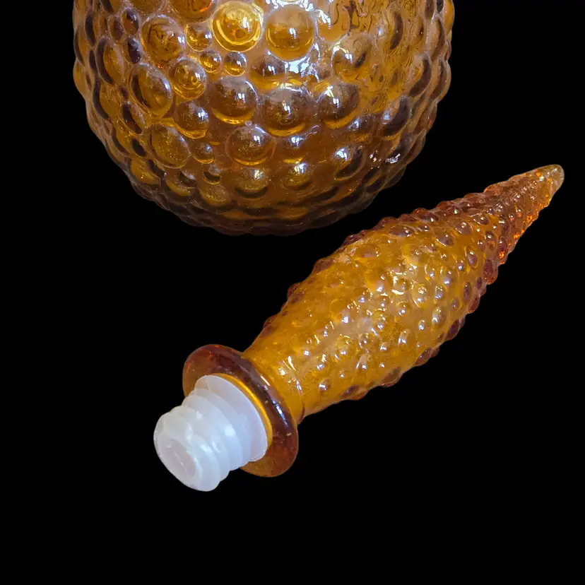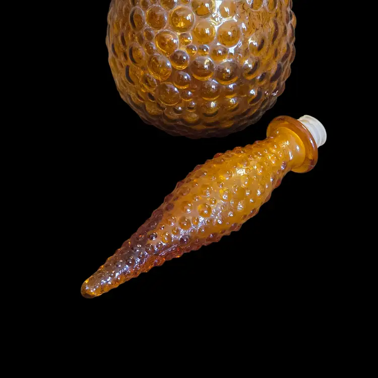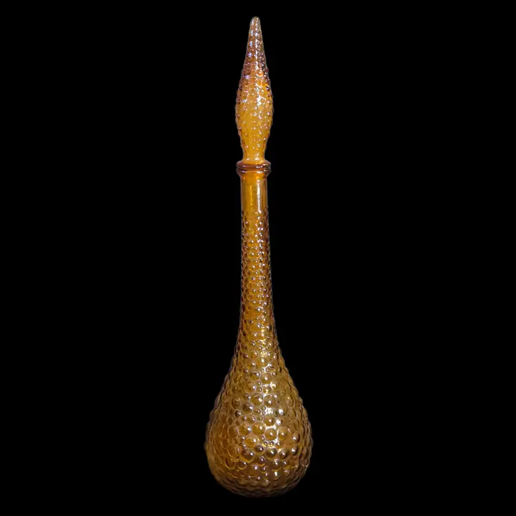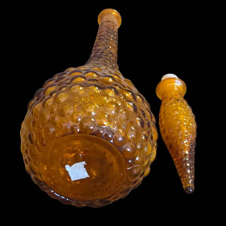 Art Glass Stoppered Genie Bottle Empoli Amber Bubble Bumps 22" Tall 1960s Vintage. Used condition with the only flaw I see is the plastic seal on the bottom of the stopper has some compression yet fits well, sticker on bottom of the bottle otherwise looks good for its age. Please view all the photos and please ask any questions prior to purchase when possible.