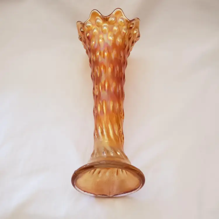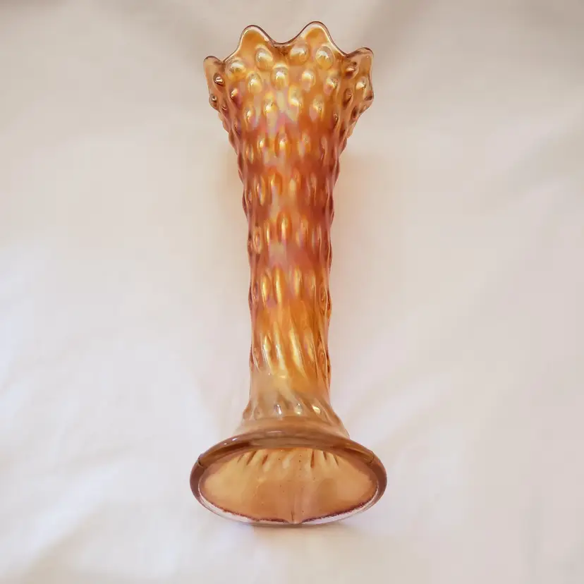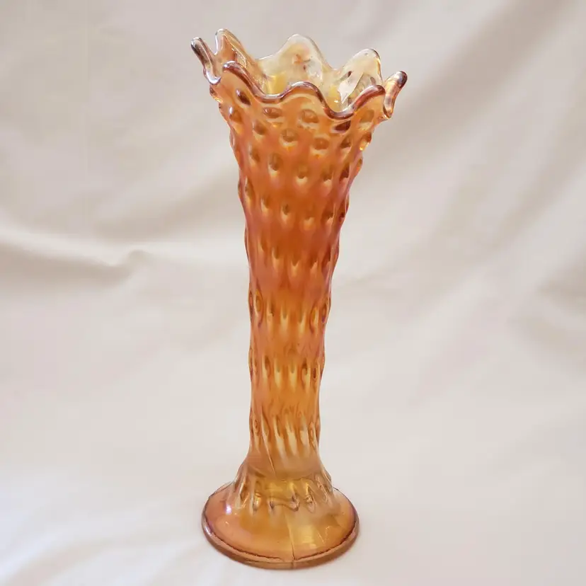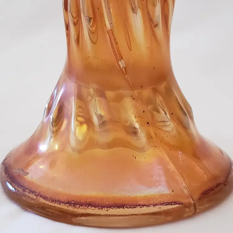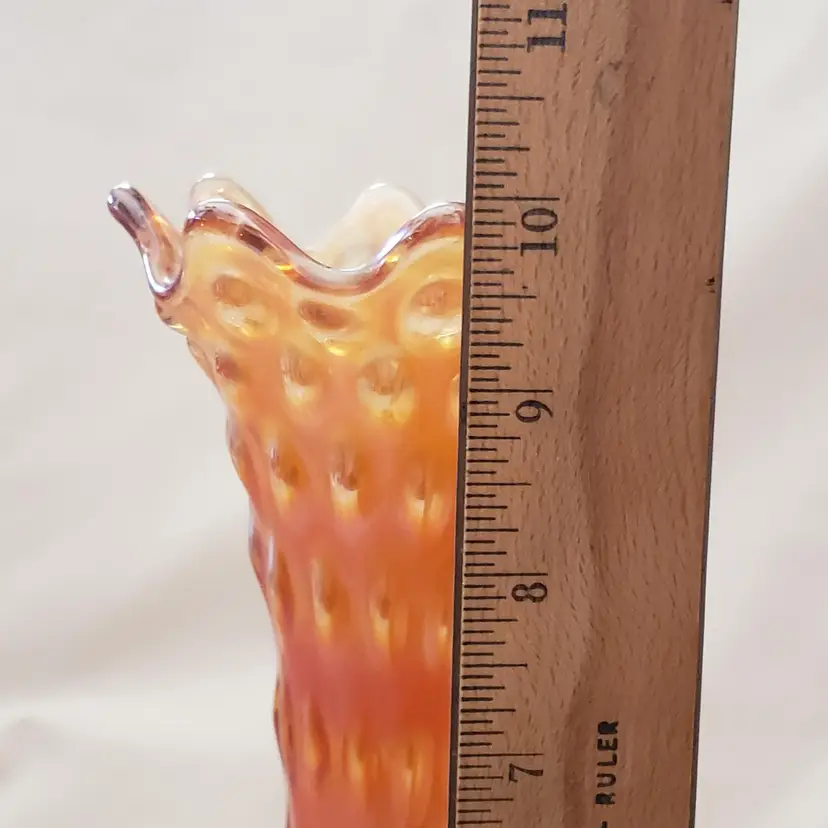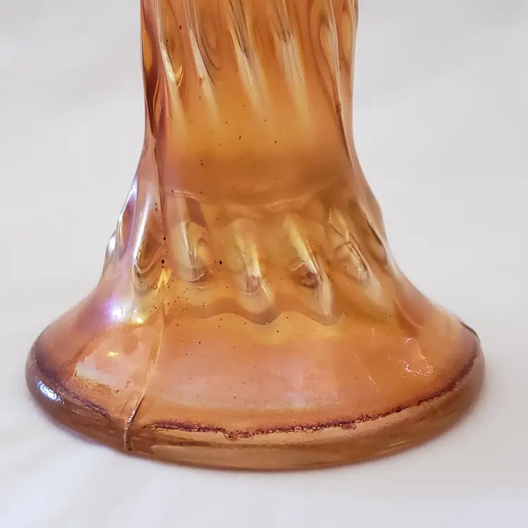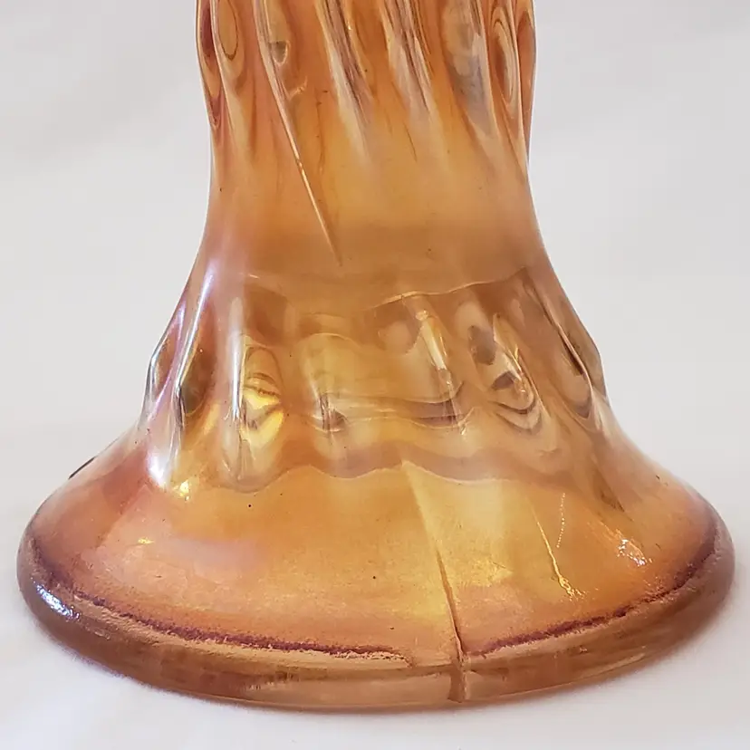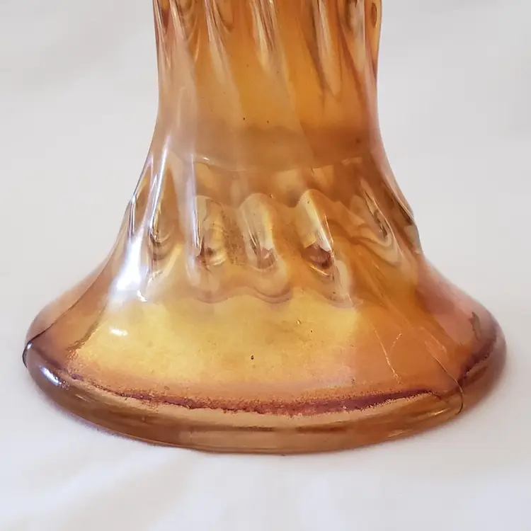 Art Glass Swung Vase Pulled Top Gold Carnival 10" Flare Rim Tree Bark with Issues. Used condition with gold color pooling on outside bottom base, sticker residue, at least one fleabite towrd bottom, seams are raised, dirty, etc. Please view all the photos and read the entire item description and please ask any questions prior to purchase when possible.