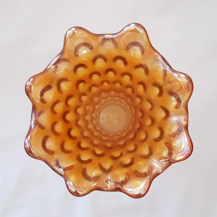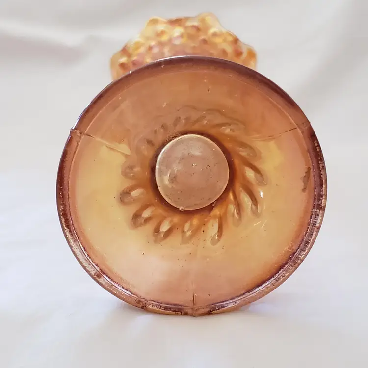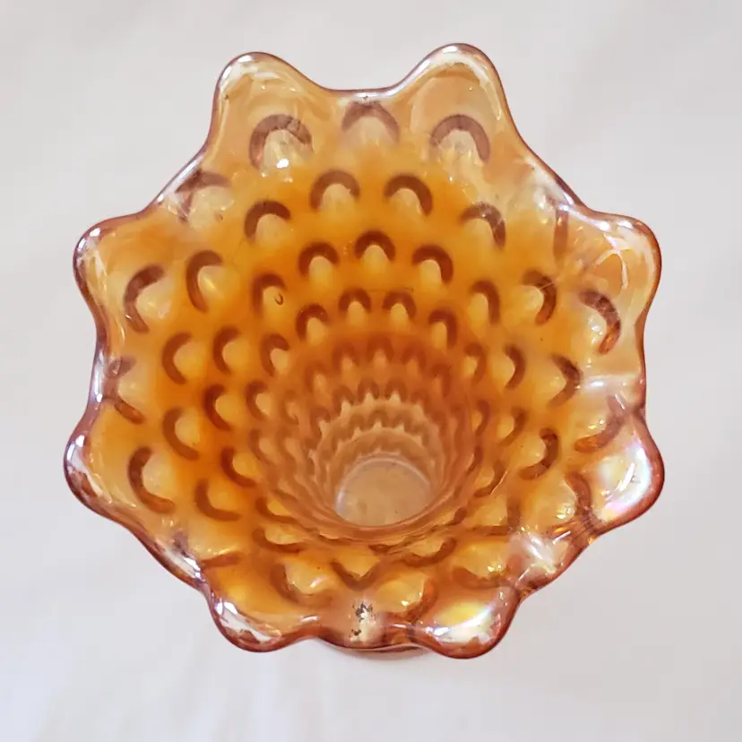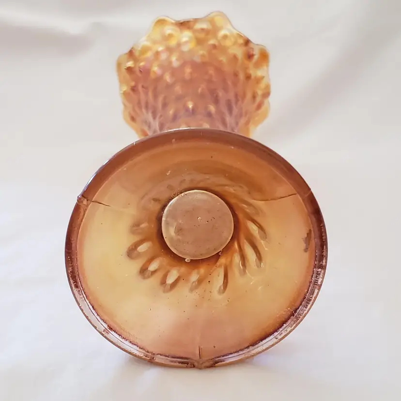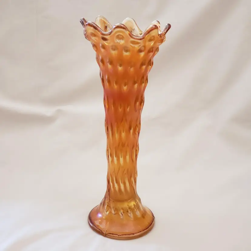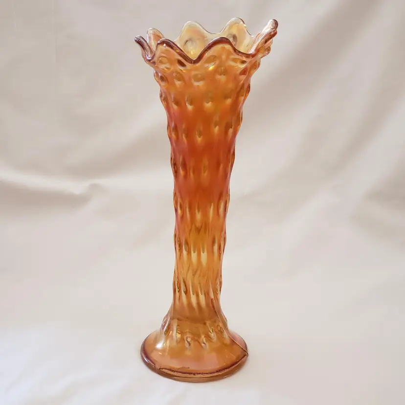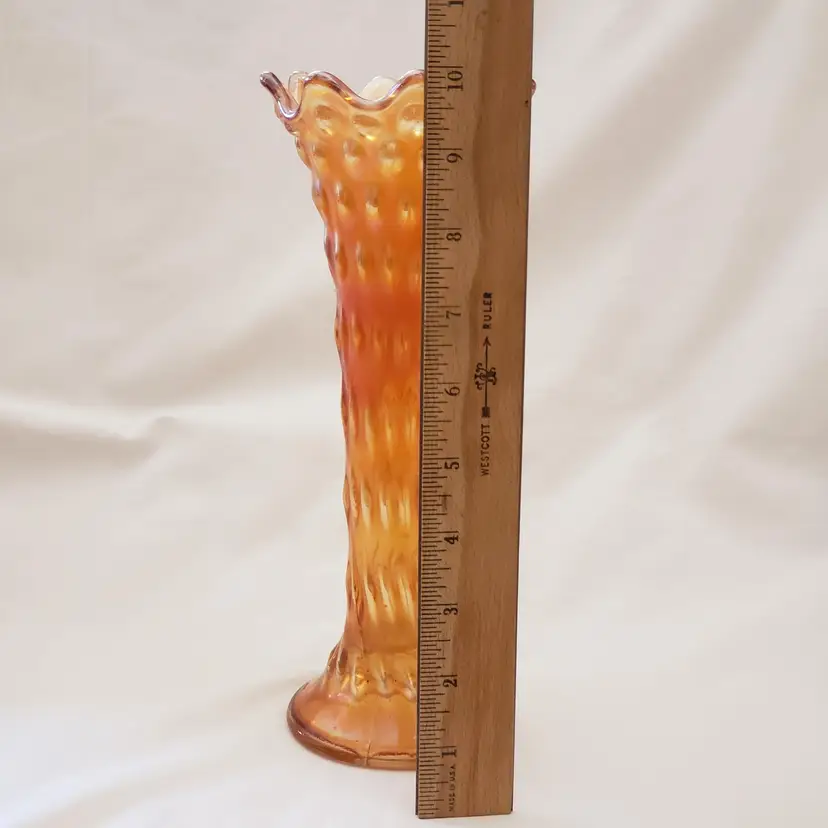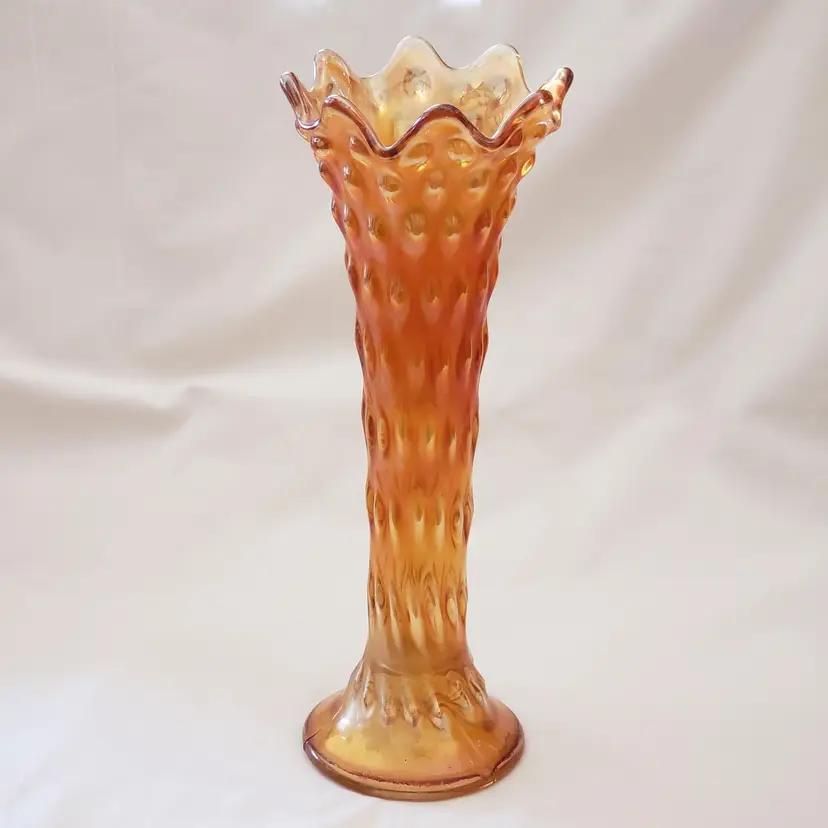 Art Glass Swung Vase Pulled Top Gold Carnival 10" Flare Rim Tree Bark with Issues. Used condition with gold color pooling on outside bottom base, sticker residue, at least one fleabite towrd bottom, seams are raised, dirty, etc. Please view all the photos and read the entire item description and please ask any questions prior to purchase when possible.