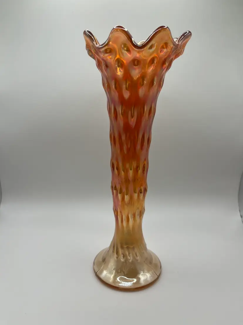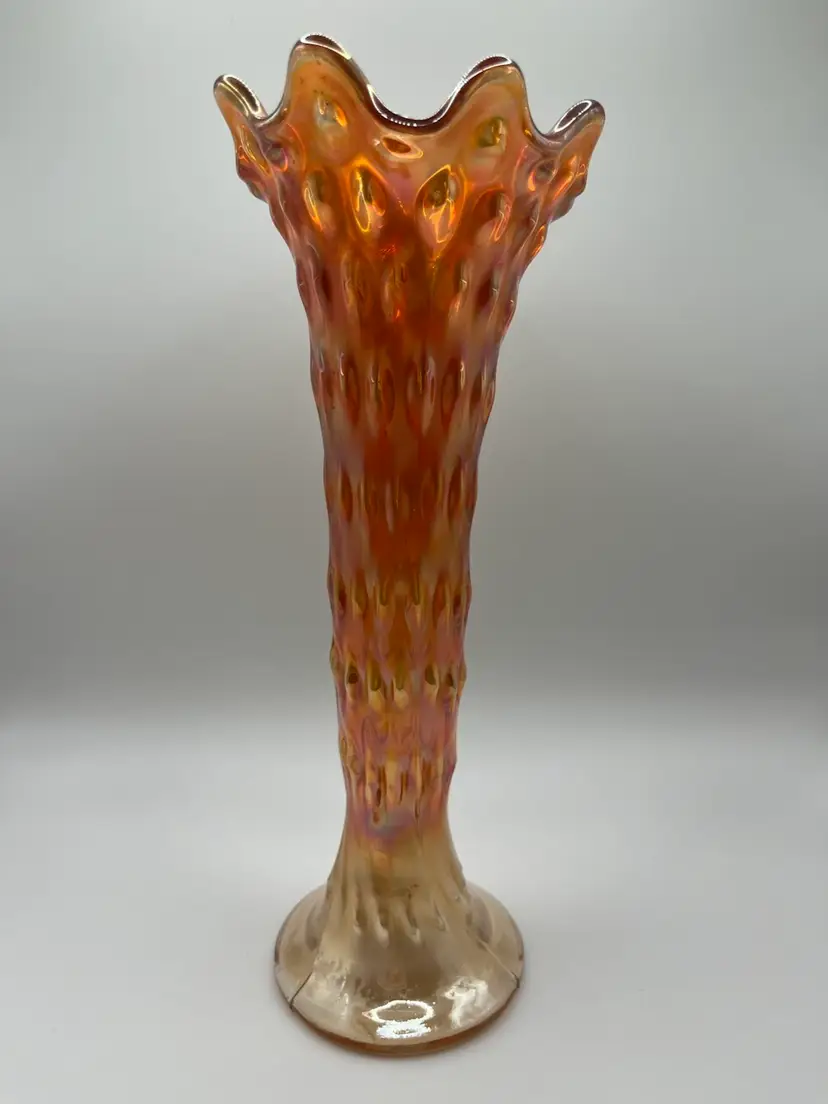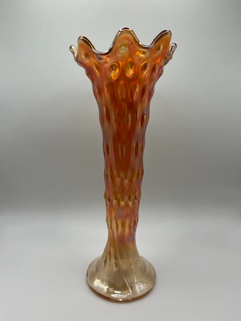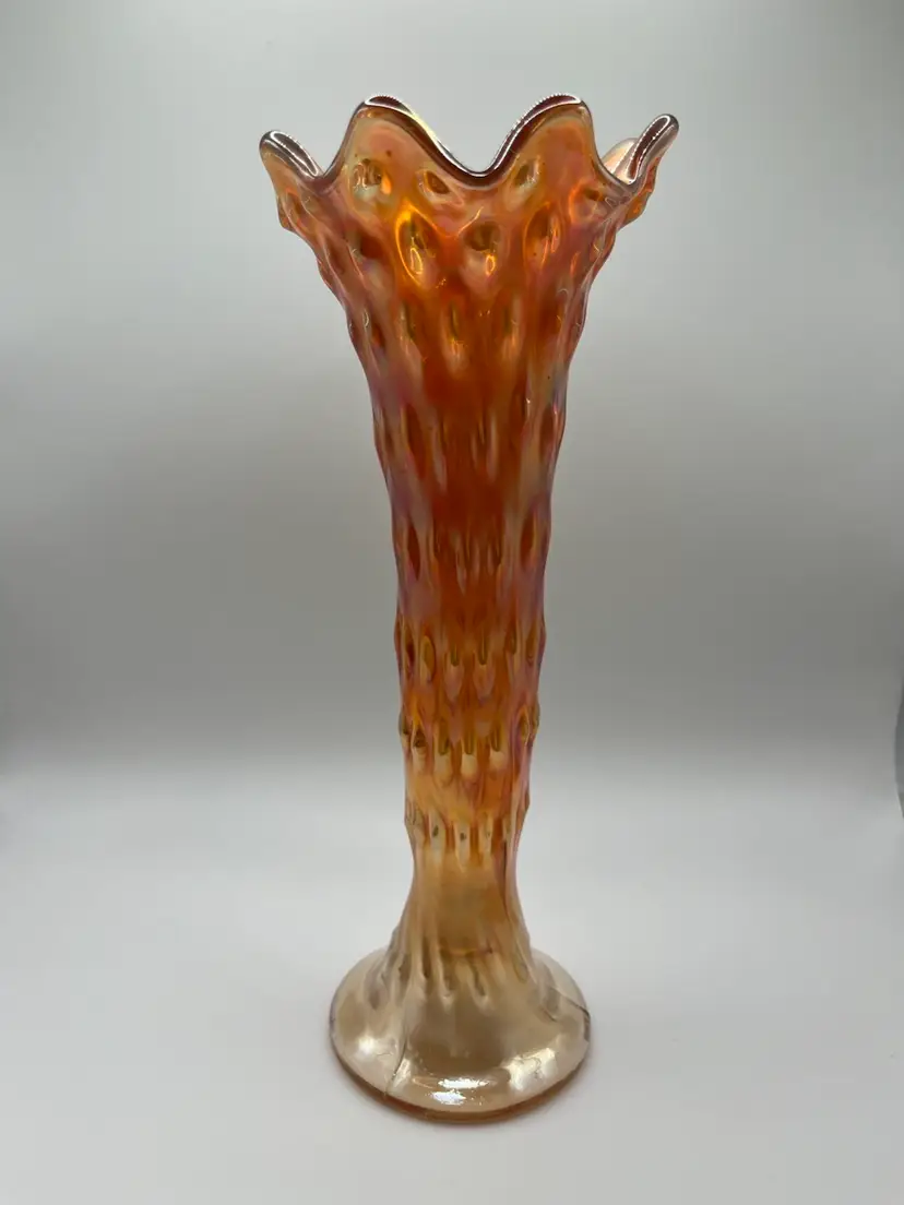 Vintage Fenton Art Glass Marigold Vase. It is a swung vase in the "Tree Bark" or "Ripple" pattern. 10 1/2” tall No chips or cracks.