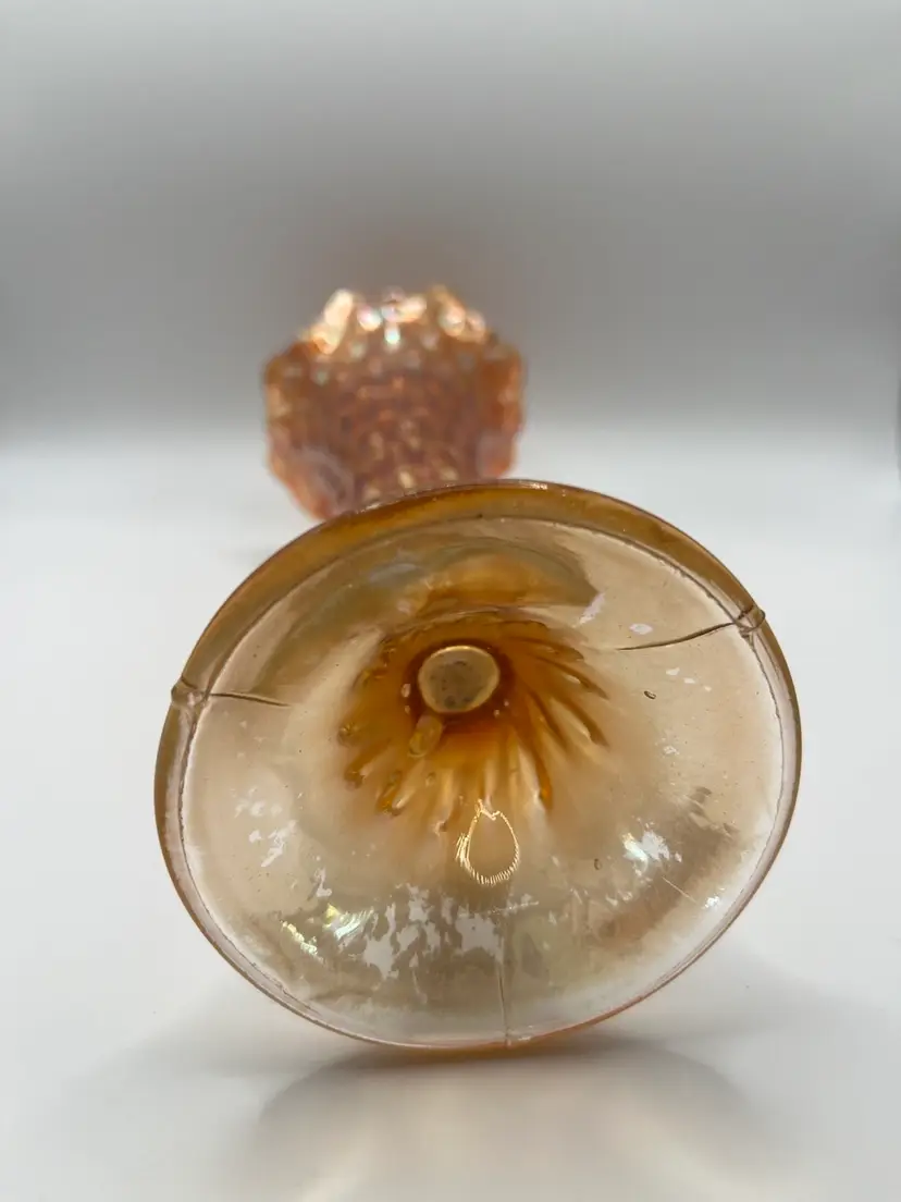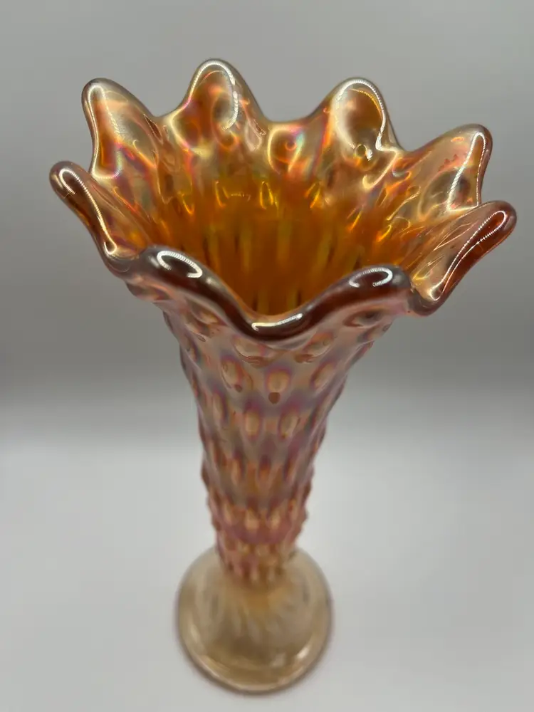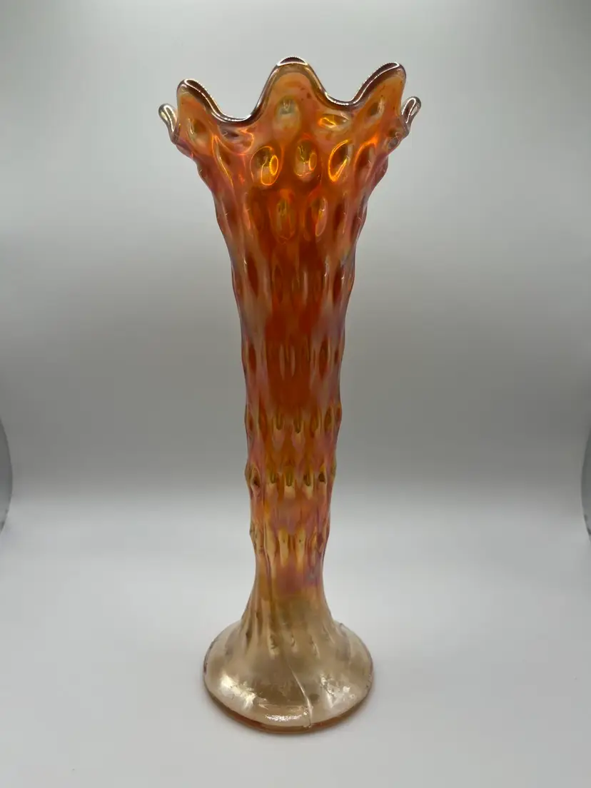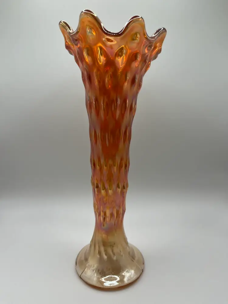 Vintage Fenton Art Glass Marigold Vase. It is a swung vase in the "Tree Bark" or "Ripple" pattern. 10 1/2” tall No chips or cracks.