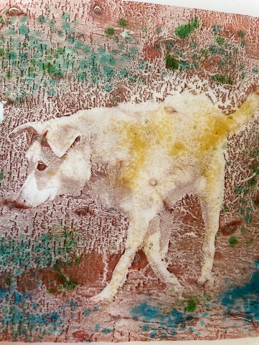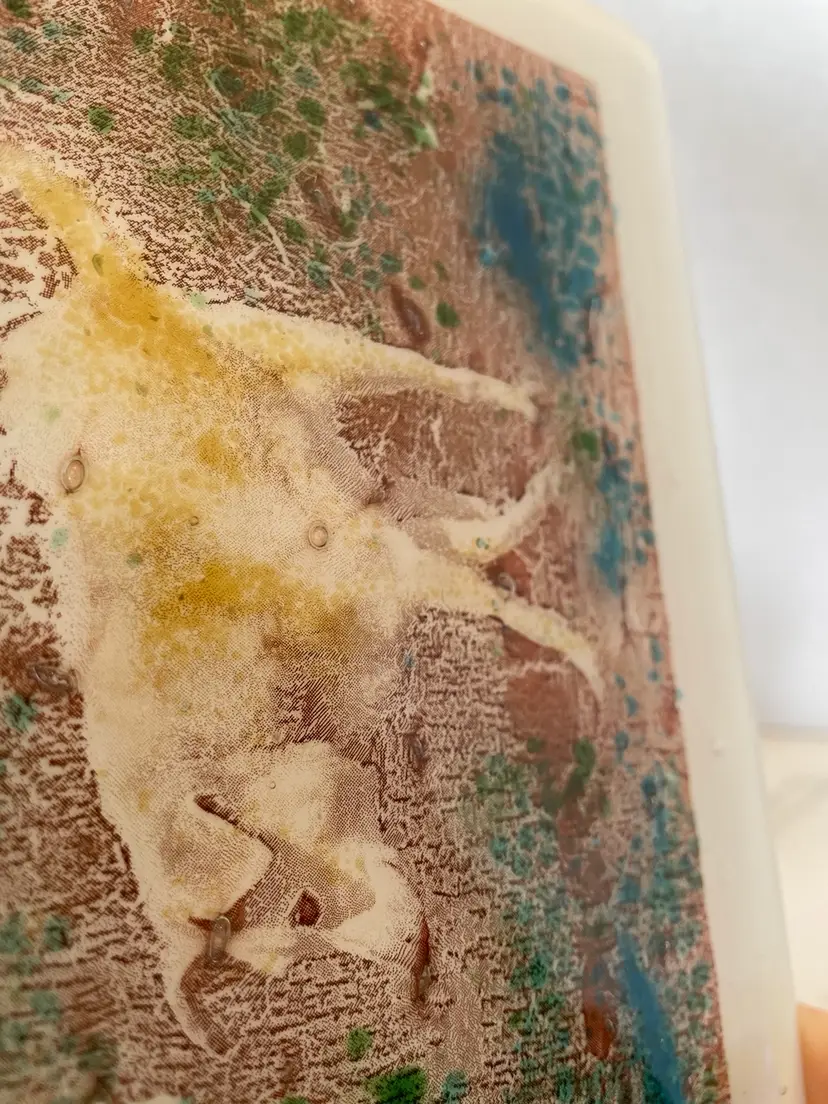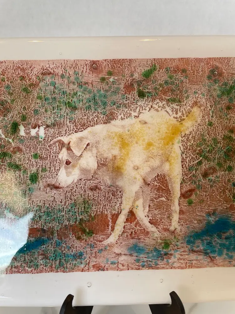 Unique art, glass, yellow lab or golden retriever dog plaque tile is fused glass with a 3-D effect hard to get photos of the depth. Very unique no marks or signatures no chips or cracks. Will combine shipping in photo is for reference of size.