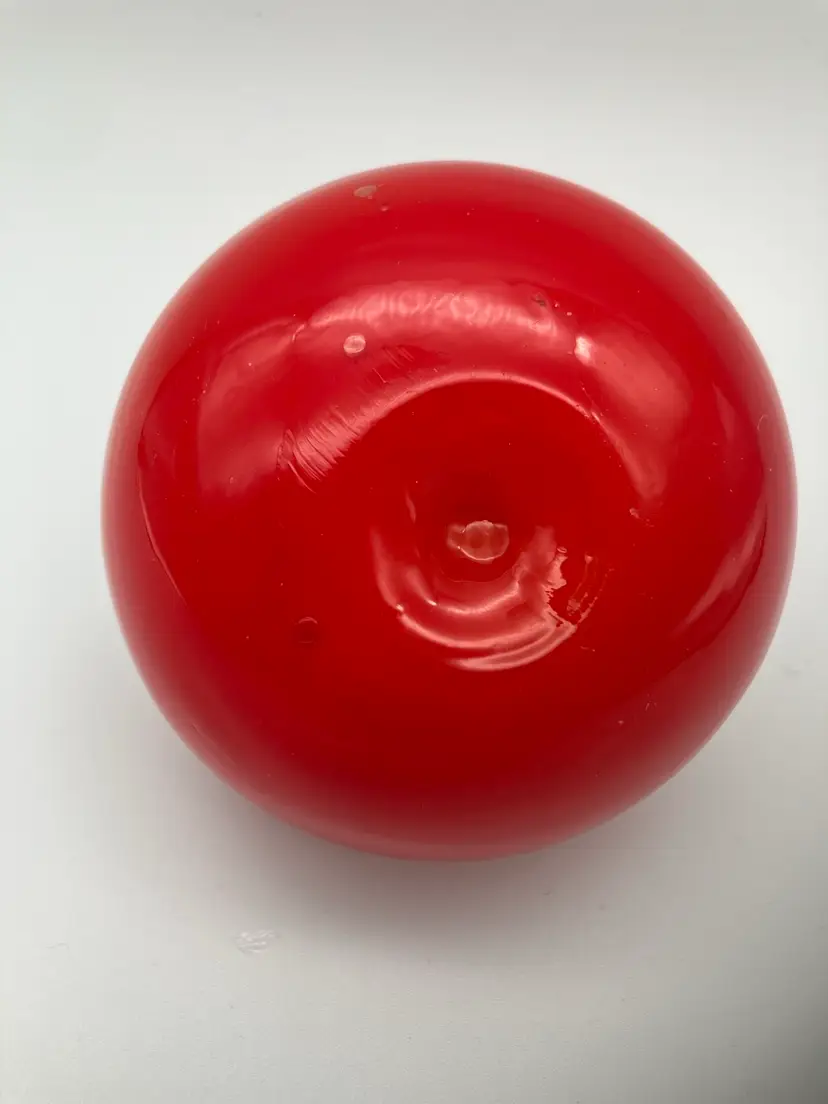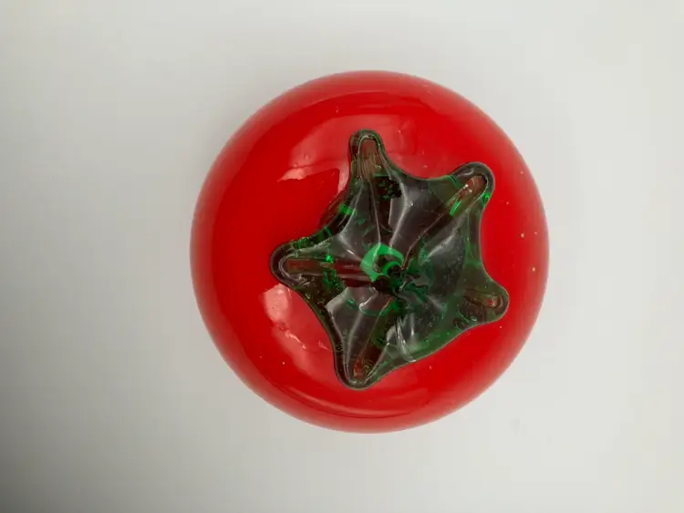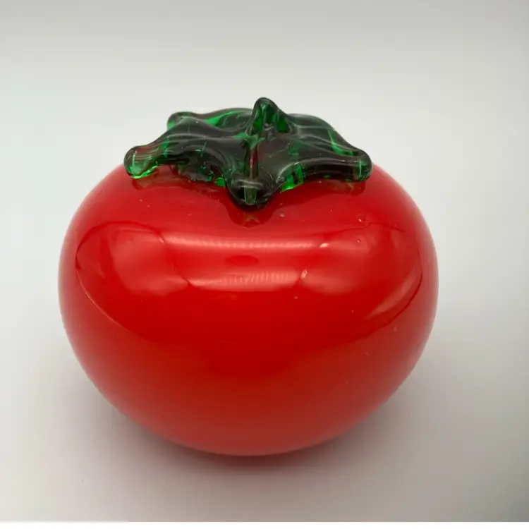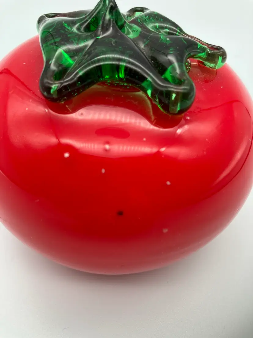 Measures 3.25” diameter by 3” tall. No chips or cracks, but some bubbles and imperfections in the glass (which kinda’ sorta’ makes it look more like a real 🍅 tomato.)