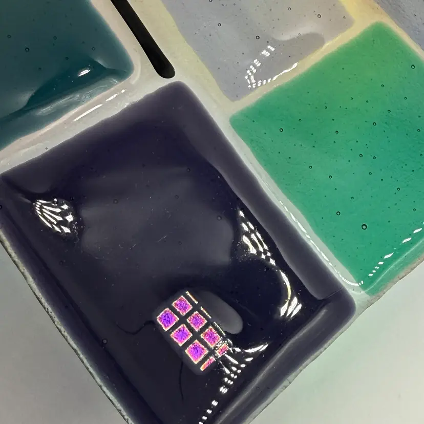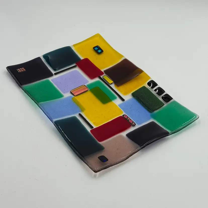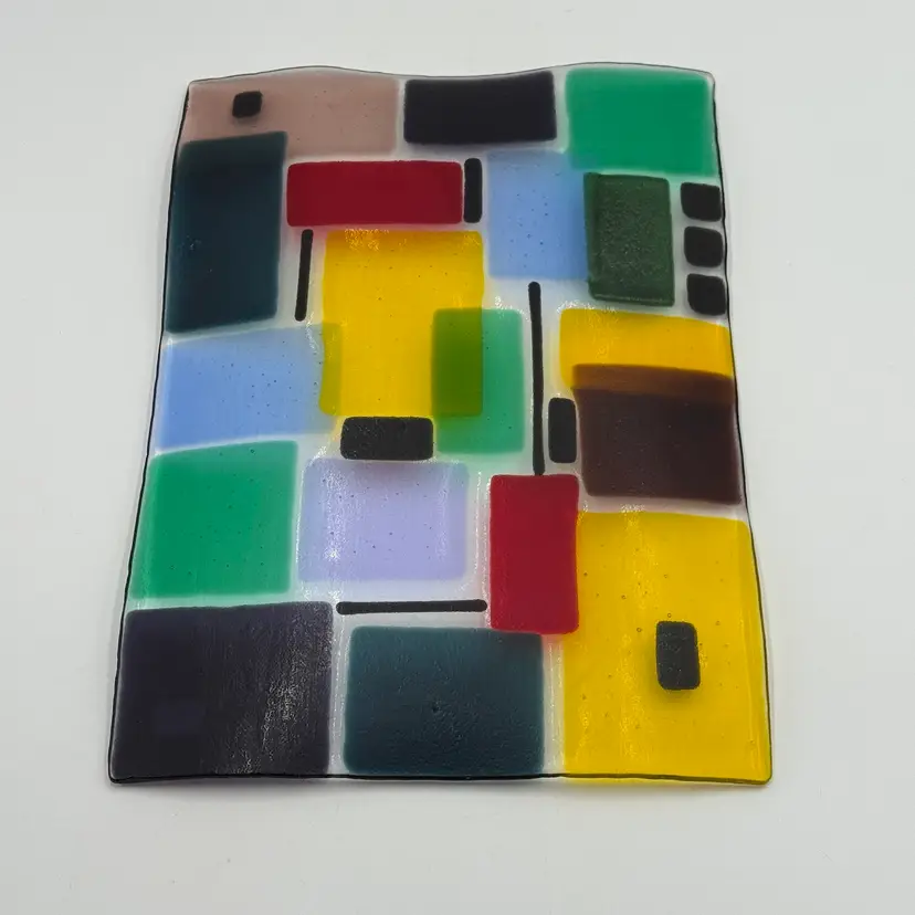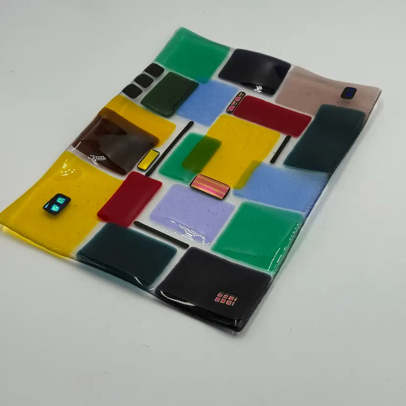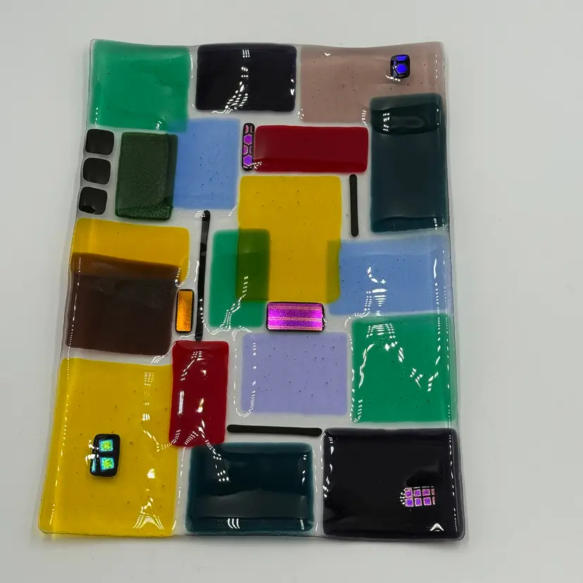 In good condition. Does not have any chips or cracks. Colorful design with dichroic accents. Measures 10 1/4 inches long and 7 1/2 inches wide.