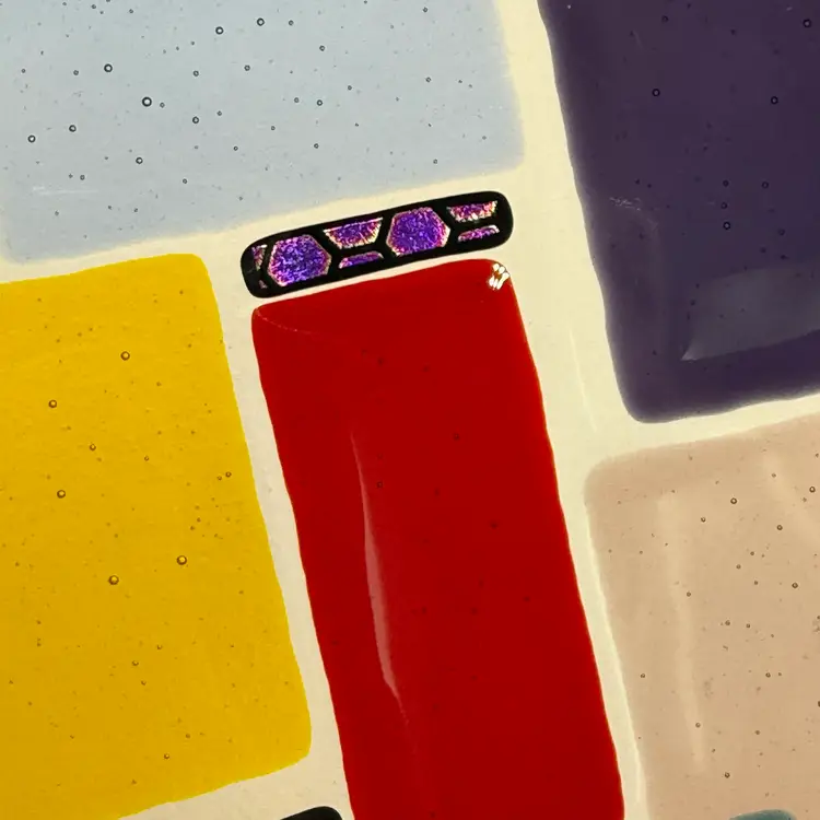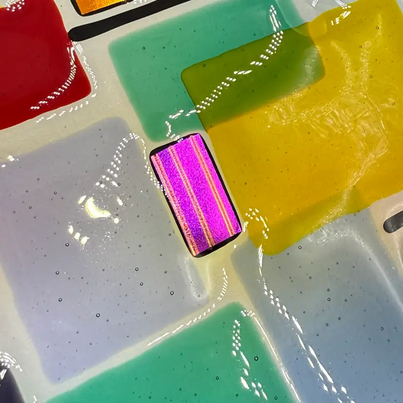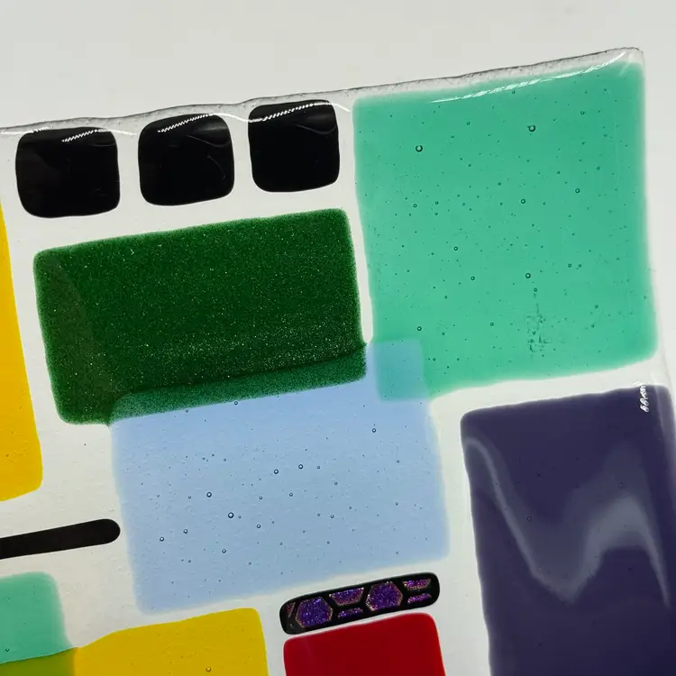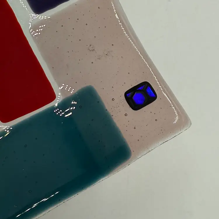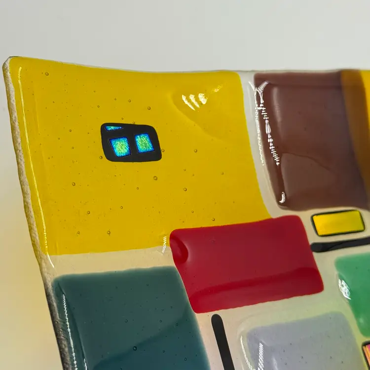 In good condition. Does not have any chips or cracks. Colorful design with dichroic accents. Measures 10 1/4 inches long and 7 1/2 inches wide.