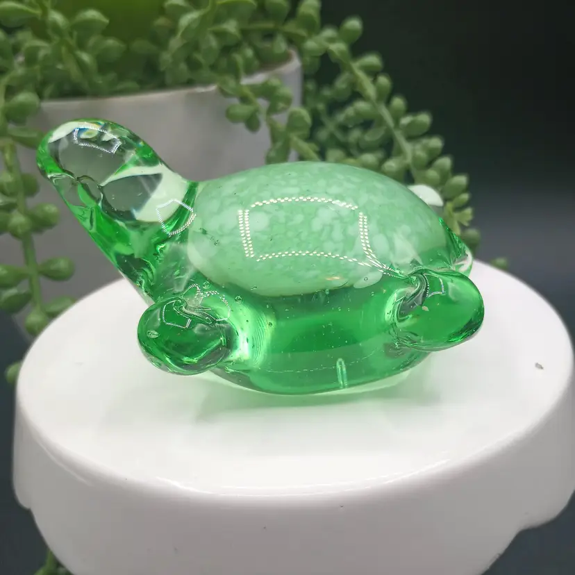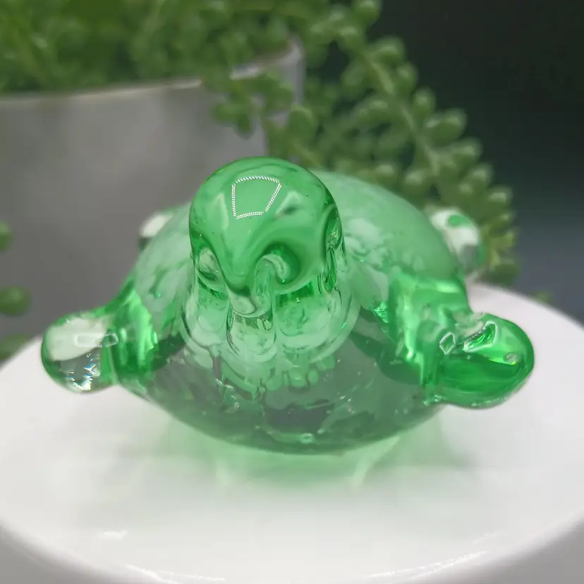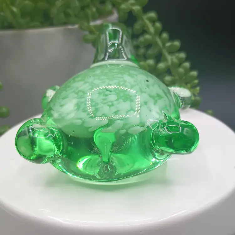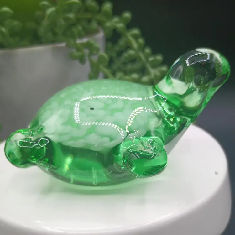 This beautiful art glass turtle paperweight was crafted in China for Beachcombers International. Its vibrant green color and intricate production style make it a unique addition to any collection. The turtle is made of high-quality glass and is perfect for any lover of decorative pottery and glassware. Whether you're a collector or just looking for a unique piece to add to your home, this turtle paperweight is sure to impress.