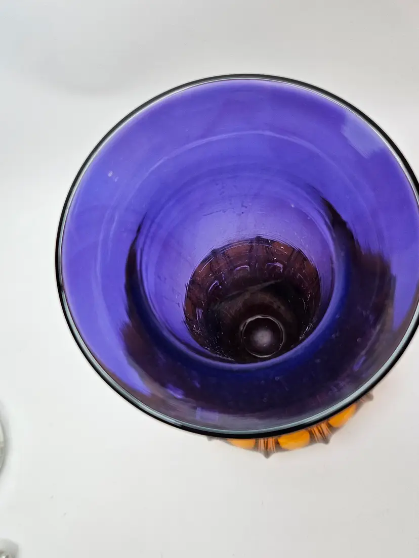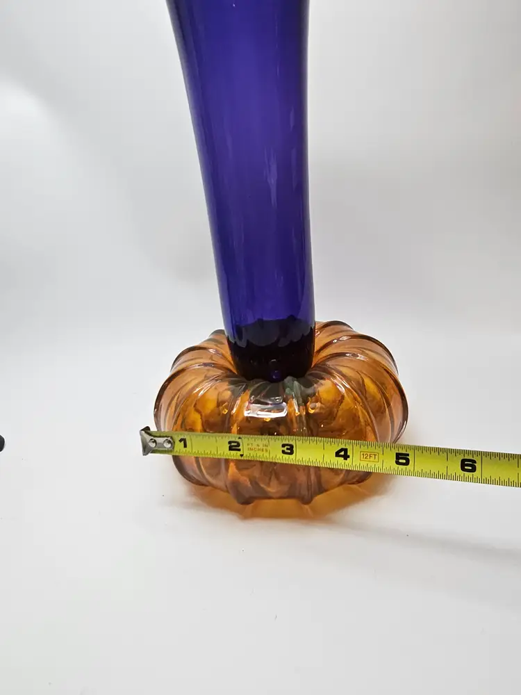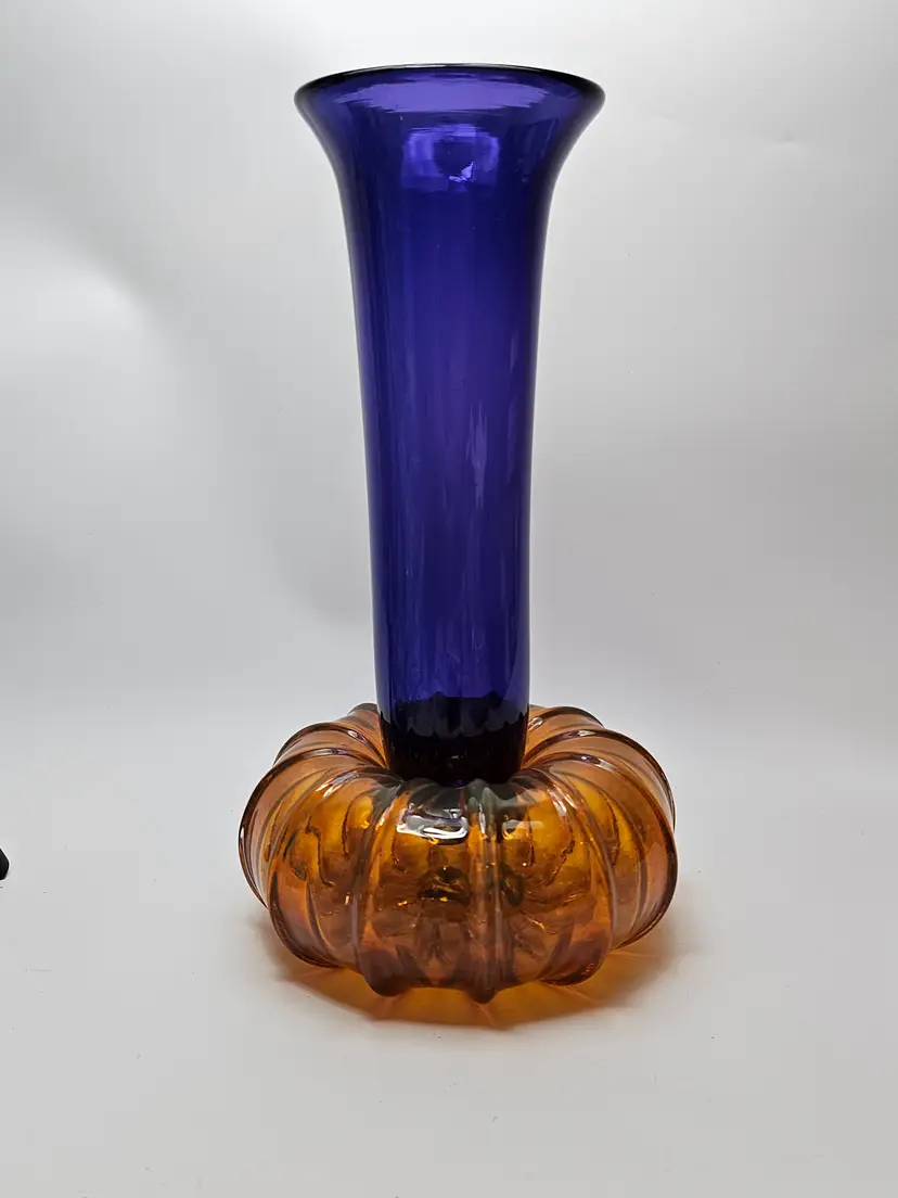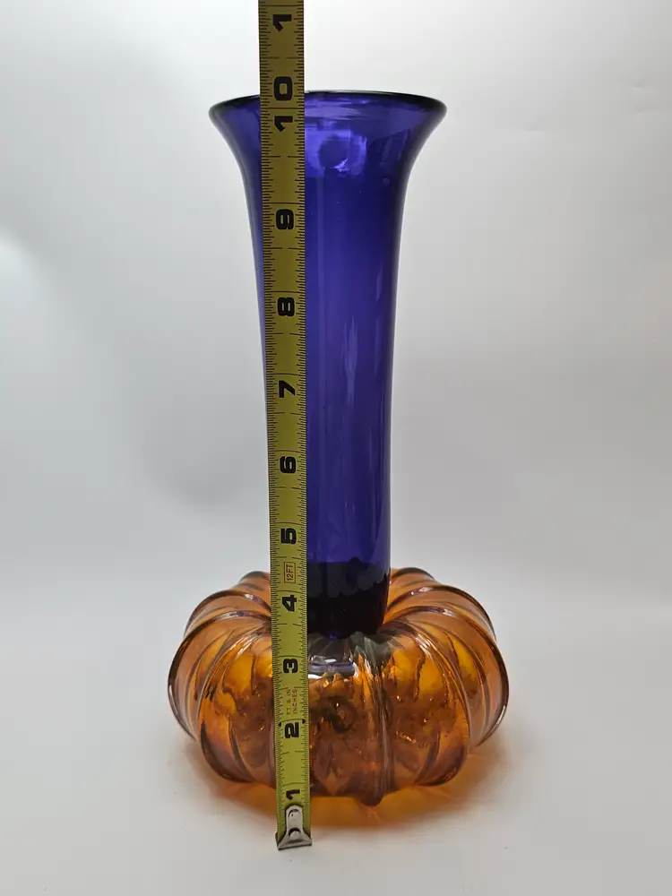 This ArtGlass vase is a unique addition to any collection. The pumpkin base and bulbous shape make it a strange and interesting piece. The vase is made of cobalt glass and has a flared rim. The orange color adds to its charm.