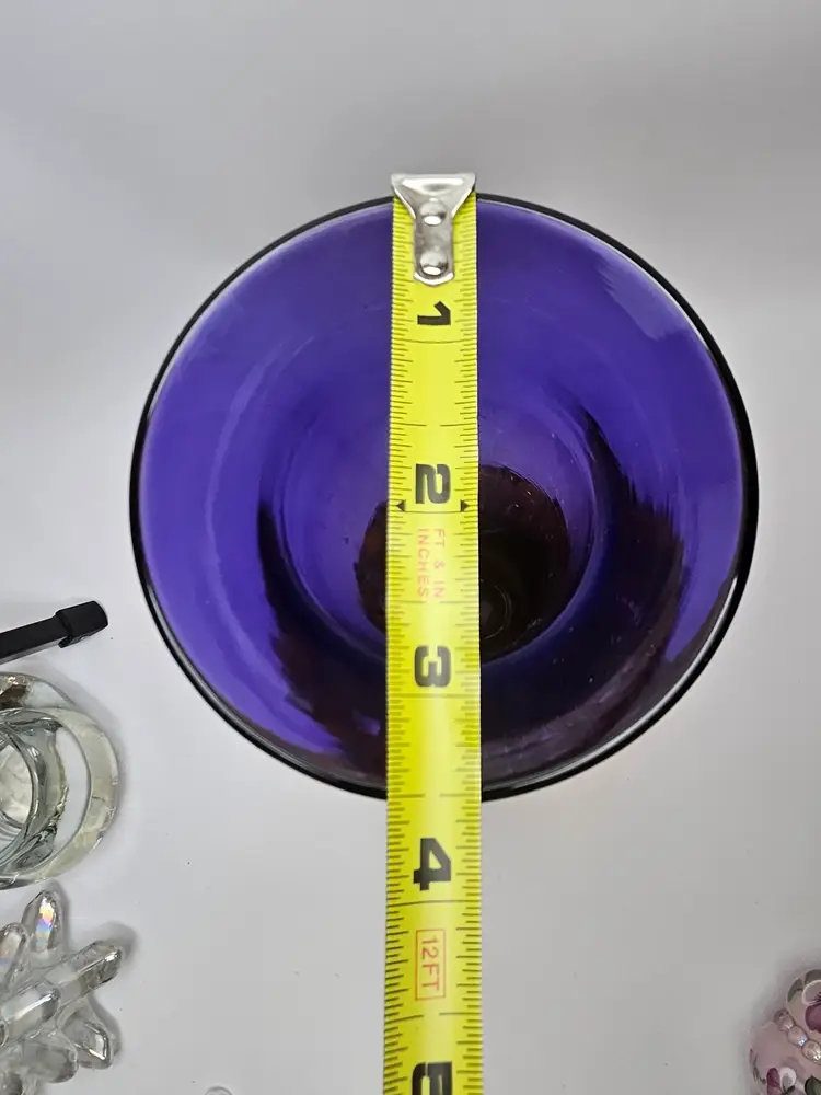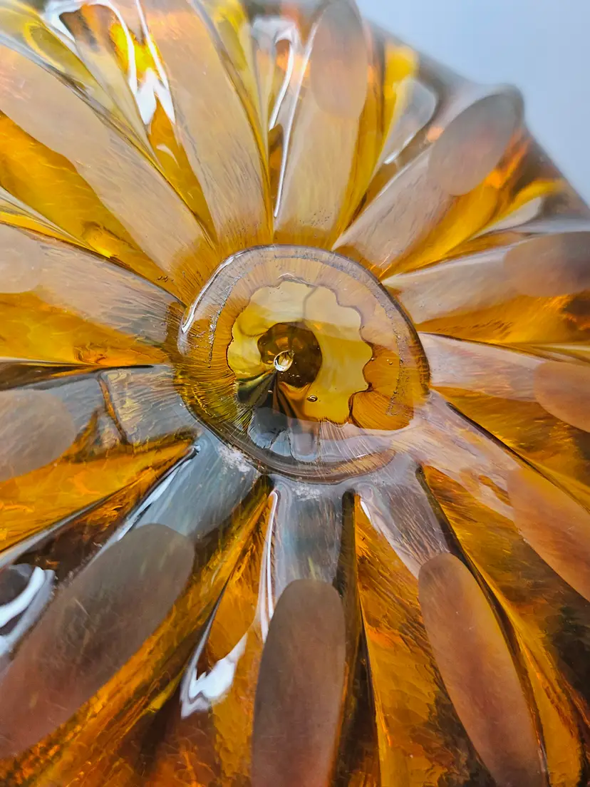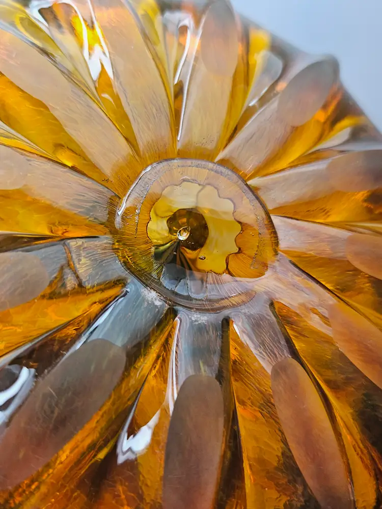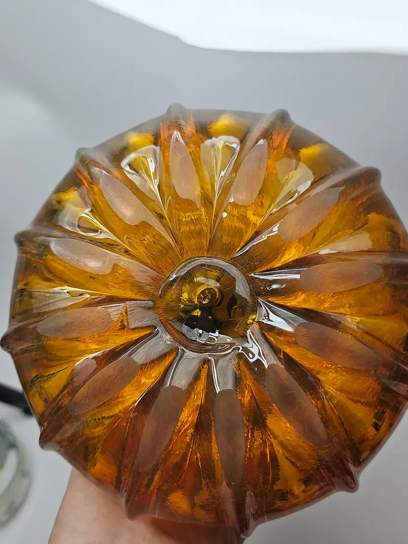 This ArtGlass vase is a unique addition to any collection. The pumpkin base and bulbous shape make it a strange and interesting piece. The vase is made of cobalt glass and has a flared rim. The orange color adds to its charm.