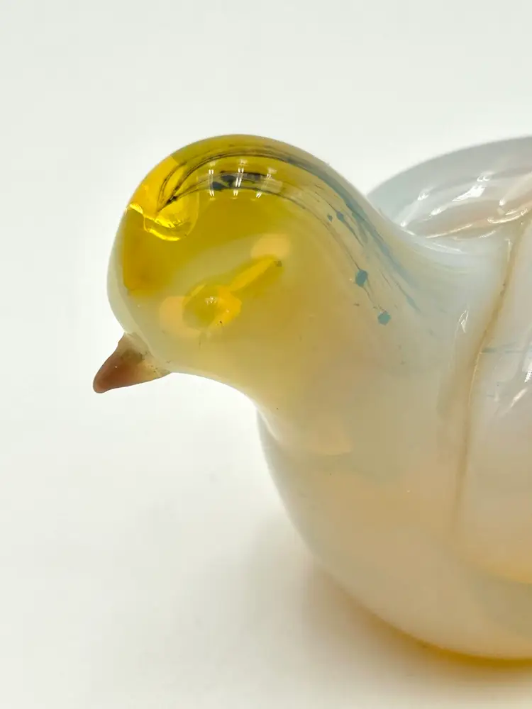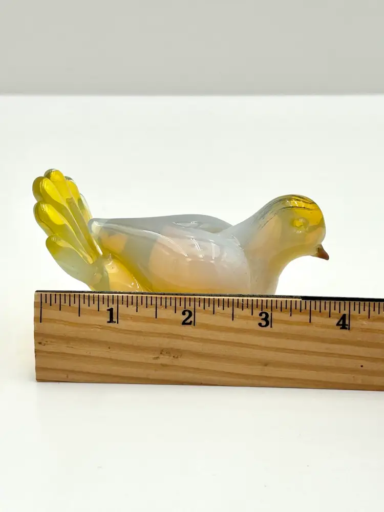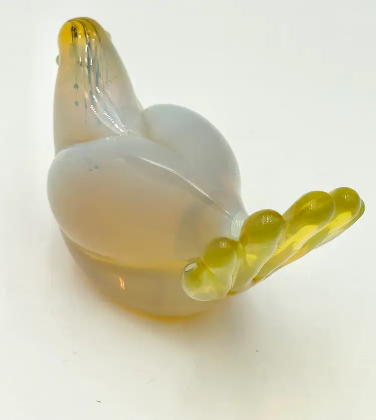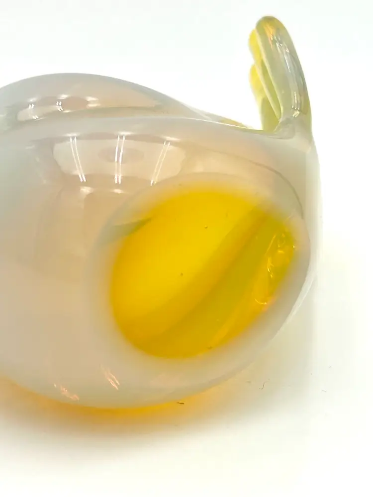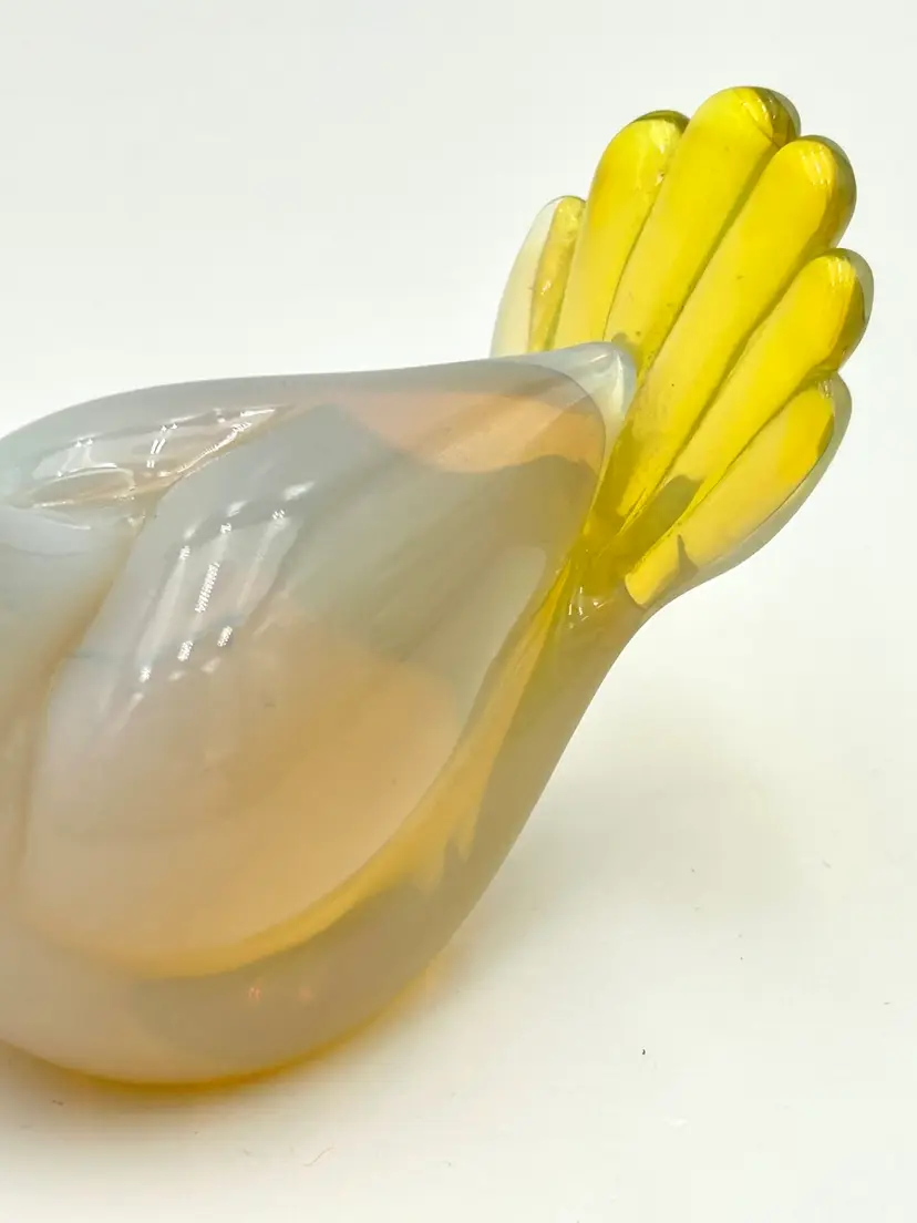 This piece is stunning. It is not signed but it is a quality piece. The bottom is polished flat and clear. The condition is very good with no chips or cracks. About 2.75 inches tall at the tail and 3.75 inches long There are no chips or cracks
