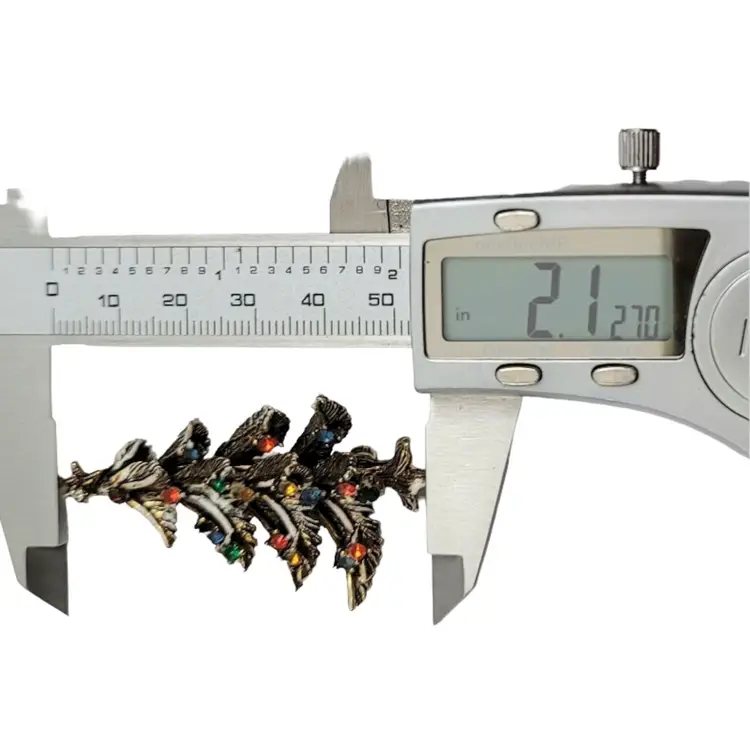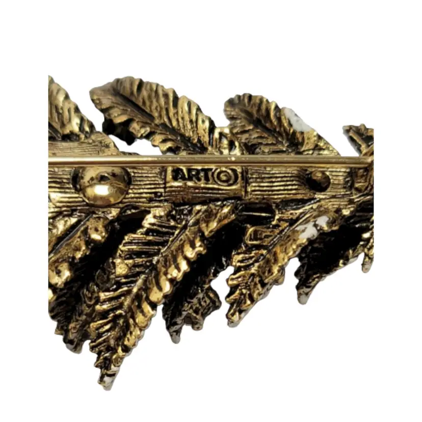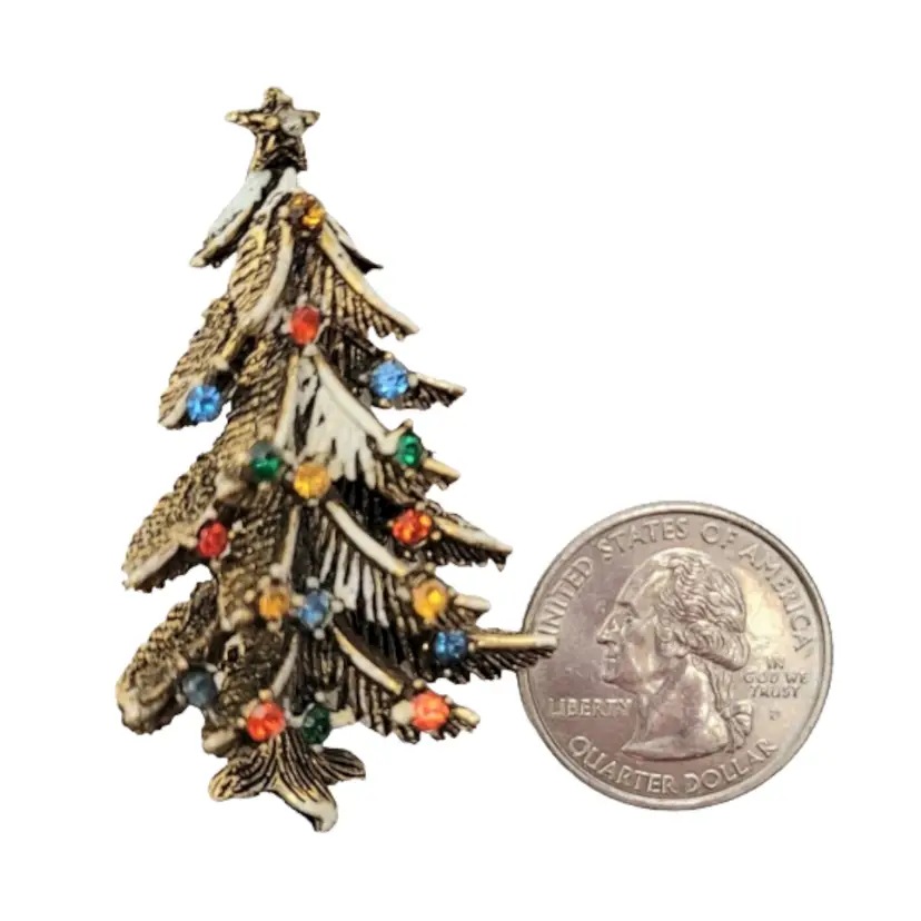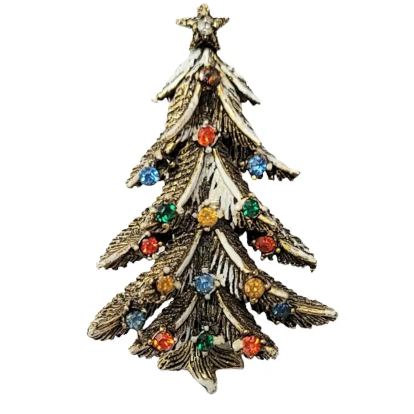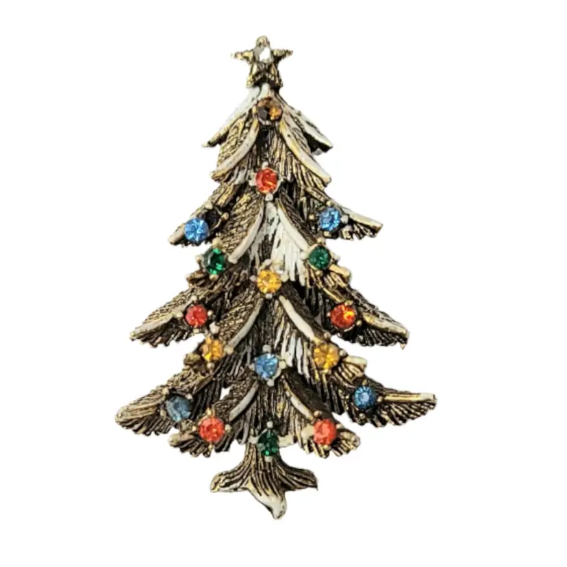 A stunning brooch by ART. This exceptionally pretty Christmas brooch features antique gold tone layered boughs dusted with enamel snow. Orange, blue, green, and gold rhinestones are tucked in as ornaments around the boughs with a clear rhinestone set in the star on top. Signed ART© at the back. Measures approximately 2.1-inches high. This brooch would be a unique addition to your holiday wardrobe.