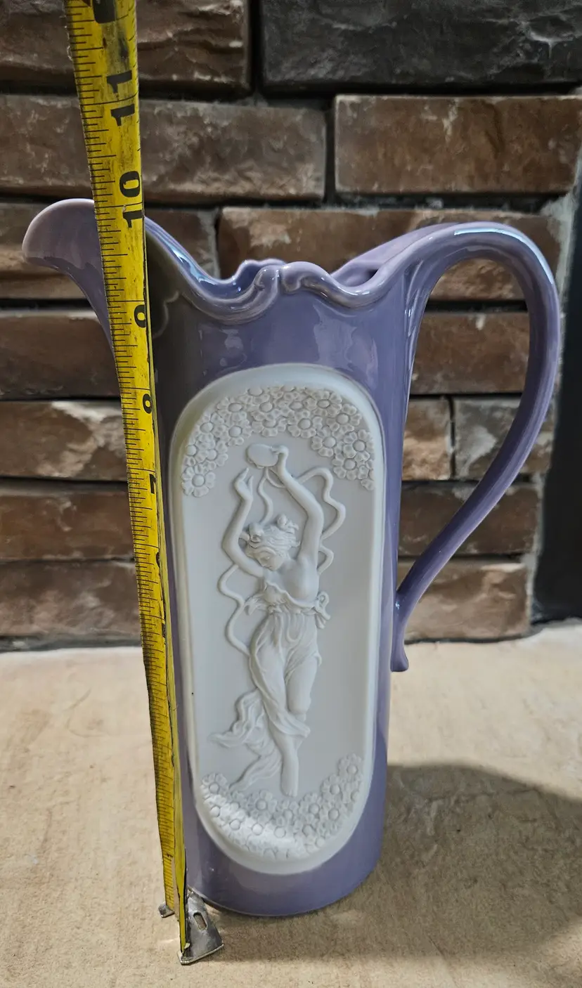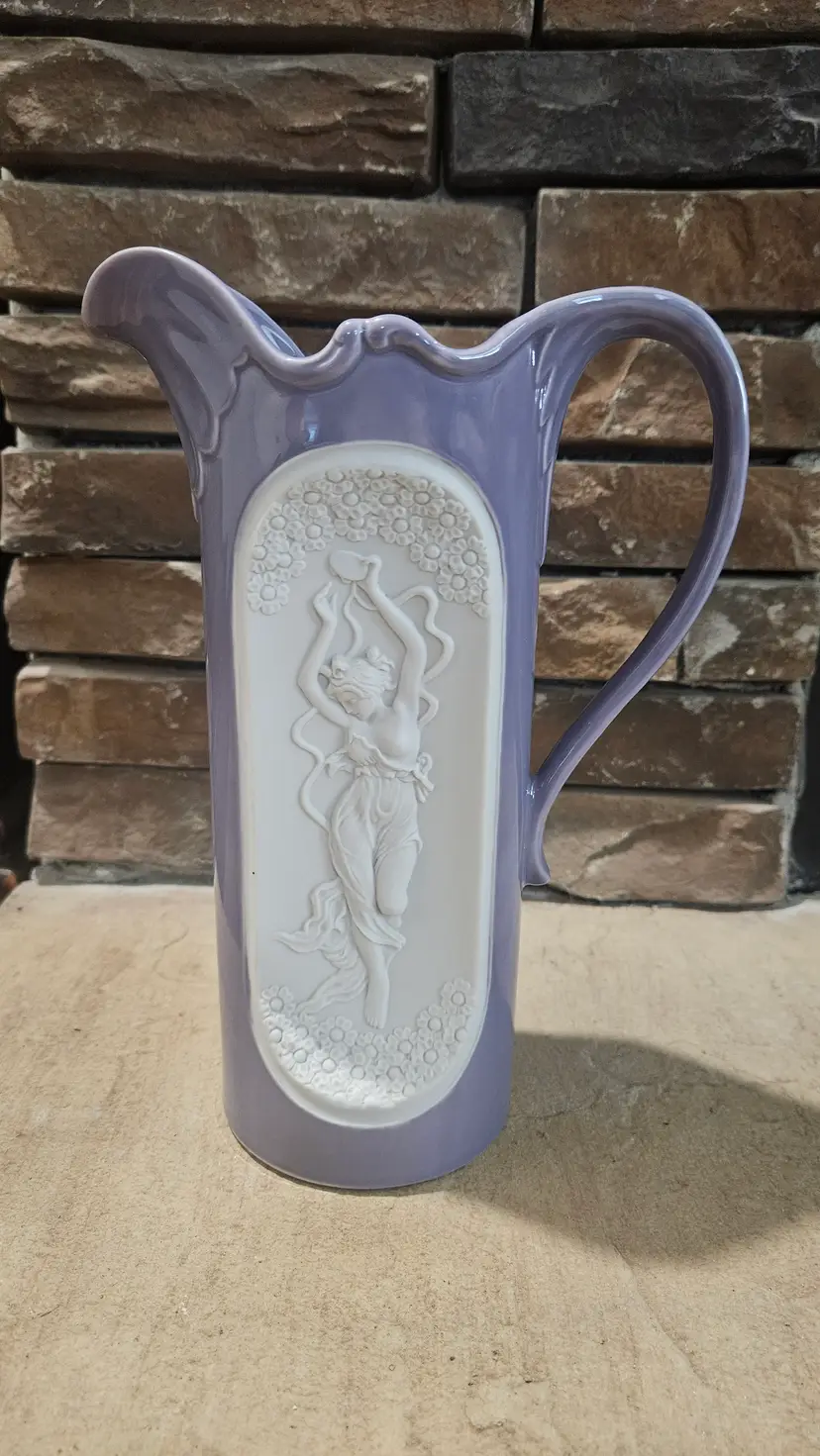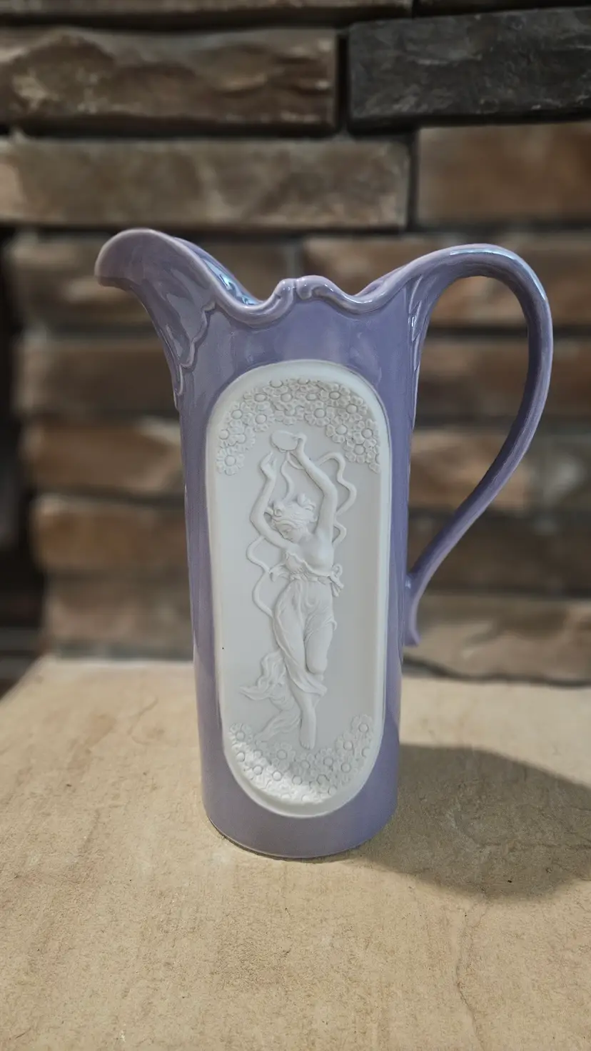 Art Nouveau Pitcher made by Setco Craft(makers sticker on the bottom). According to my online research, it was made in Japan. It stands approximately 10" tall, the opening is approximately 5" wide and the base is approximately 3 3/4" wide. There is a small dark dot seen on the outer edge of the cameo and appears to be a makers flaw. This Pitcher is in Good, Pre-owned condition, showing minimal to no wear from age or previous use. There are no breaks, no cracks, no chips. See all photos of details