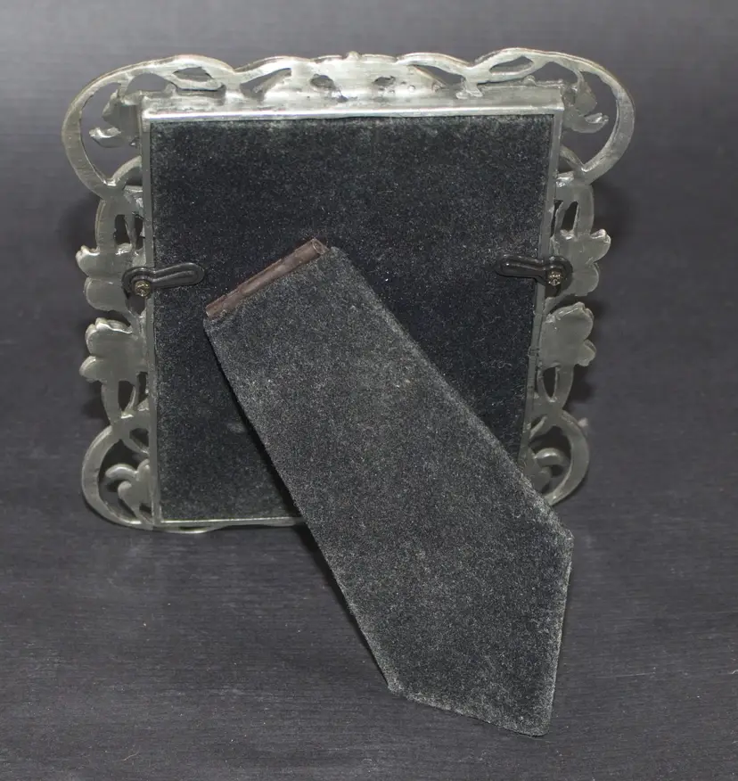 Art Nouveau Silver Tone Iris Picture Frame 2.75" x 4.5" Photo Metal. In good condition. 4.25" wide x 5.25" tall. Full disclosure: picture in frame is not vintage. I printed it out. Back is black velvet. Does have clear glass in frame.