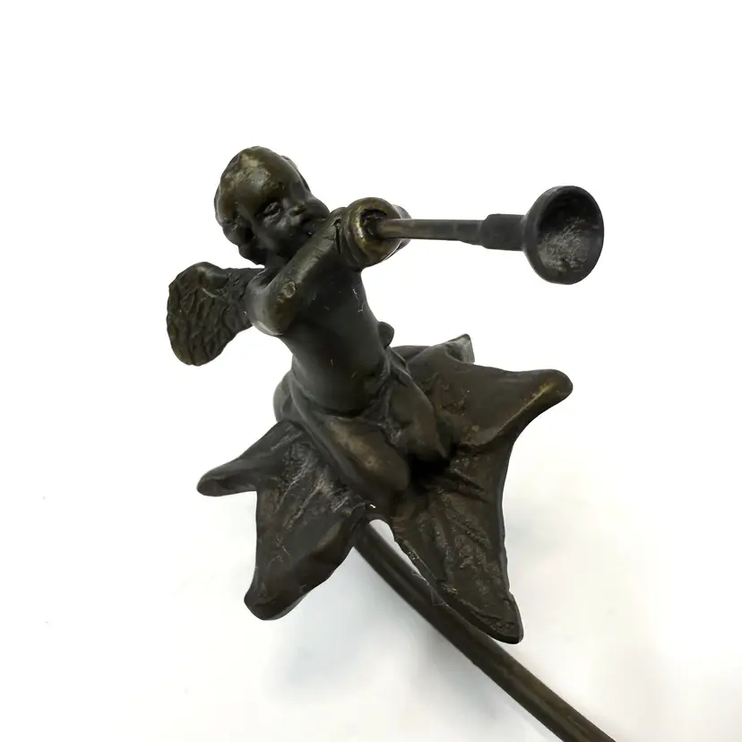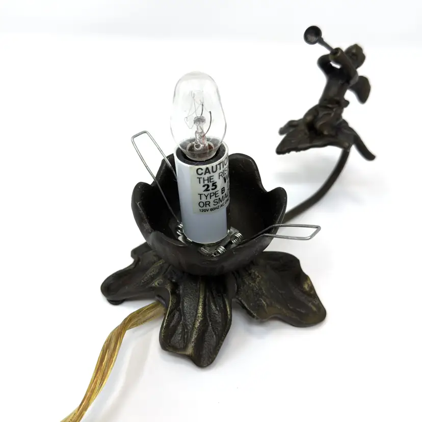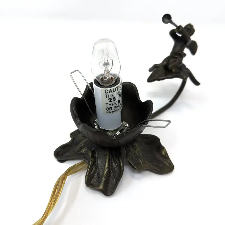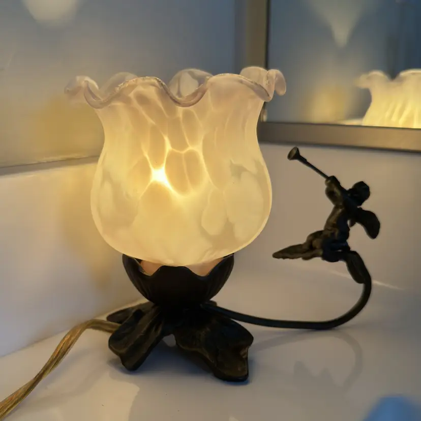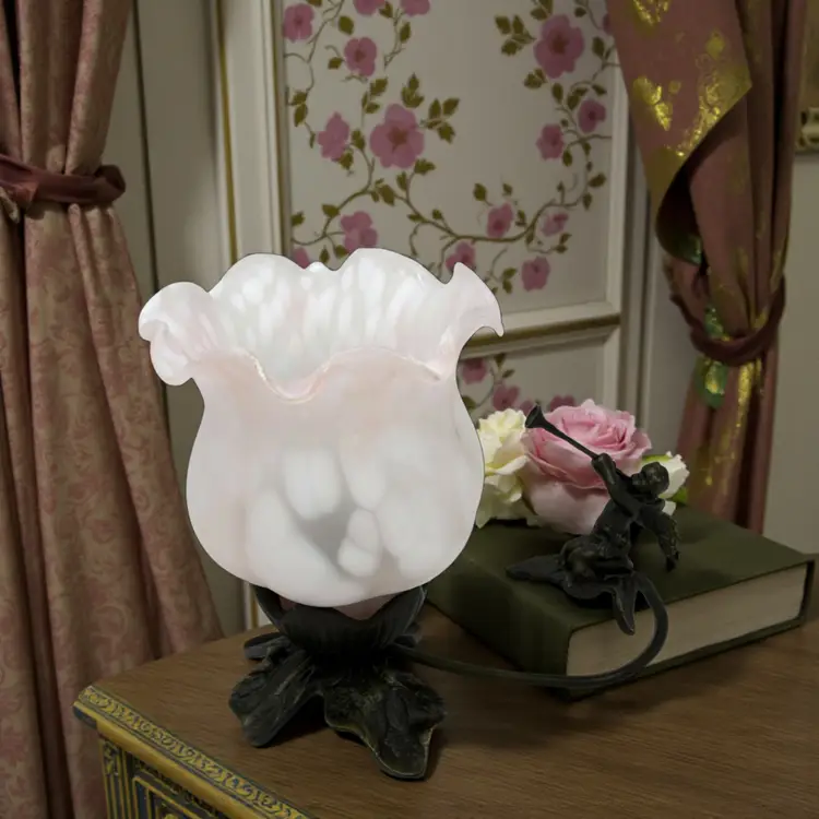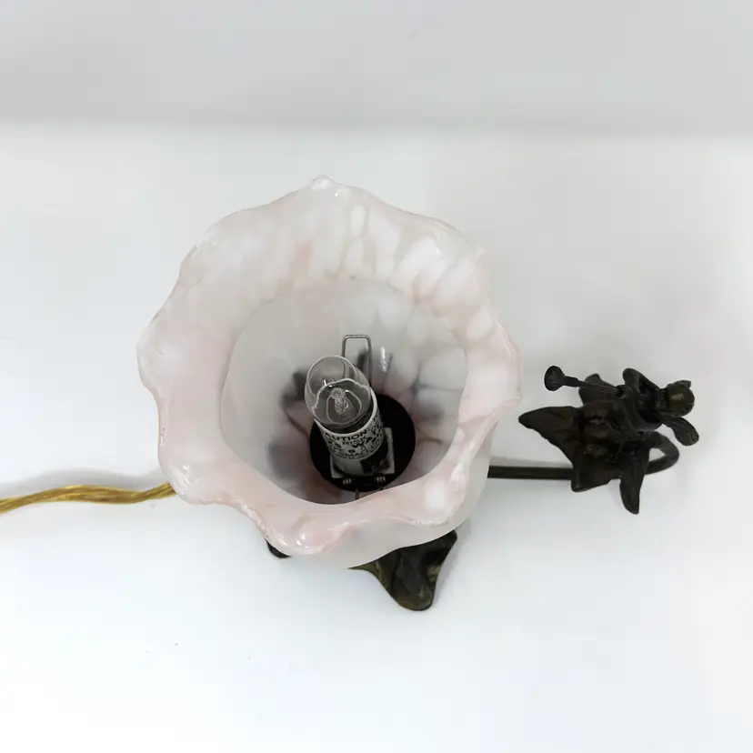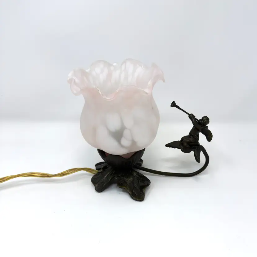 Add a touch of vintage romance to your space with this Art Nouveau-style accent lamp. Featuring a ruffled tulip glass shade in soft opalescent pink and white, this piece is beautifully detailed with a winged cherub blowing a trumpet, perched on a sculpted leaf base. The organic curves and nature-inspired elements make it a perfect fit for romantic, Victorian, or French country interiors. From late 1990s.