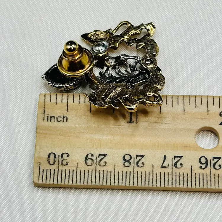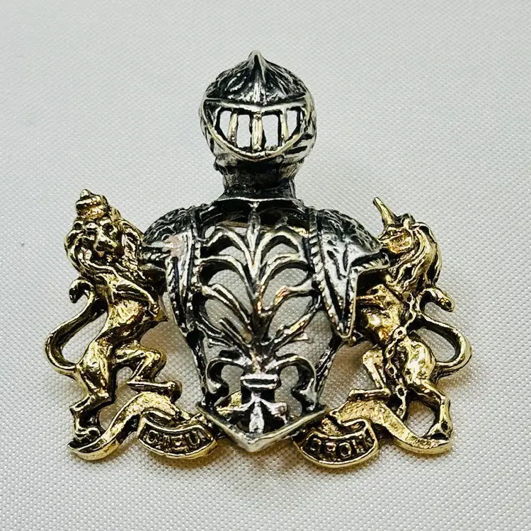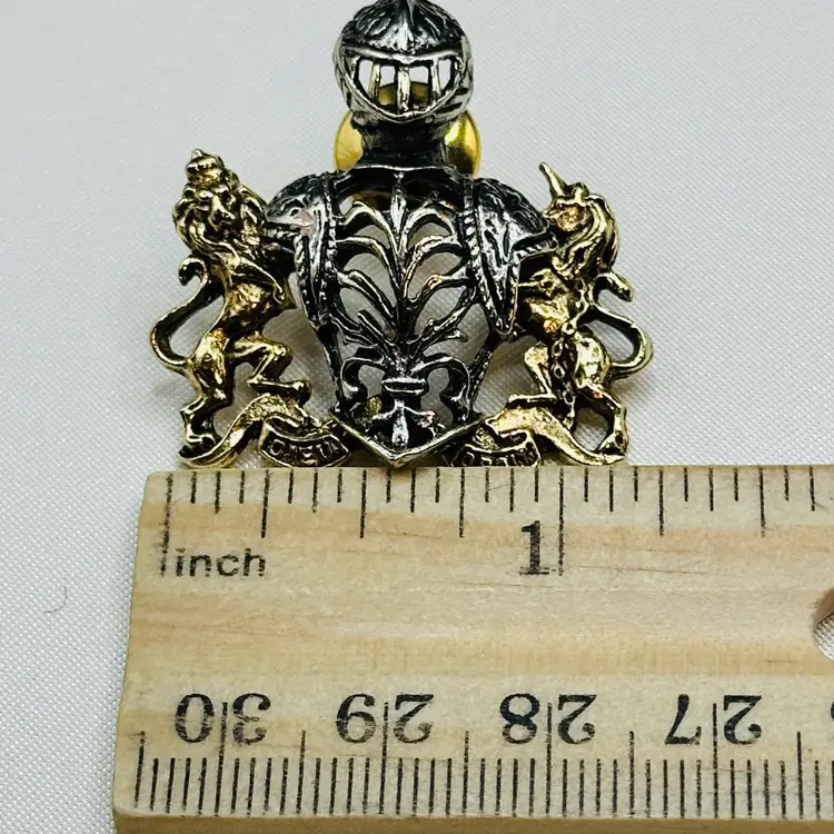 Vintage pin stamped ART, gold-tone and silver-tone. Knight amour with crowned lion and unicorn with motto of DIEU DROIT. Pin is 1.25” by 1.25”. Includes secure pin back.