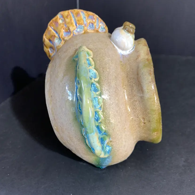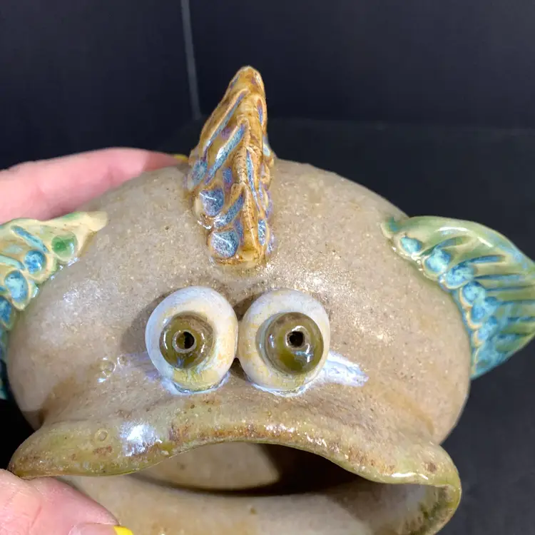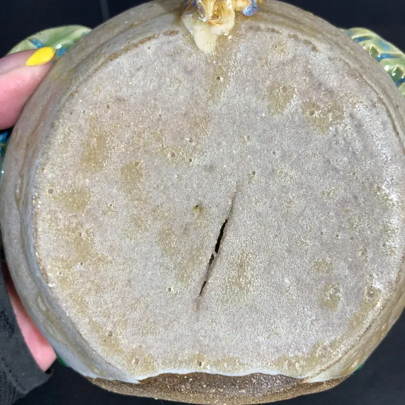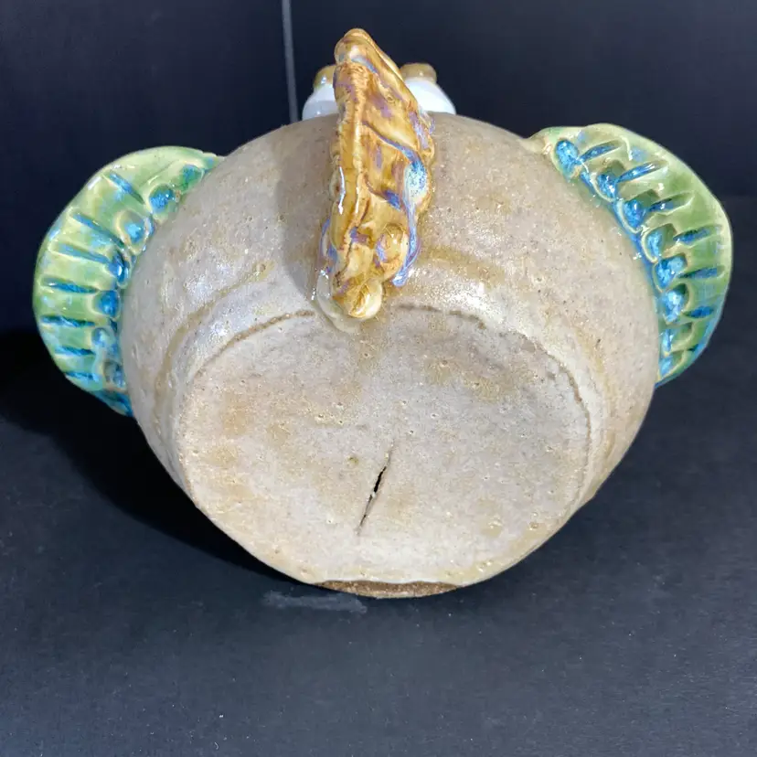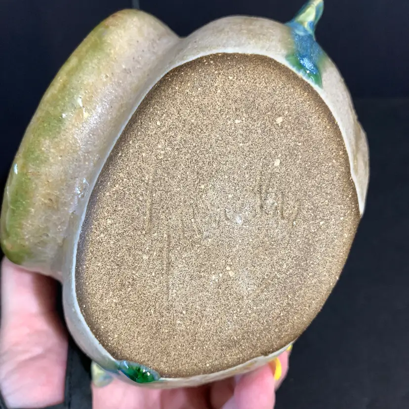 This is so funny! Signed Sandy. No chips but there is a crack on the back. Measures 6 1/2 inches across, 3 3/4 inches wide and 5 1/2 inches tall. Weighs 24 ounces. If the actual postage ends up being less than what you paid, you will be refunded for anything over one dollar.