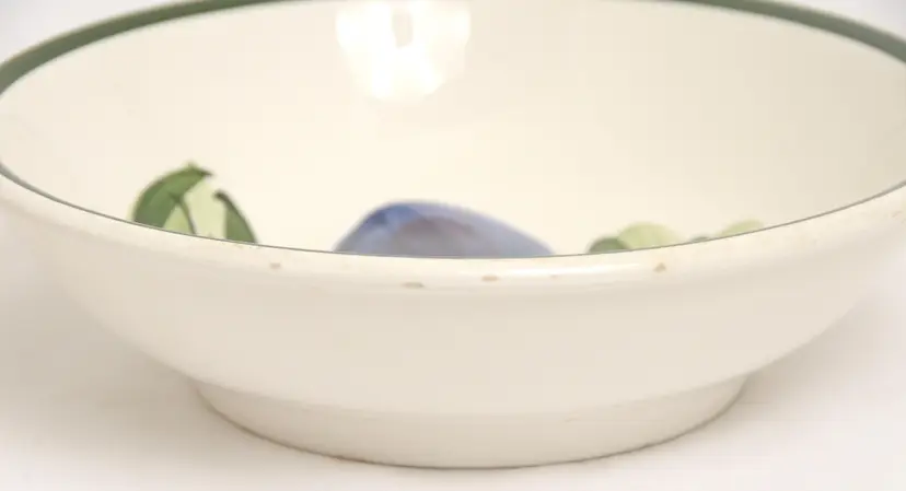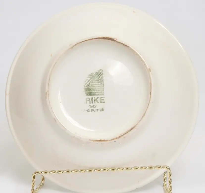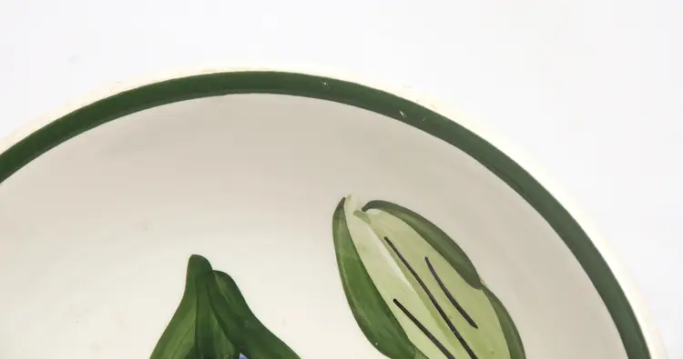 This art pottery bowl from Zrike has a design of eggplant and leaves in the base. It was hand-painted in Italy.