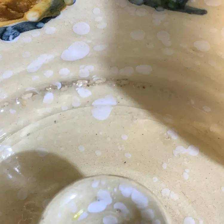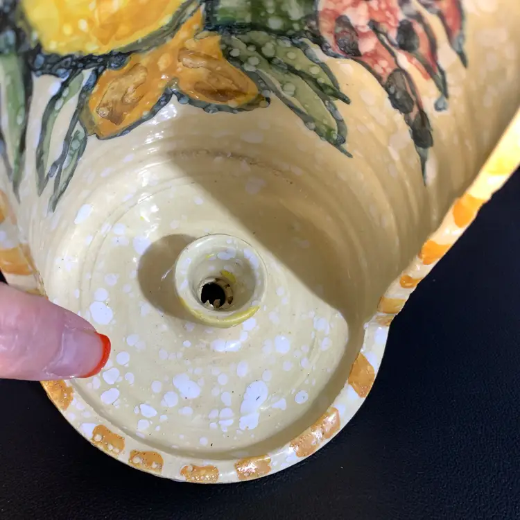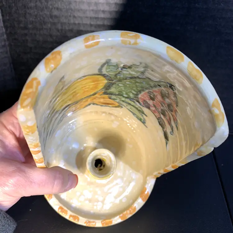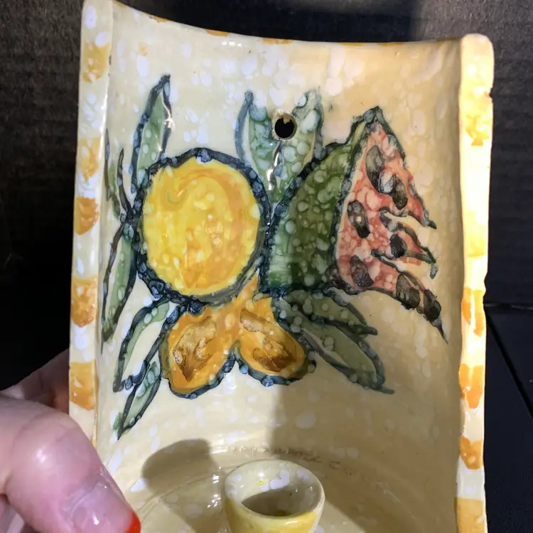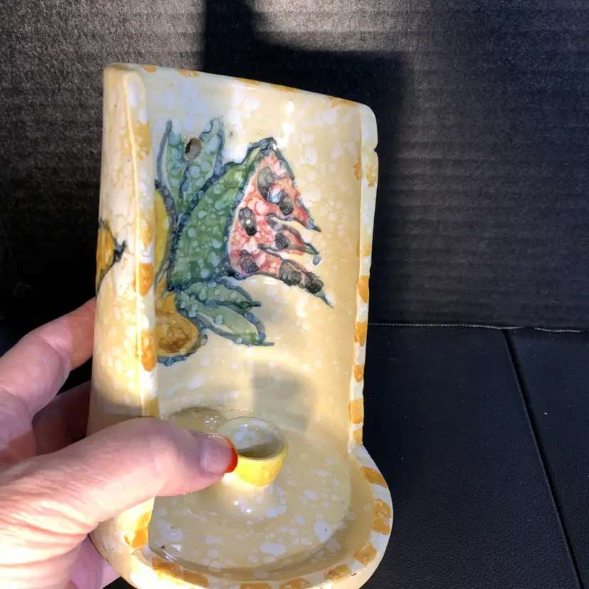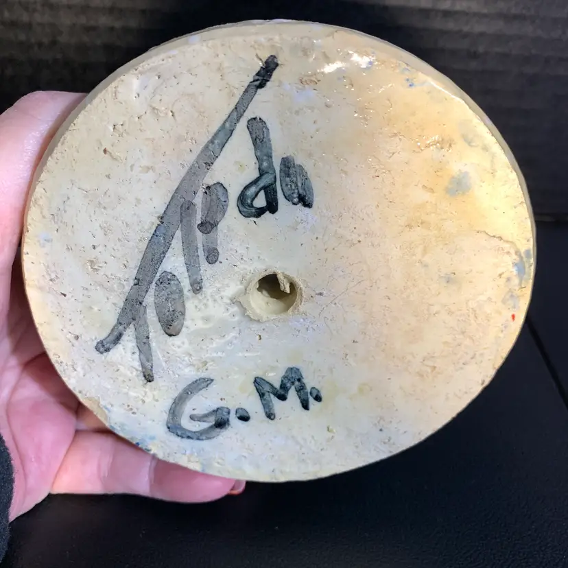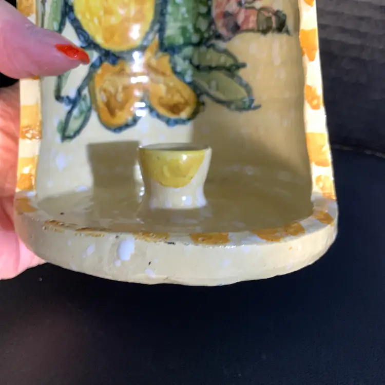 This is in great condition. No chips or cracks. There is a dark spot on the inside that I included a photo of. But it looks like it is under the glaze to me. Measures 4 5/8 inches wide and 6 inches tall. Weighs 15 ounces. If the actual postage ends up being less than what you paid, you will be refunded for anything over one dollar.